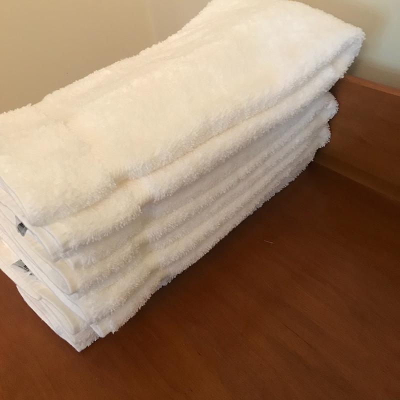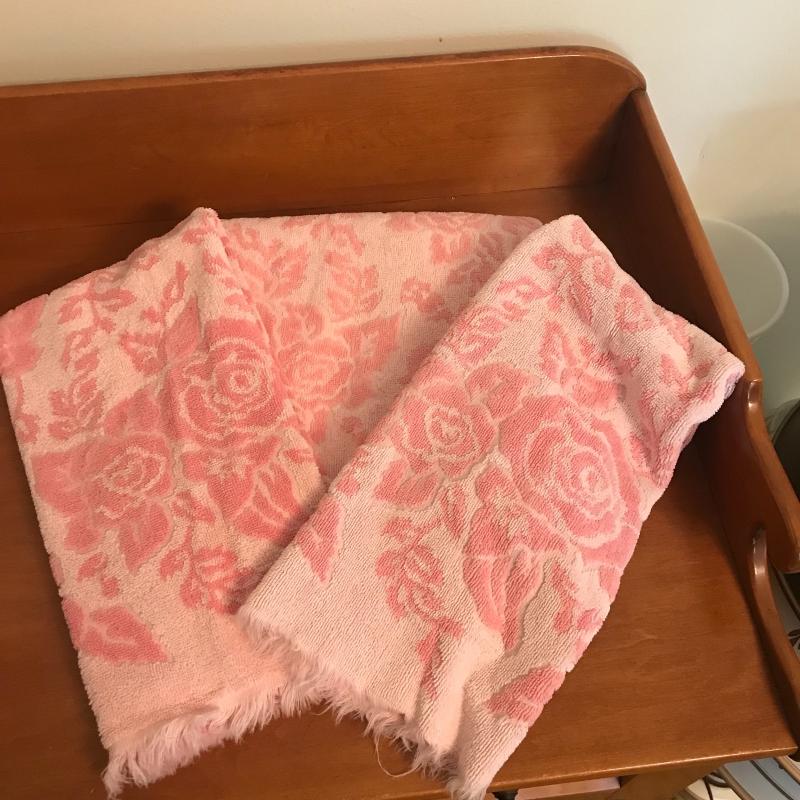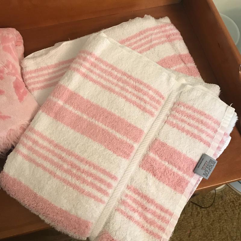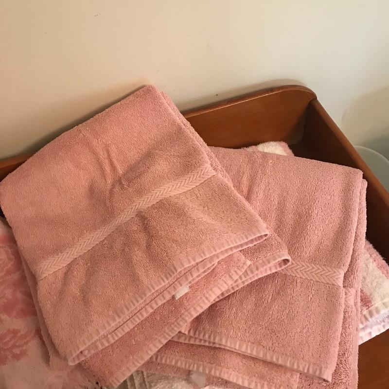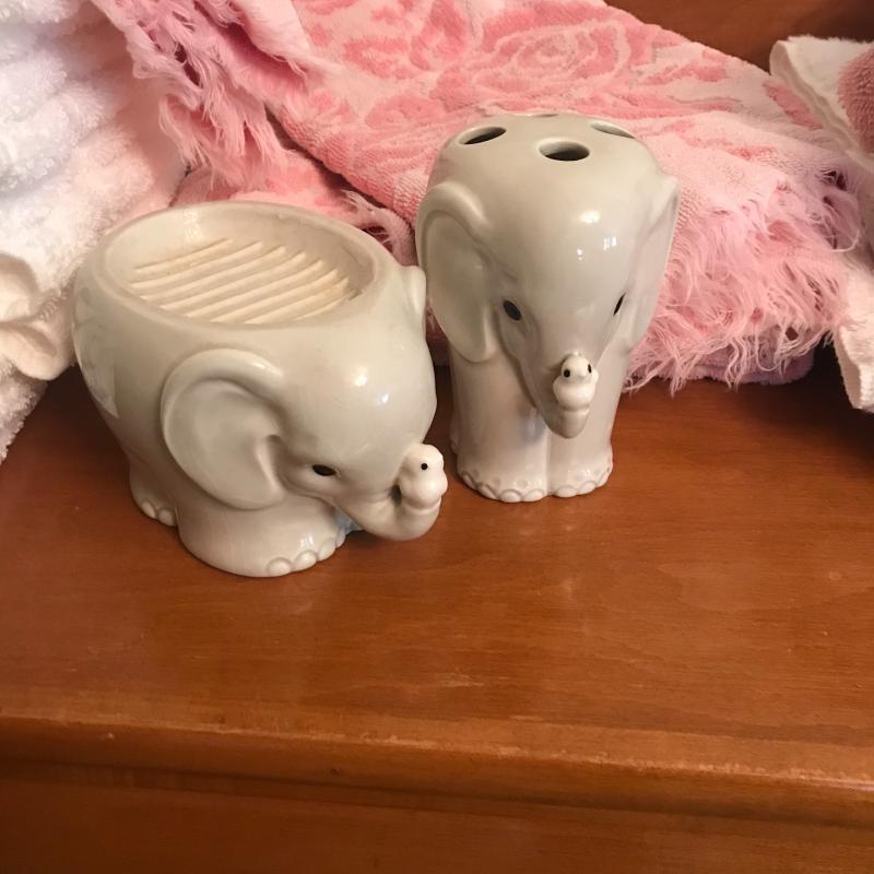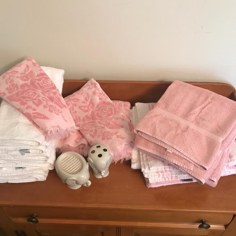 Three different sets of towels. Two are worn and more vintage. One set are all white hand towels, like new. Cute ceramic elephant soap dish and toothbrush holder. Local pick up only.