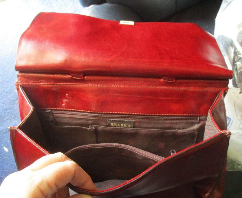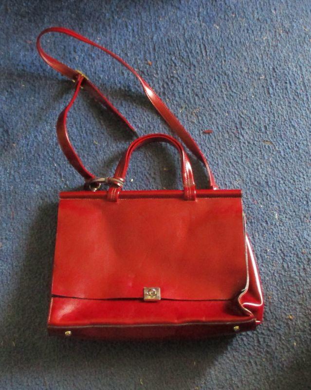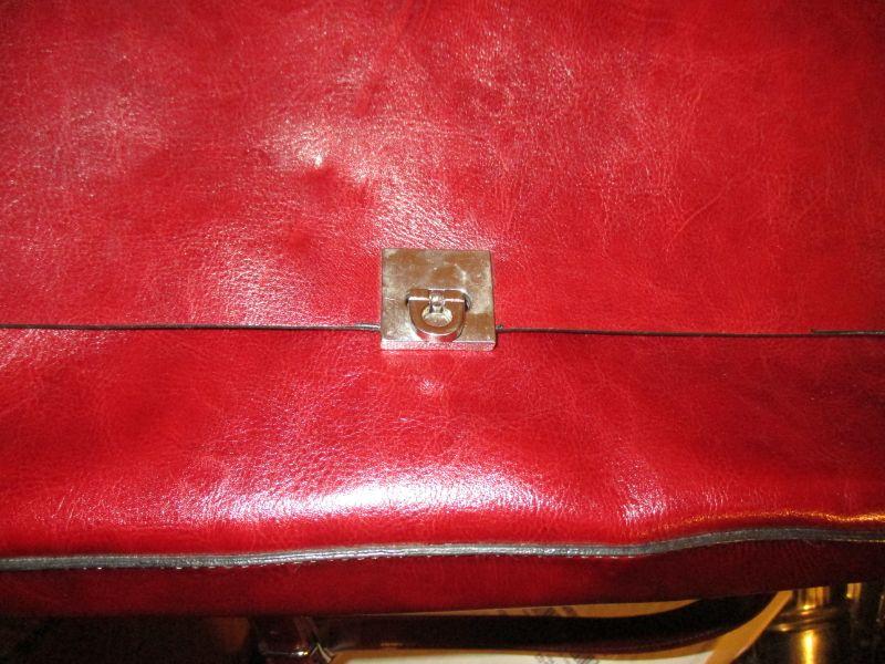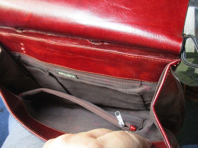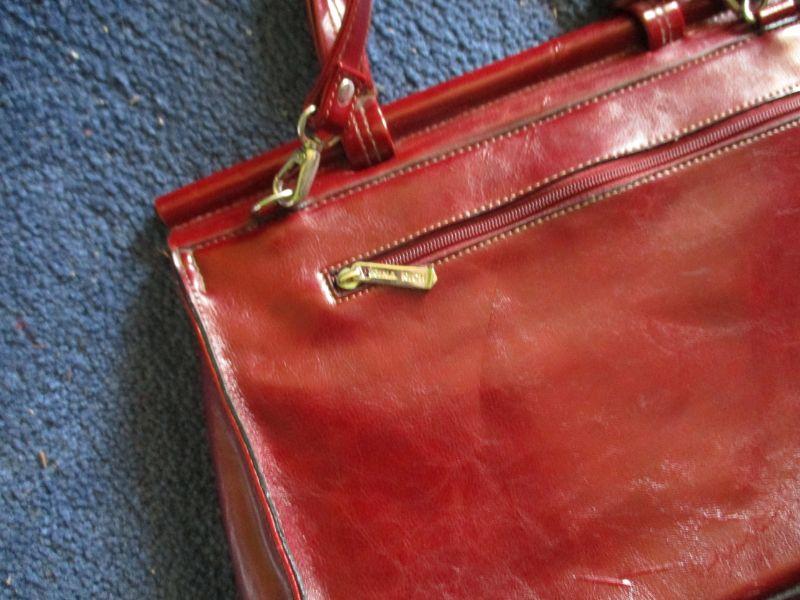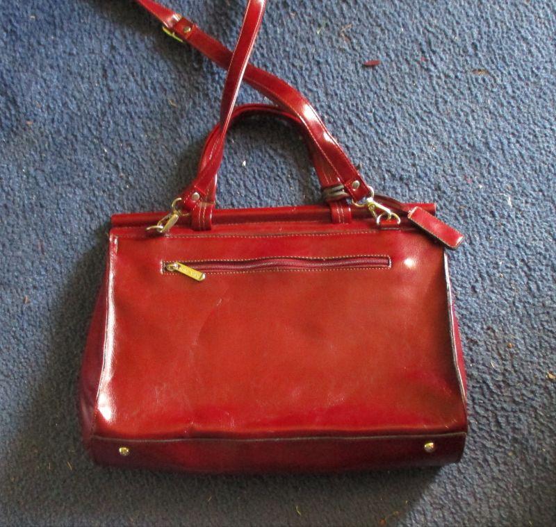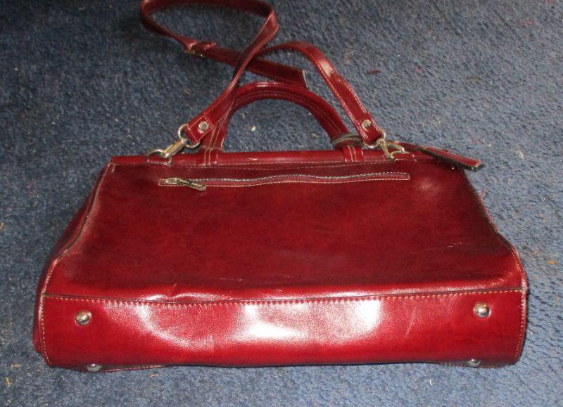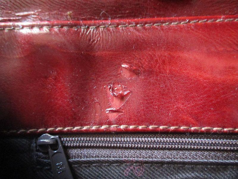 This purse only has one flaw on the inside (I took a close up), otherwise, it looks brand new. It is a deep red and has a removable strap.