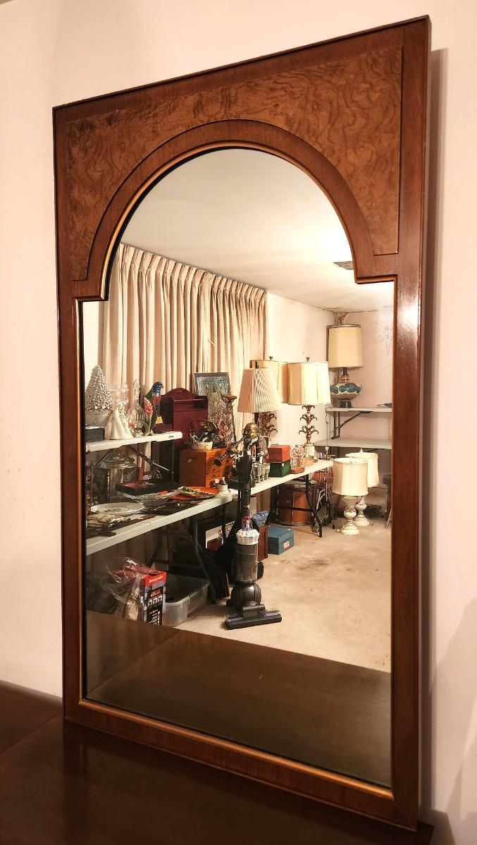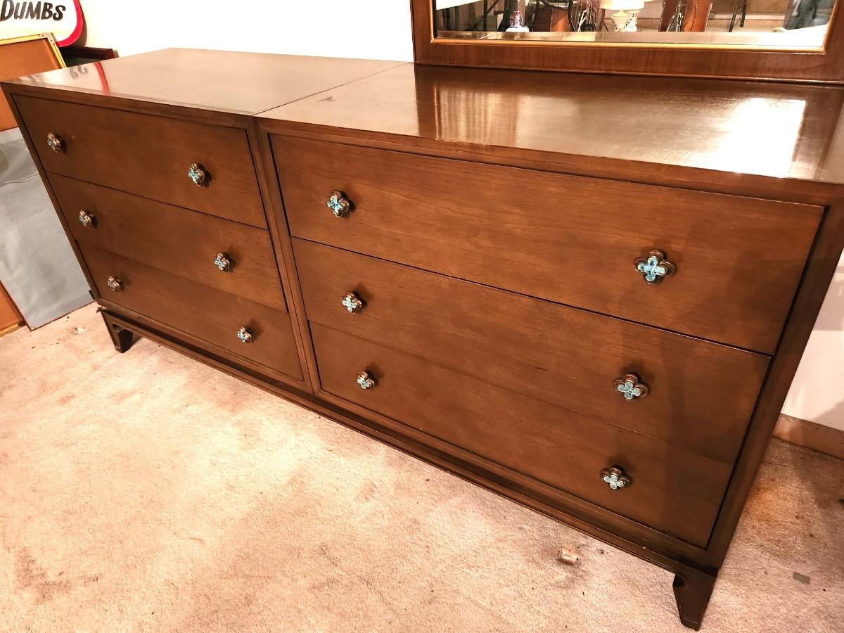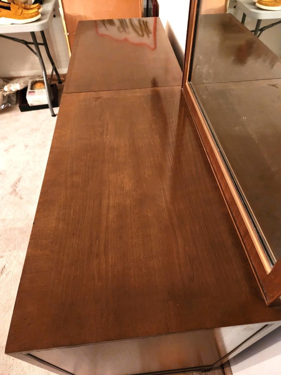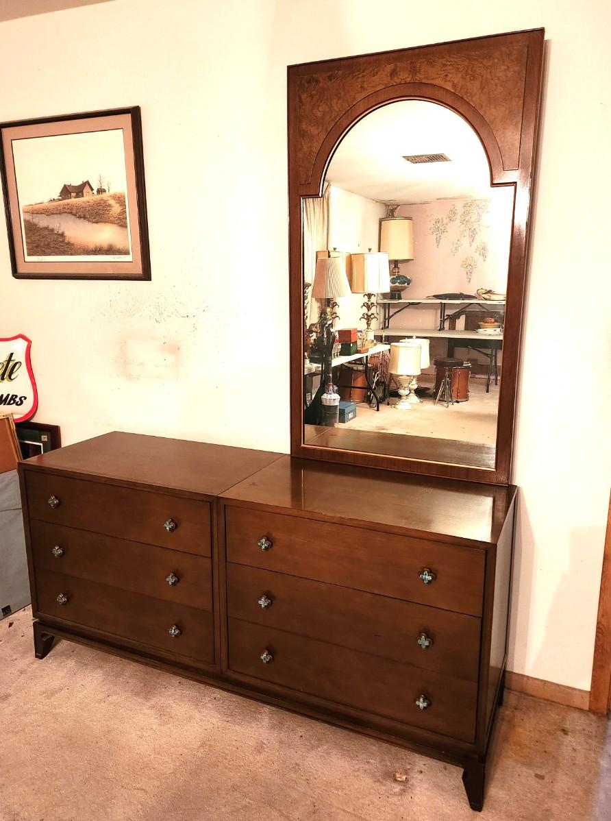 Mid-Century Modern Bedroom dresser by fine furniture maker Romweber - matches many of the other pieces in the house. 6 drawers, removeable mirror. Bottom is one piece. 66.25" long, 19.5" deep, 84" tall w/mirror. Top in good condition.