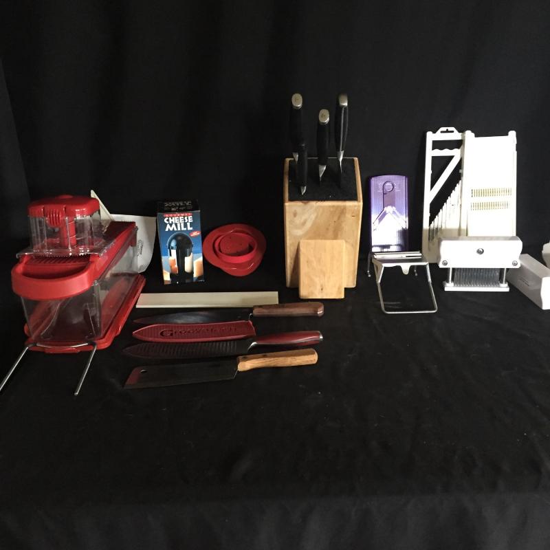 Slice and Dice Lot. Deni Meat Tenderizer,Knives,Knife Holder,Dicer Plus and More.