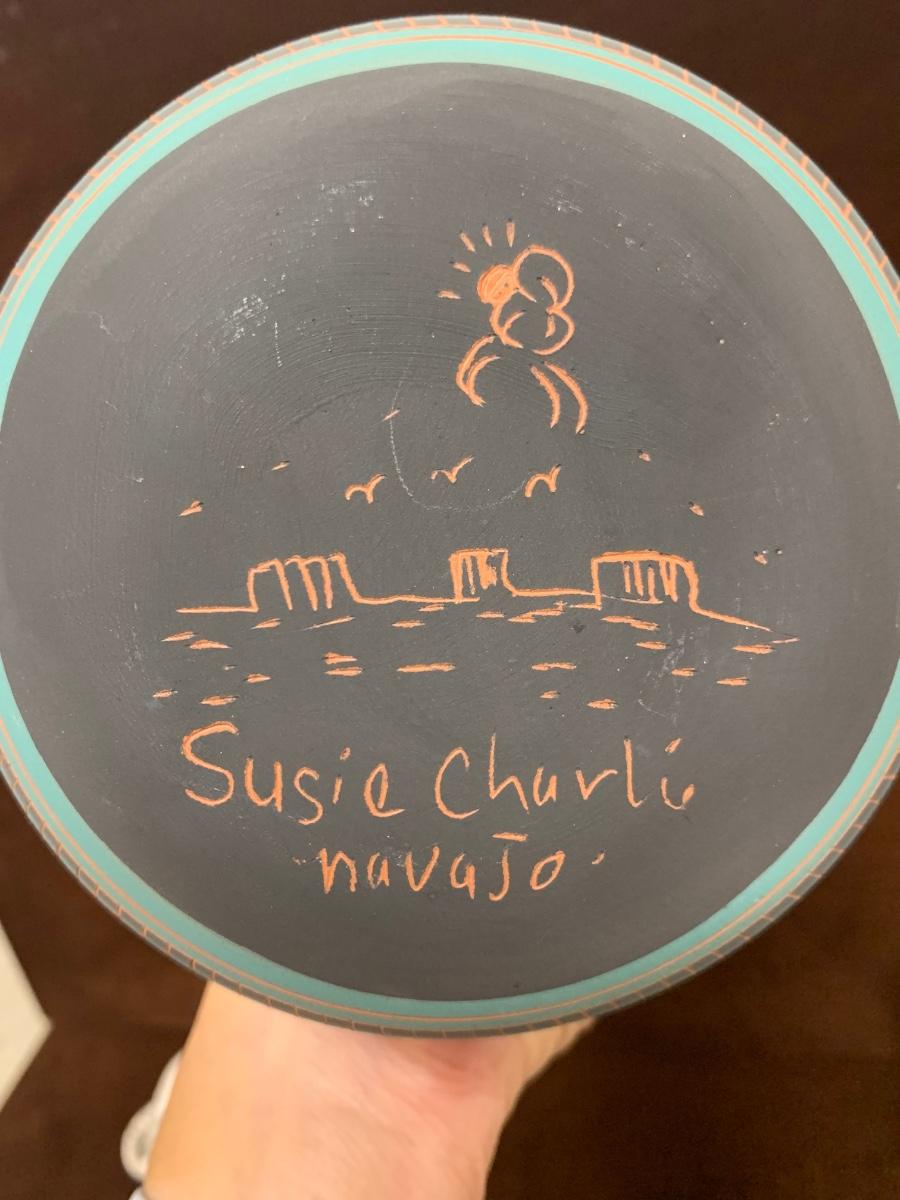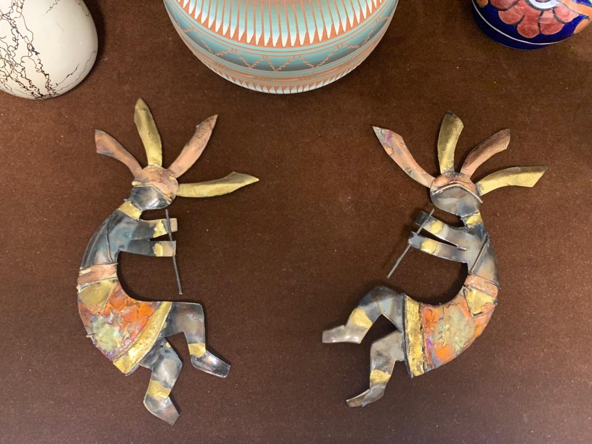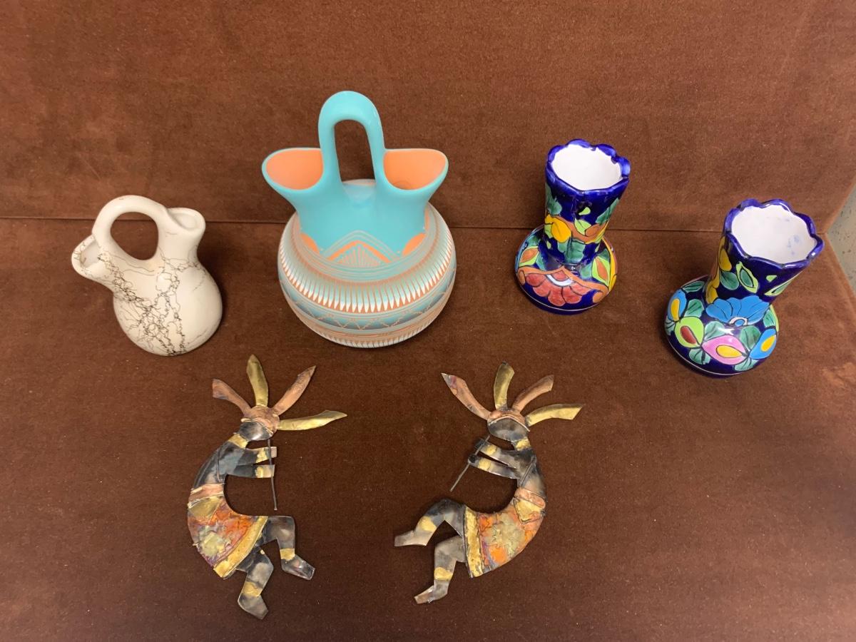 IThe large wedding vase is by Susie Charlie. Lot includes a pair of hand-painted ceramic vases from Mexico, two wedding vases -- The blue one is by Susie Charlie (8" tall), pair of metal wall hangings depicting Hopi dancers