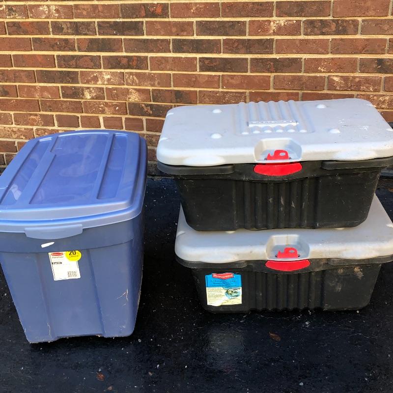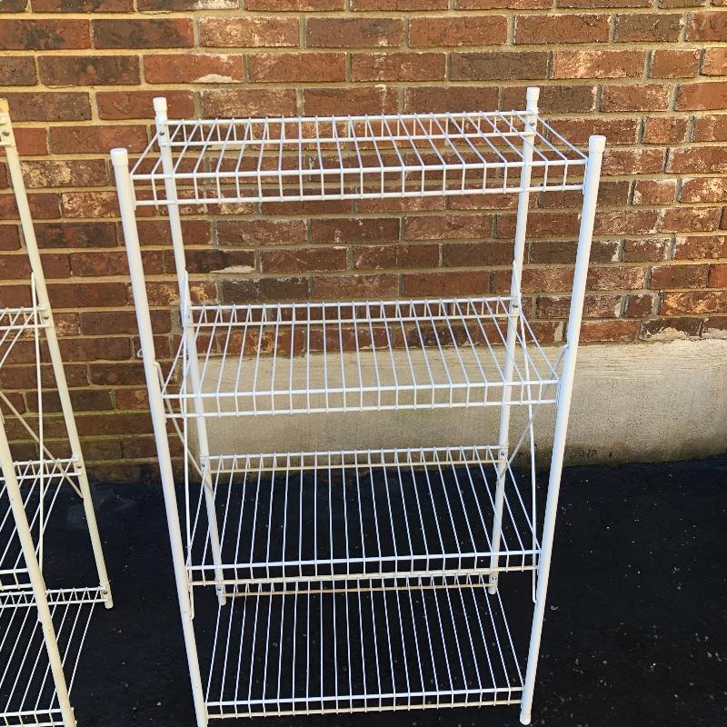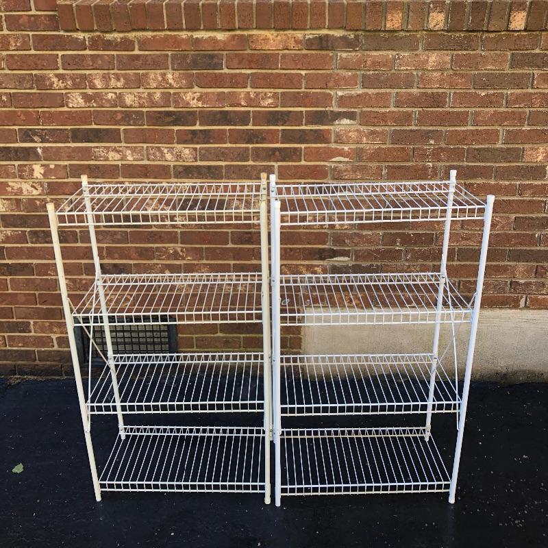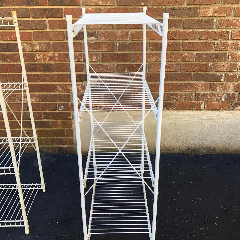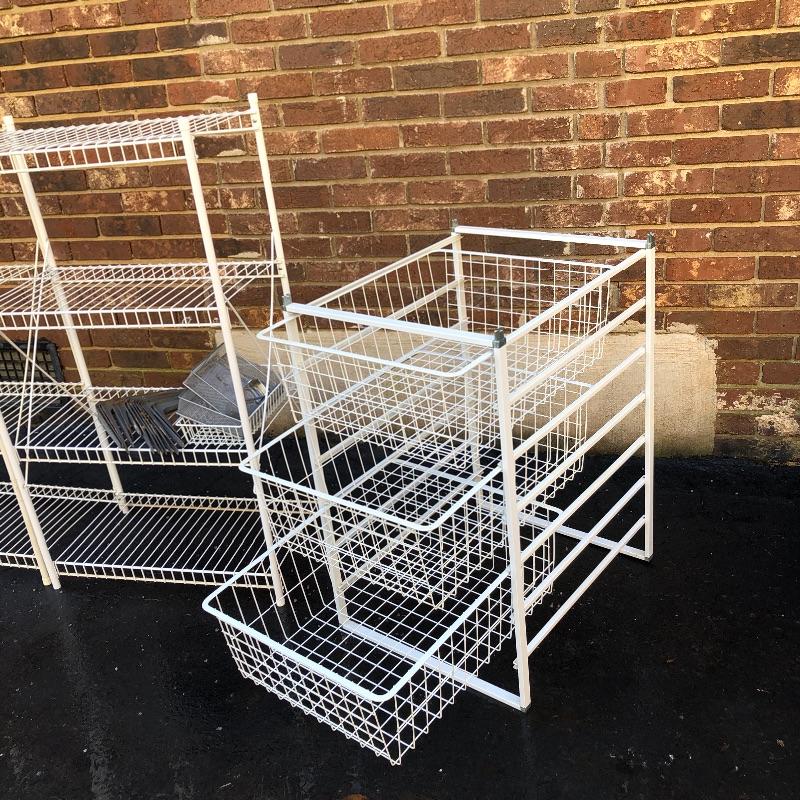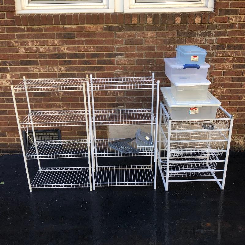 This lot contains miscellaneous storage items, including two identical white metal shelves (23.5” x 13” x 42”), a smaller white metal pull-out shelf (21.5 x 18 x 28”), as well as four small plastic storage bins of varying sizes. Along with the white shelves, this lot comes with three large Rubbermaid bins. Lastly it comes with three small metal storage caddies and about a dozen metal shelf brackets. Local pickup only.