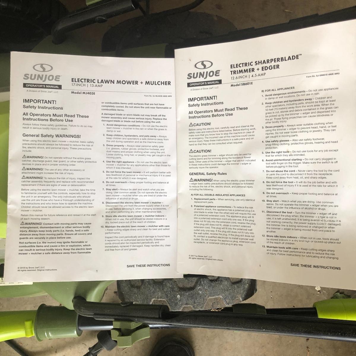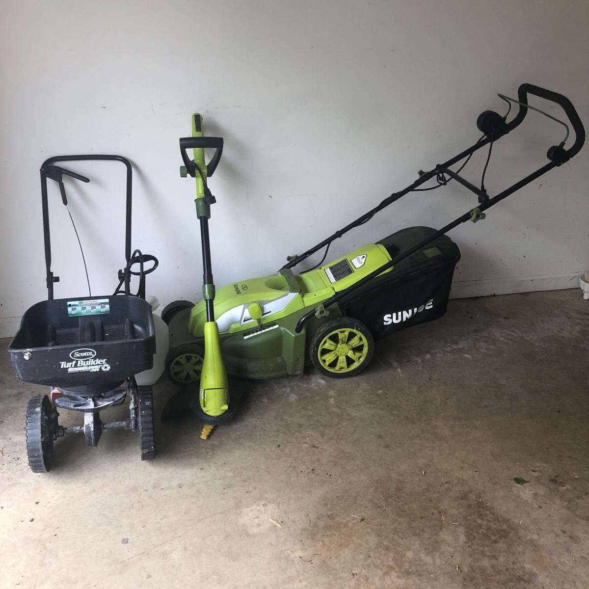 Keep your lawn neat and tidy with this selection of equipment. Lot includes Sunjoe electric mower and trimmer, Scott’s spreader and a one gallon sprayer. Mower, trimmer and spreader worked when tested, sprayer was not tested.