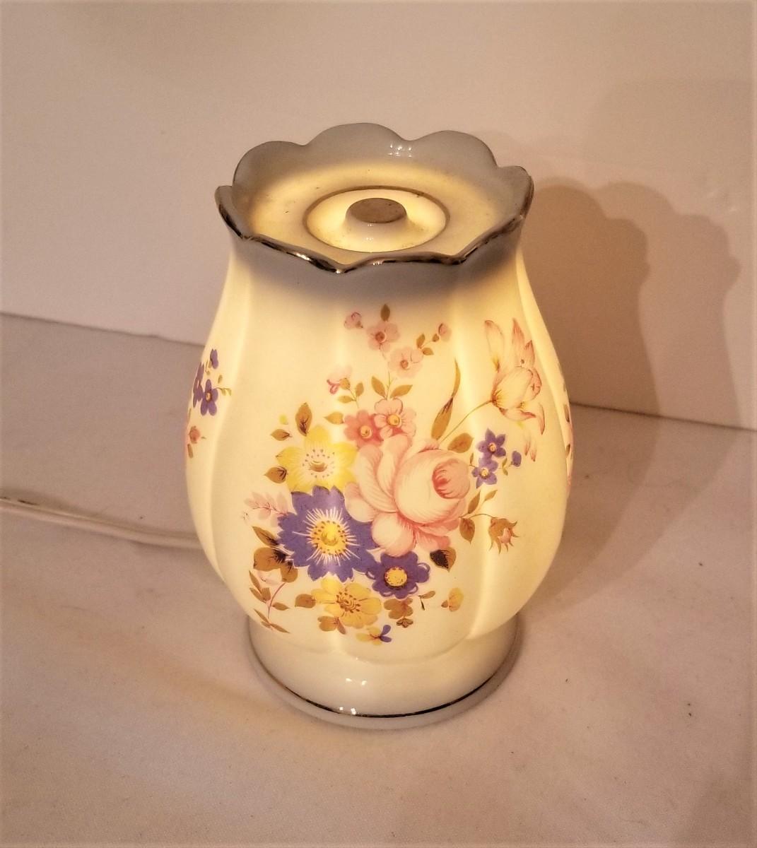 These were very popular in the 50's and 60's - china perfume lamps - put a drop of fragrance in the top well and let the warmth from the light bulb diffuse it throughout the room. Also used as a nightlight. This one is in good working condition.