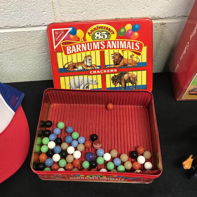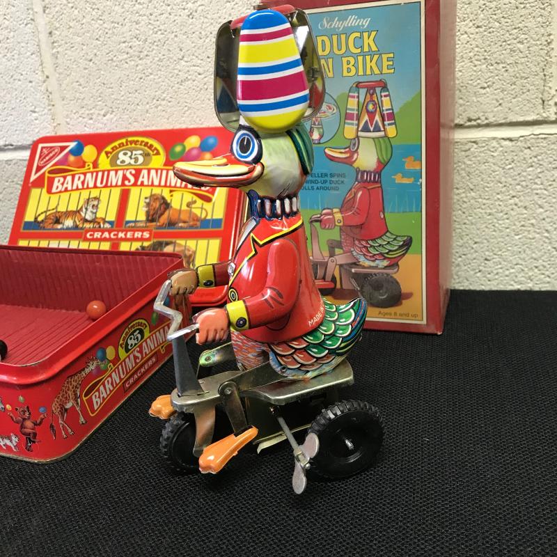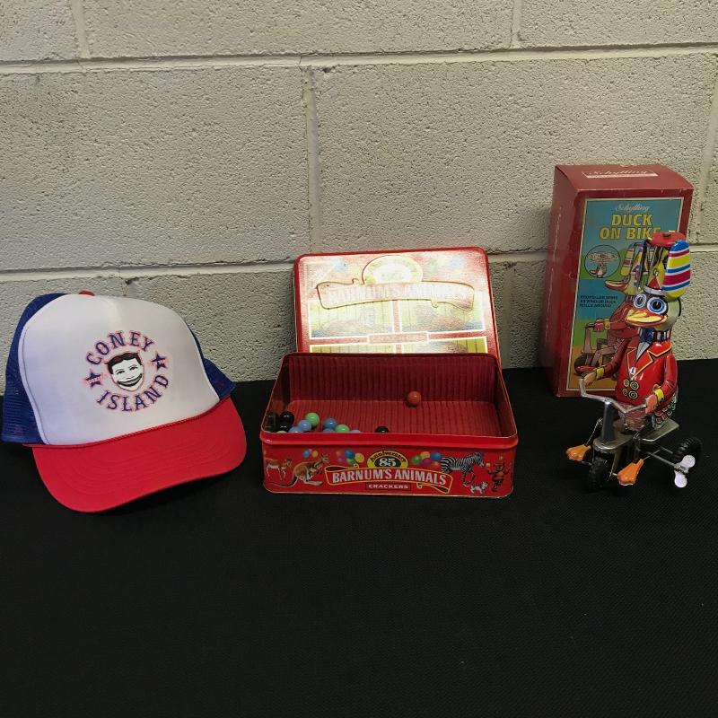Vintage toys include Schylling Duck on a Bike wind up toy with box, Coney Island ball cap in like new condition. Barnum Circus Cracker tin box from 1987 anniversary edition. Some marbles also included in lot. Shipping or local pick up in Asheville, NC.