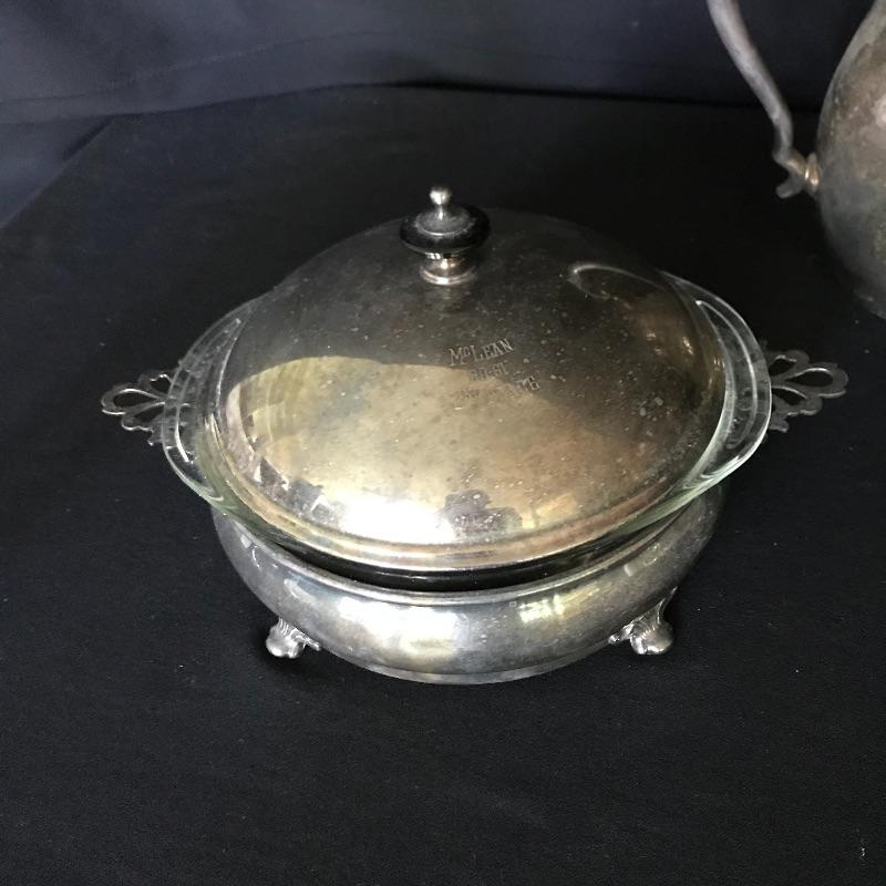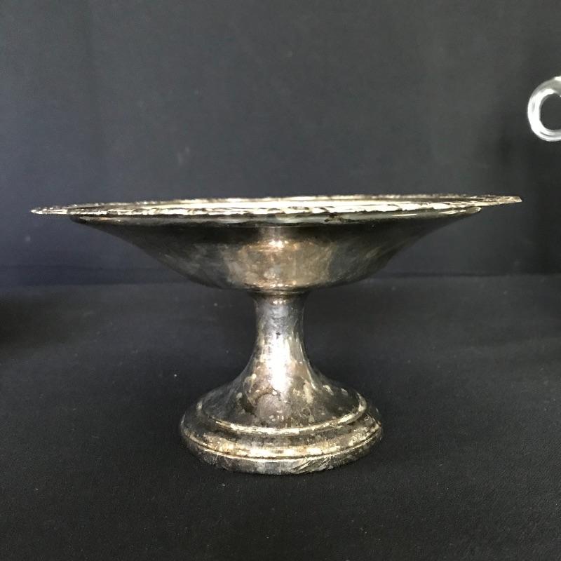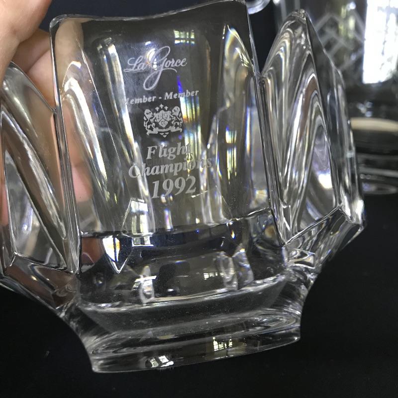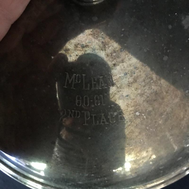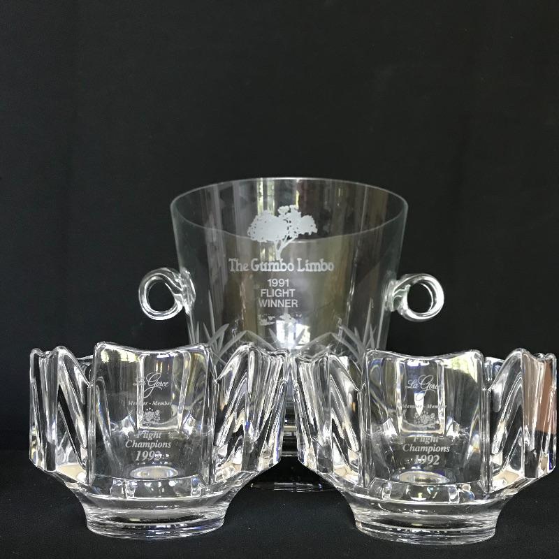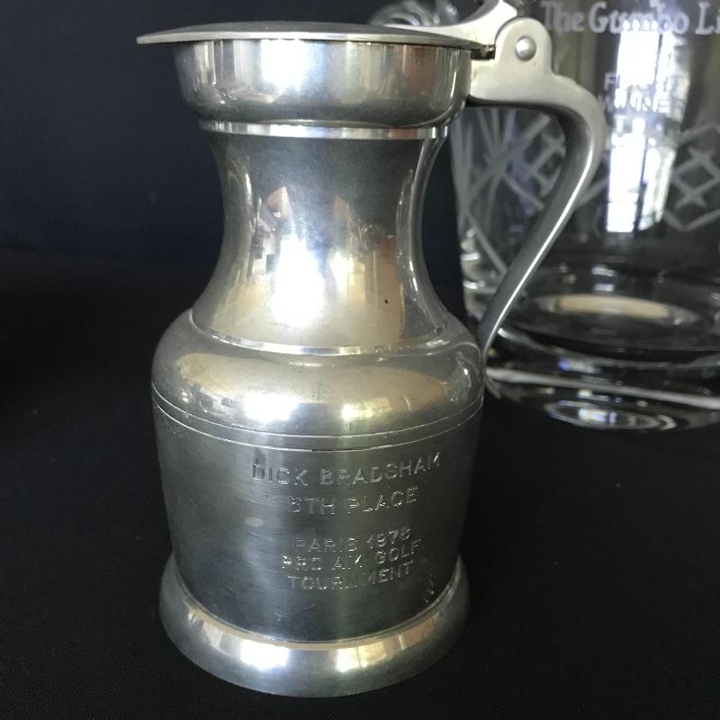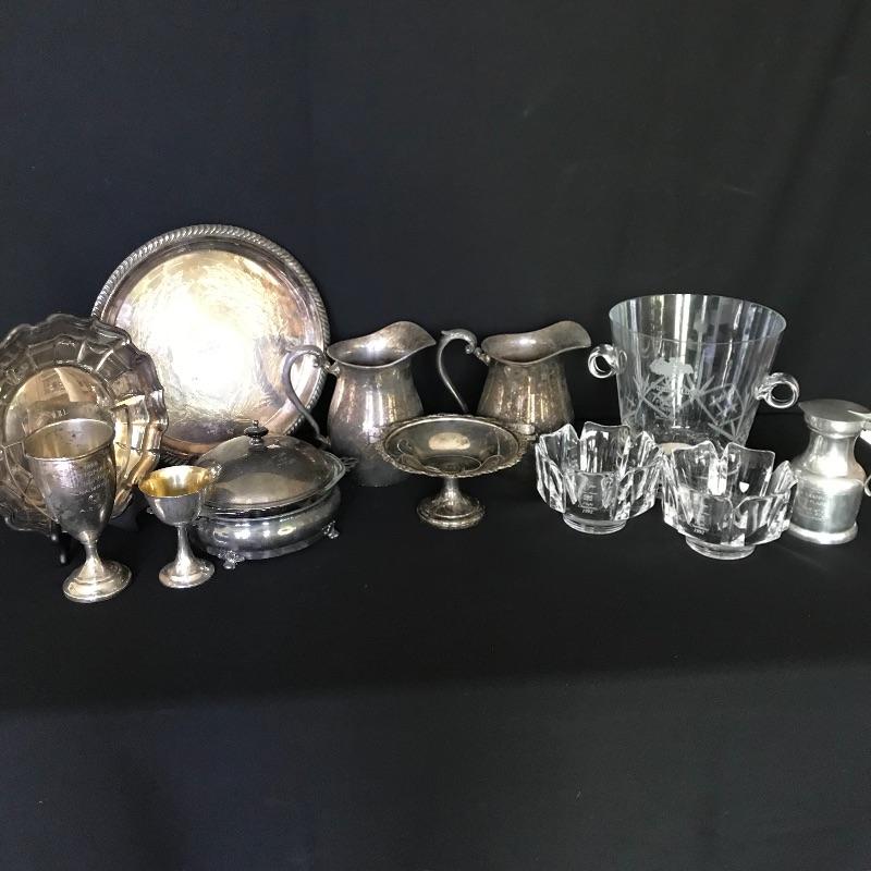 Fun collection of engraved trophies. One trophy and one small chalice are marked Sterling. Two heavy glass candy bowls have markings as well, see photos. The glass ice bucket is large, over 9” tall and the top diameter is 8.75”. Shipping available.