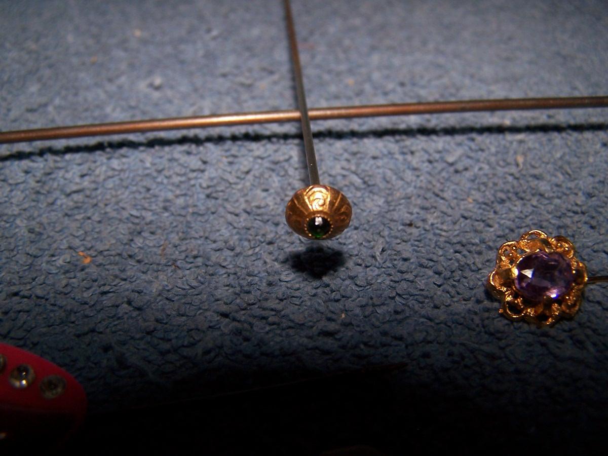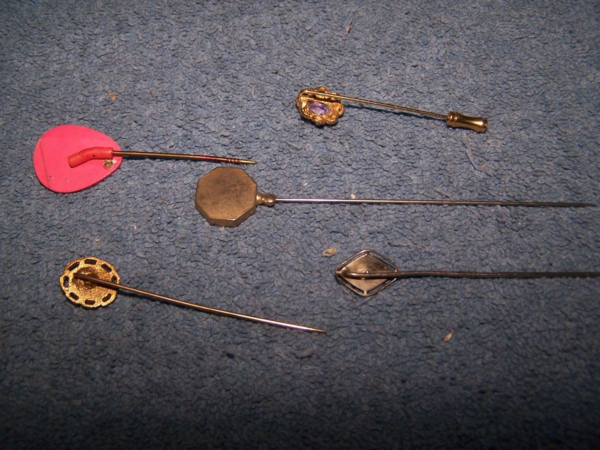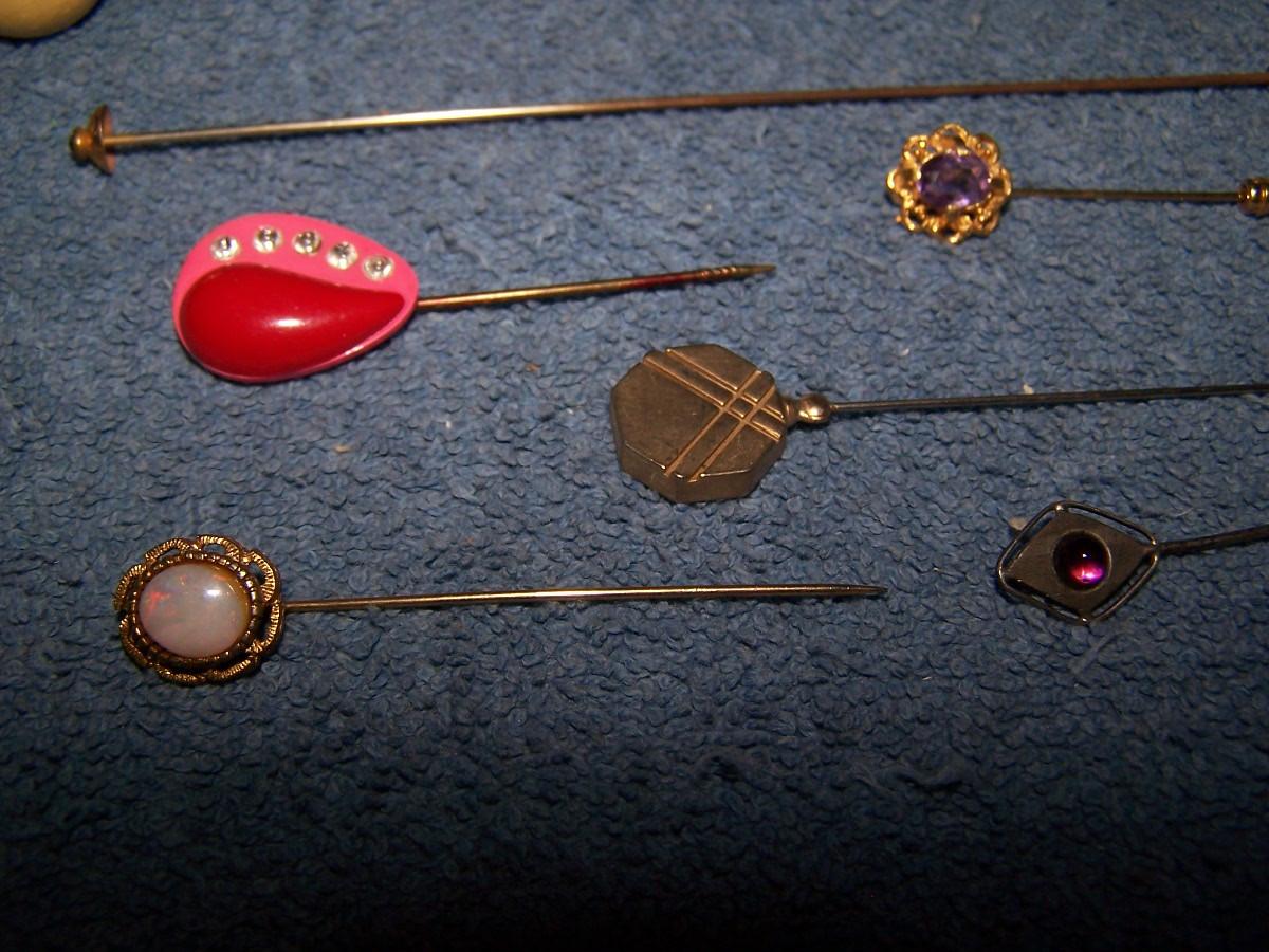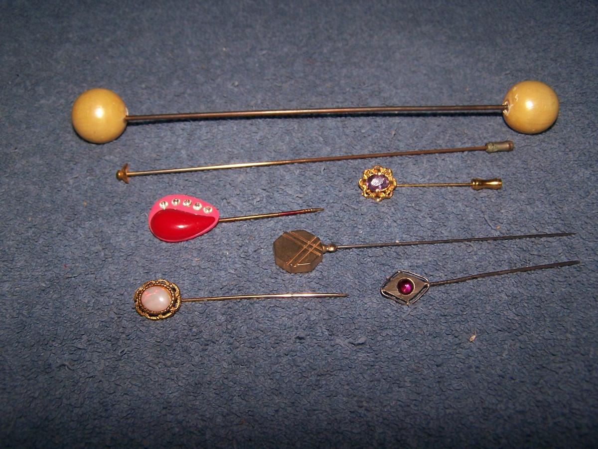 THIS IS A WONDERFUL VINTAGE GROUP OF HATPINS & STICKPINS!!! UNMARKED.. THE LONG HATPIN, WOODEN BALLS UNSCREW, AND IS 7 5/8'' TOTAL LONG.. LIGHT WEAR..