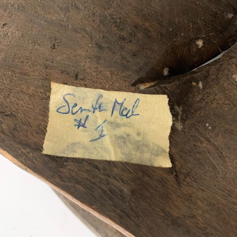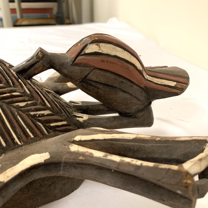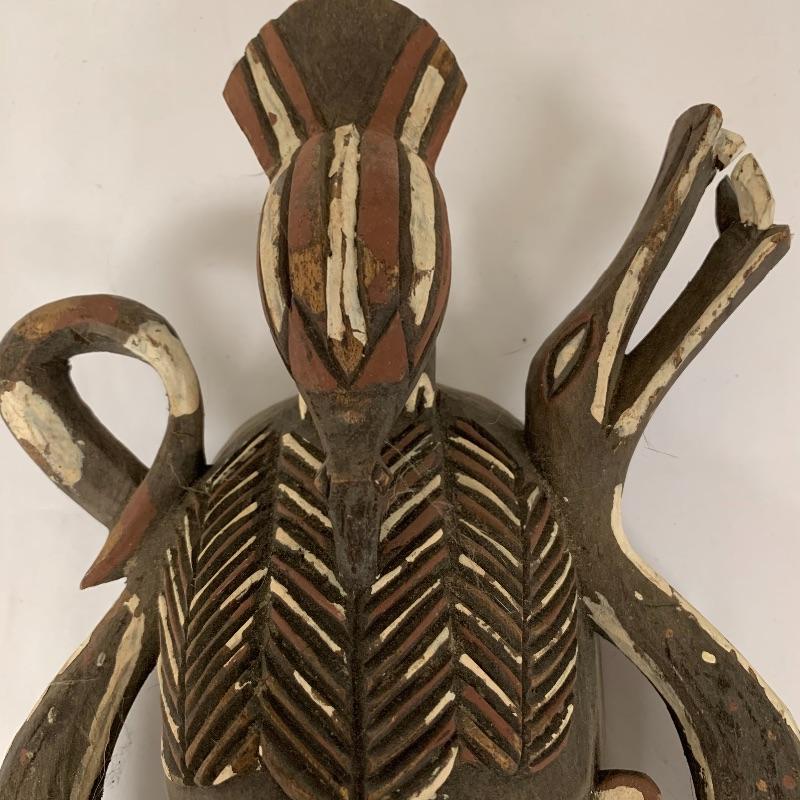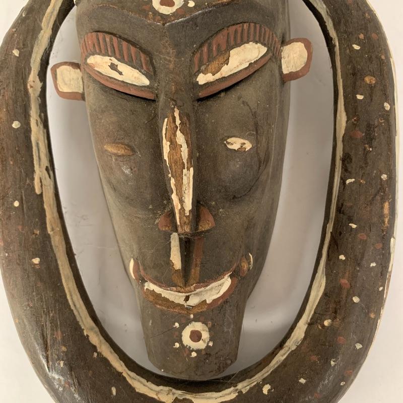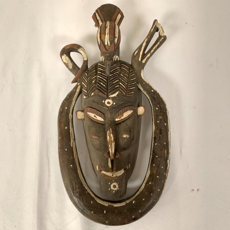 This lot includes one wooden African mask with red and white details. The mask has a ring / crown around its head with a bird on the top. It measures about 15.5in x 8.5in. Masking tape on inside is removable.