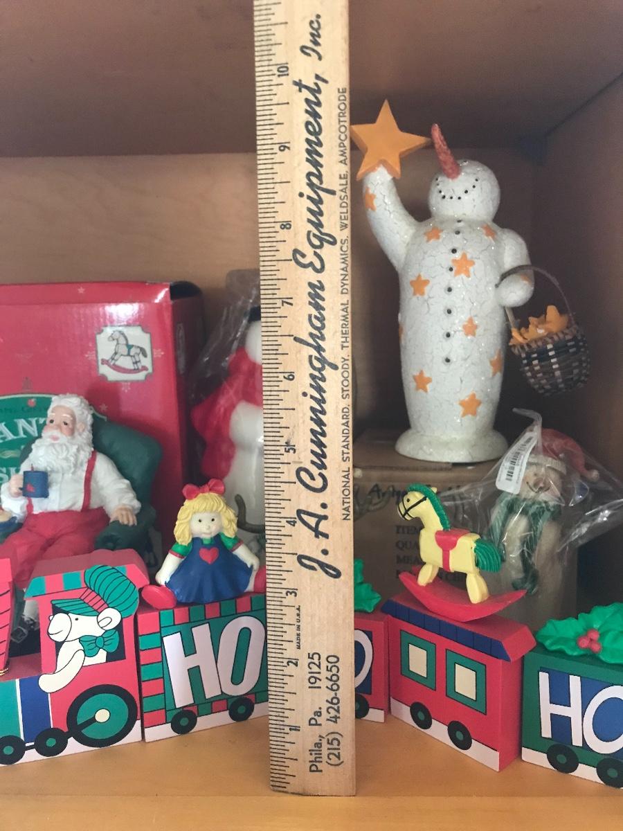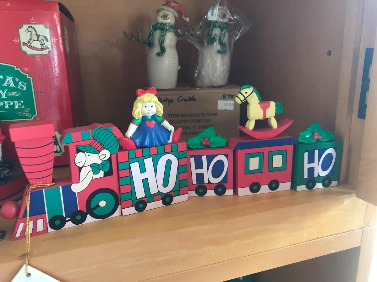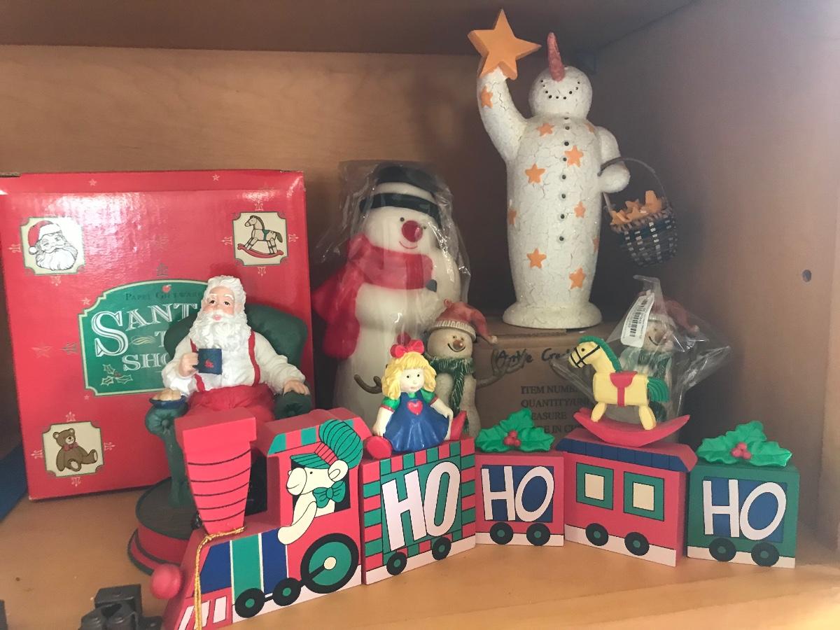 Wood block train, starry snowman, snowman candle, lounging Santa and more. Please see all pictures for content of the lot, condition of the lot, and measurements if taken. Pictures are the best representation of the items listed and items are untested unless indicated in description. Thank you for looking and have fun bidding!