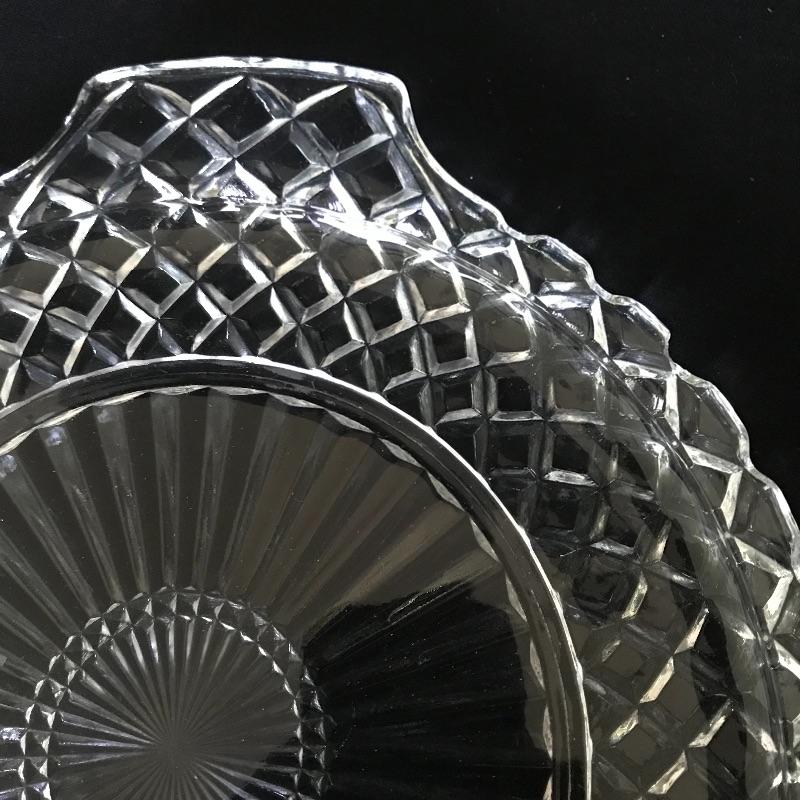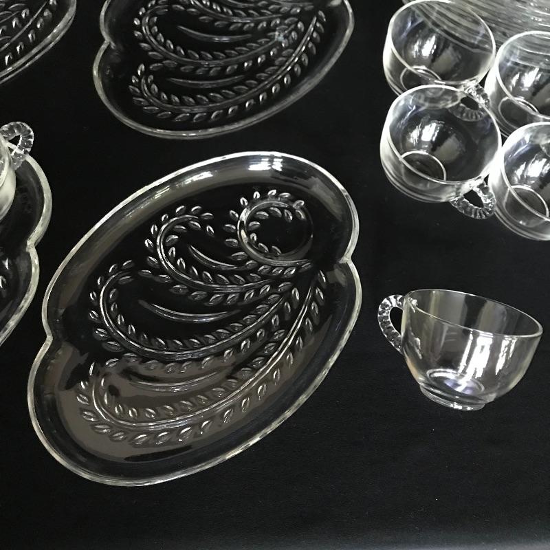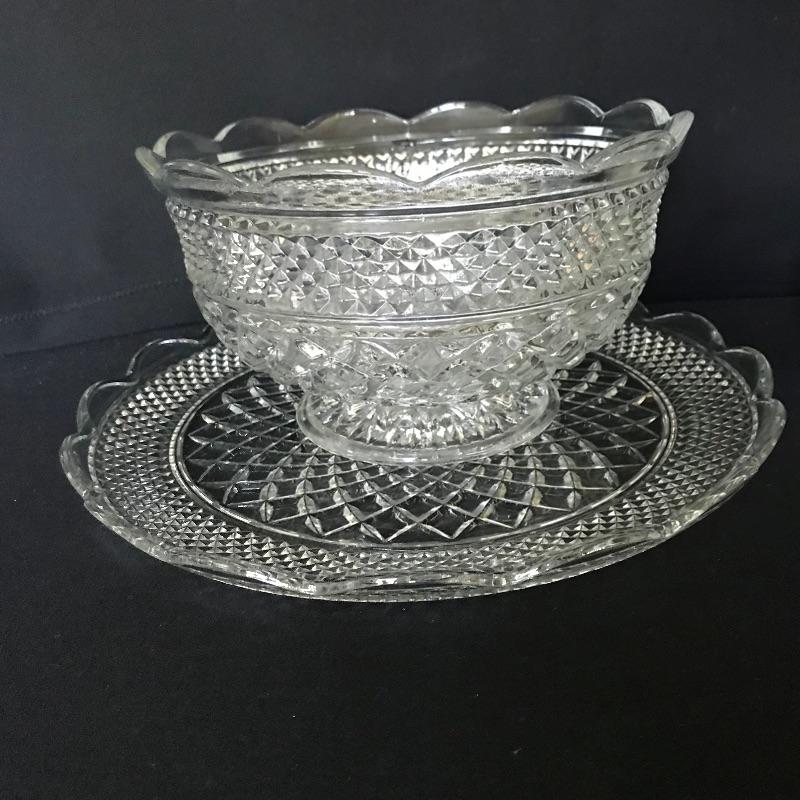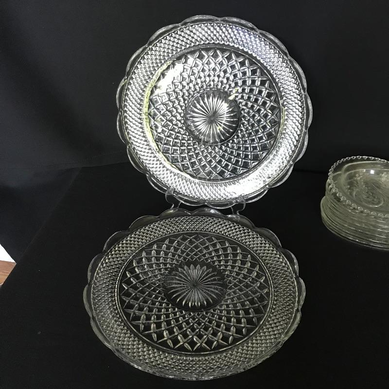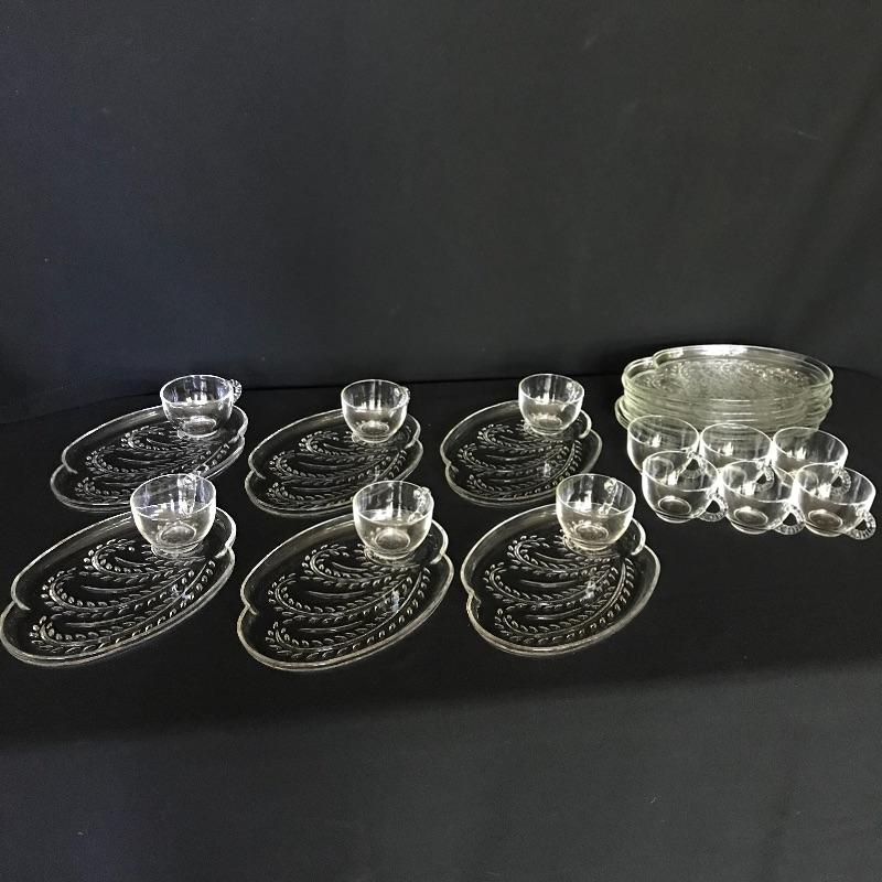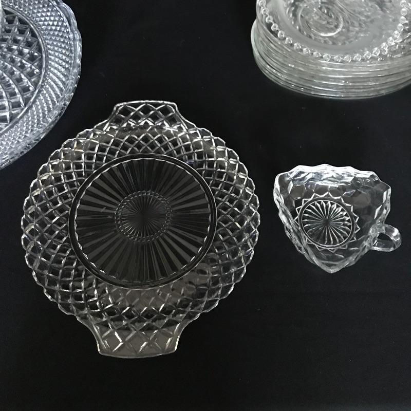 Get ready to party! Twelve person bridge set with more knob glass dishes. Lot also includes one large serving/punch bowl with two complementing plates, cream and sugar bowls. The handled fostoria Plate has a couple small chips on the edges, see photos. Matching large plates have a 14” diameter. Shipping available.
