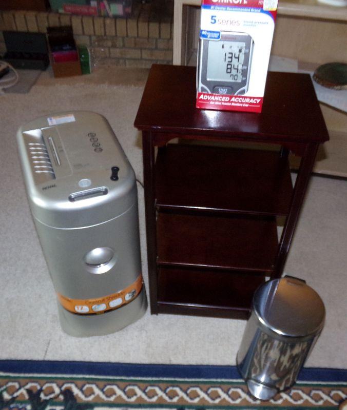 3 TIER SIDE TABLE, SMALL WASTE CAN AND BLOOD PRESSURE MACHINE