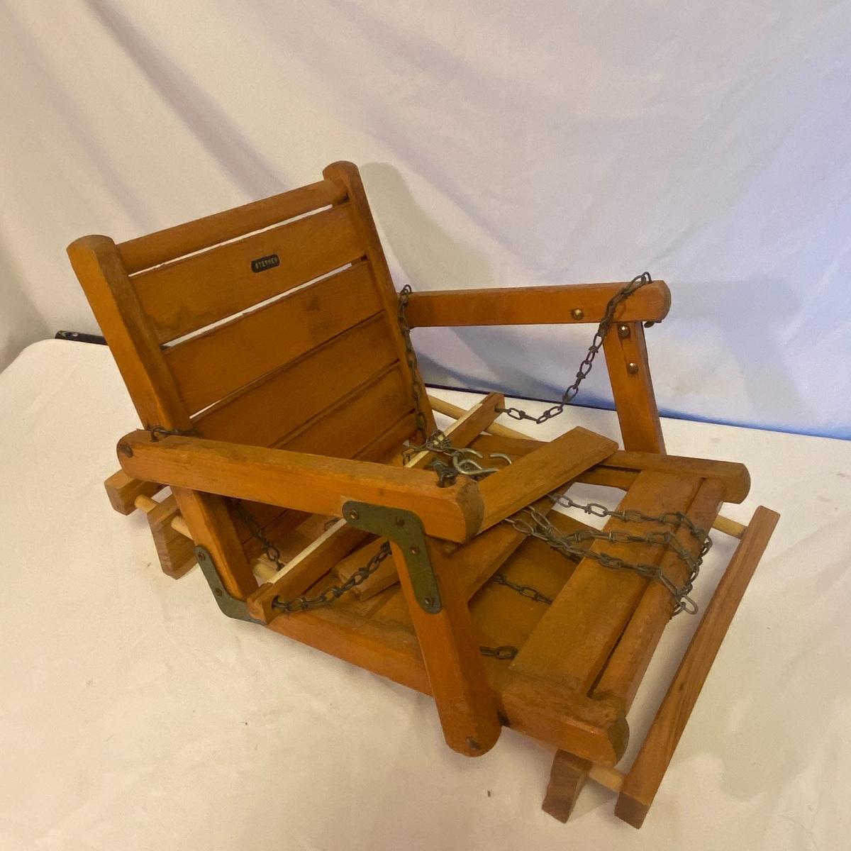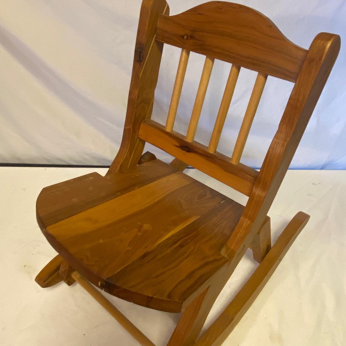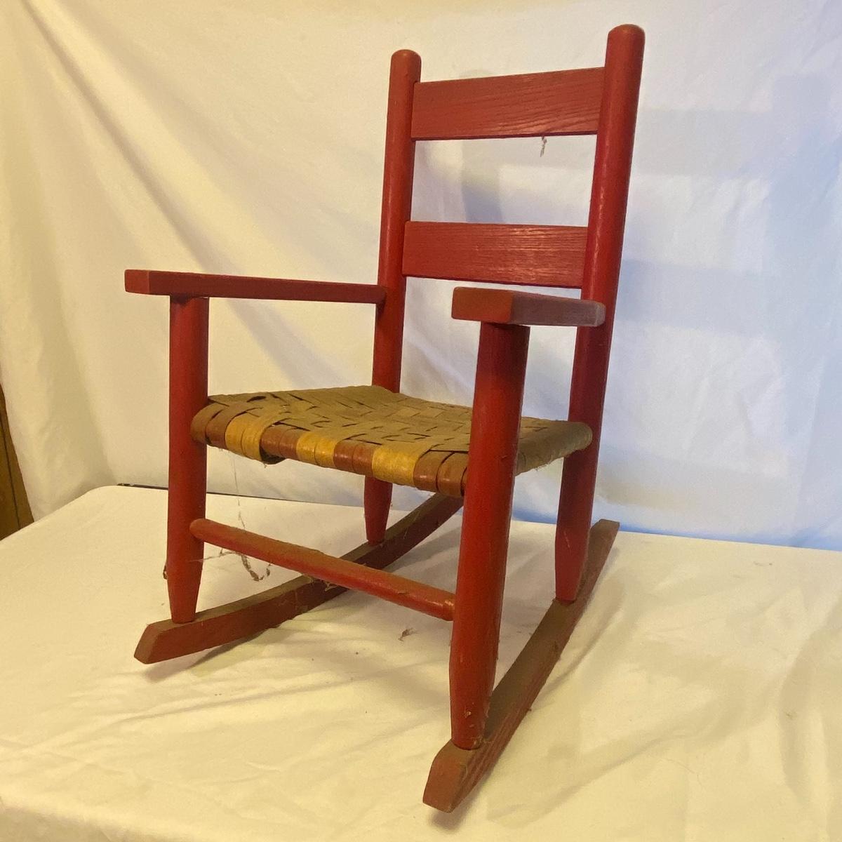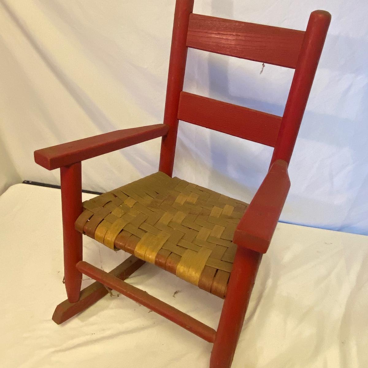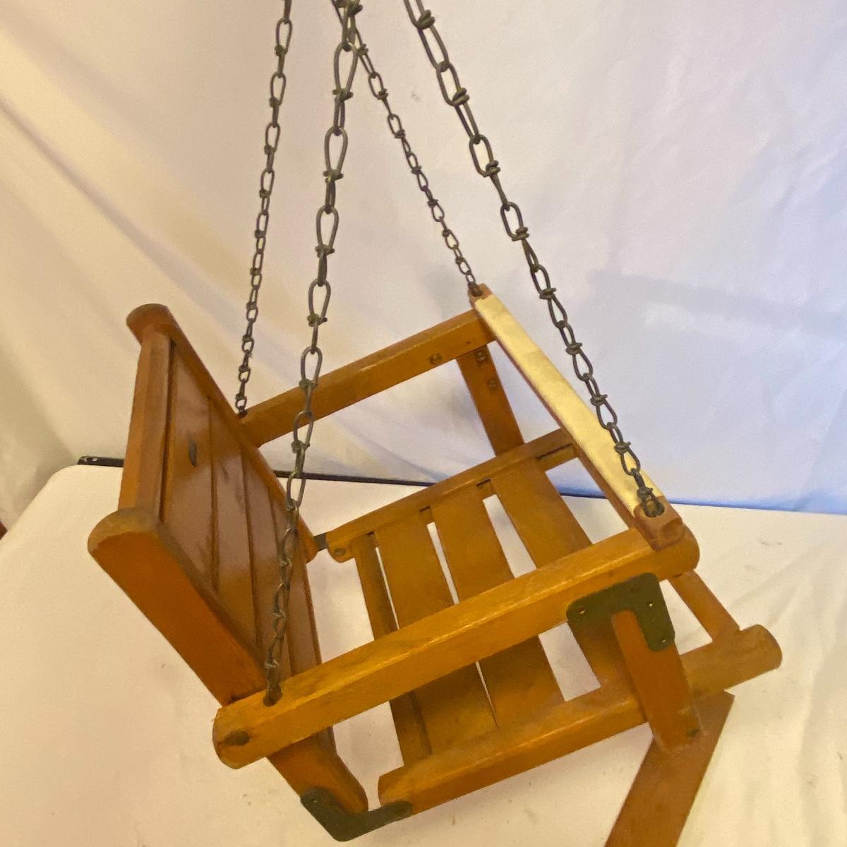 Enjoy three small rocking chairs and one swinging chair. The smallest chair is the small light wooden rocker with no arms; has measurements of 10.5"x18"x17". Largest child's chair measures 17.5"x 23.5"27" and is the darker wood rocker with arms. The swinging chair has chains and attachable s-hooks. Lot also includes a third red rocker with a woven seat and a wooden tray! Disclaimer: chairs have faced aging and damages. Please use caution and repair the swing before child use. The rockers are fairly sturdy and the woven seat is dusty and aging but still intact. Great option for dolls to use. See photos, local pickup only.
