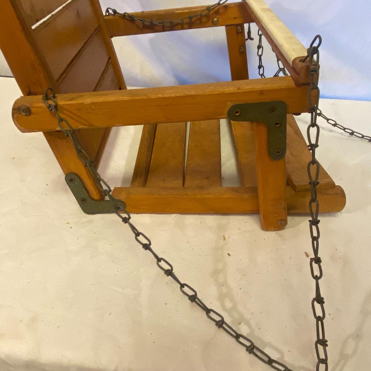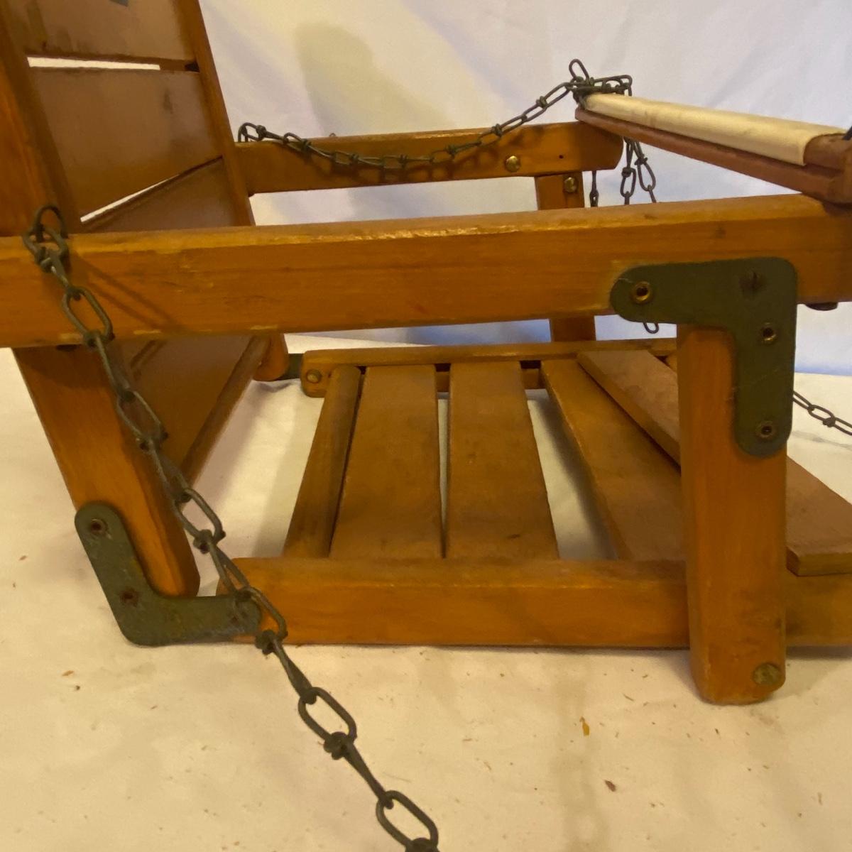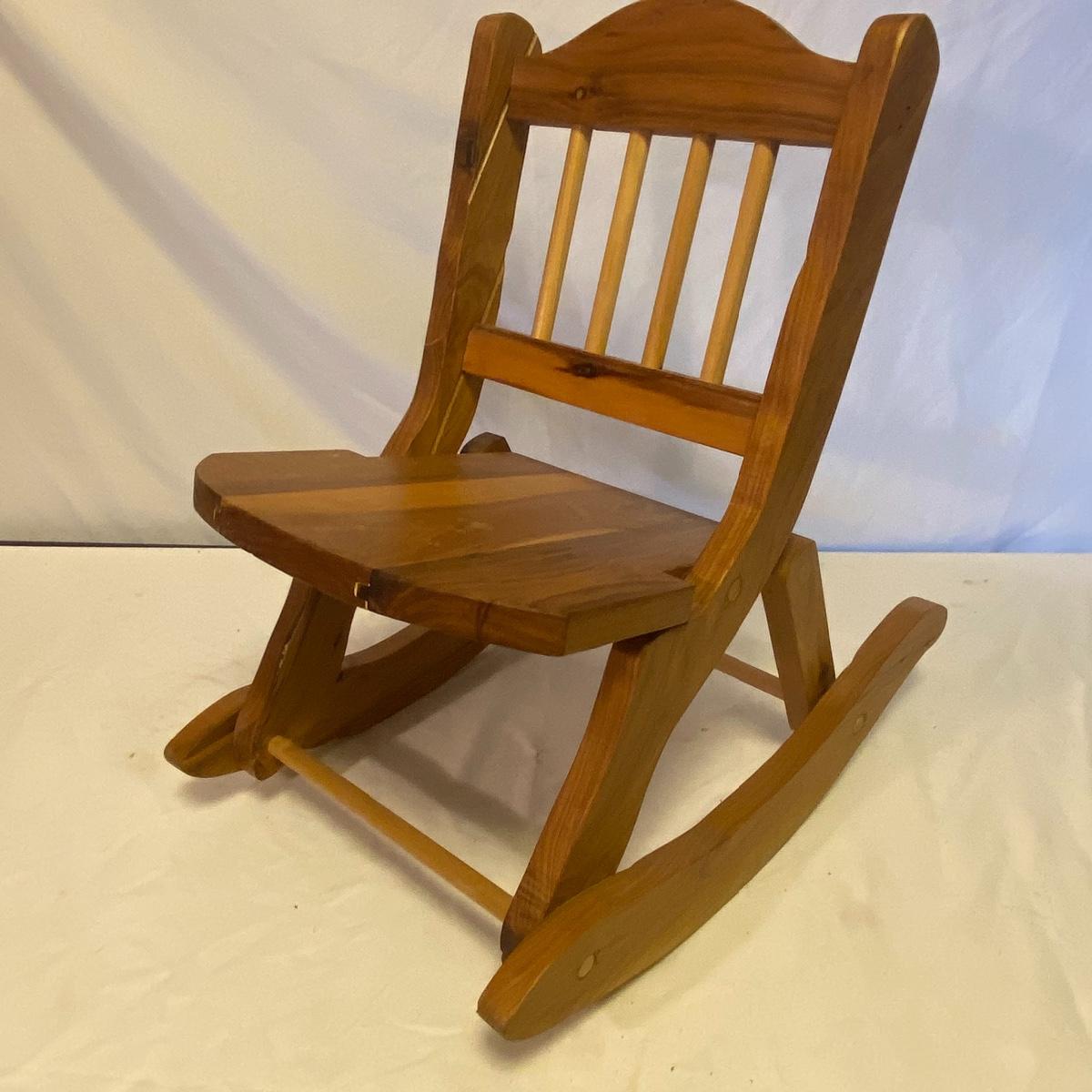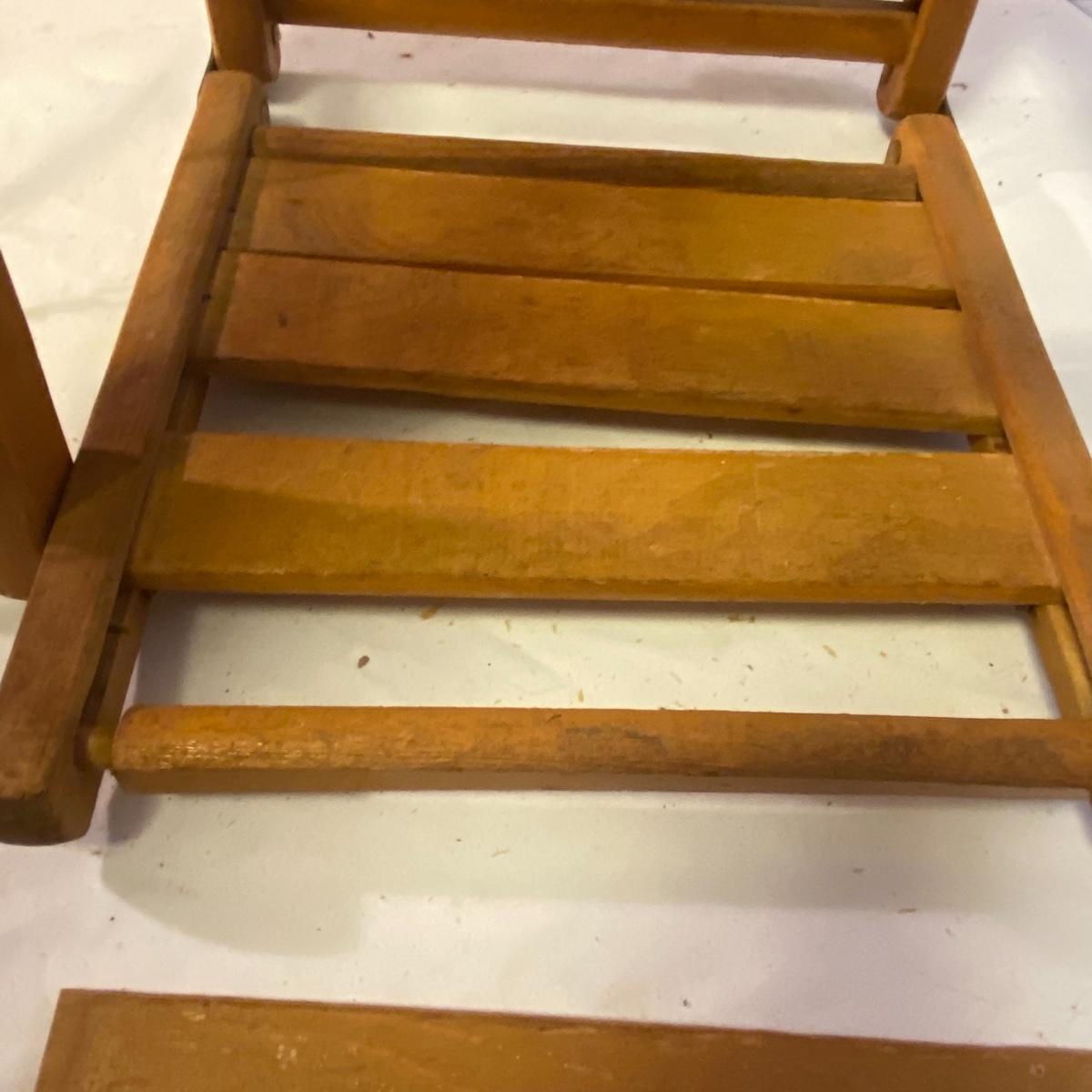 Enjoy three small rocking chairs and one swinging chair. The smallest chair is the small light wooden rocker with no arms; has measurements of 10.5"x18"x17". Largest child's chair measures 17.5"x 23.5"27" and is the darker wood rocker with arms. The swinging chair has chains and attachable s-hooks. Lot also includes a third red rocker with a woven seat and a wooden tray! Disclaimer: chairs have faced aging and damages. Please use caution and repair the swing before child use. The rockers are fairly sturdy and the woven seat is dusty and aging but still intact. Great option for dolls to use. See photos, local pickup only.