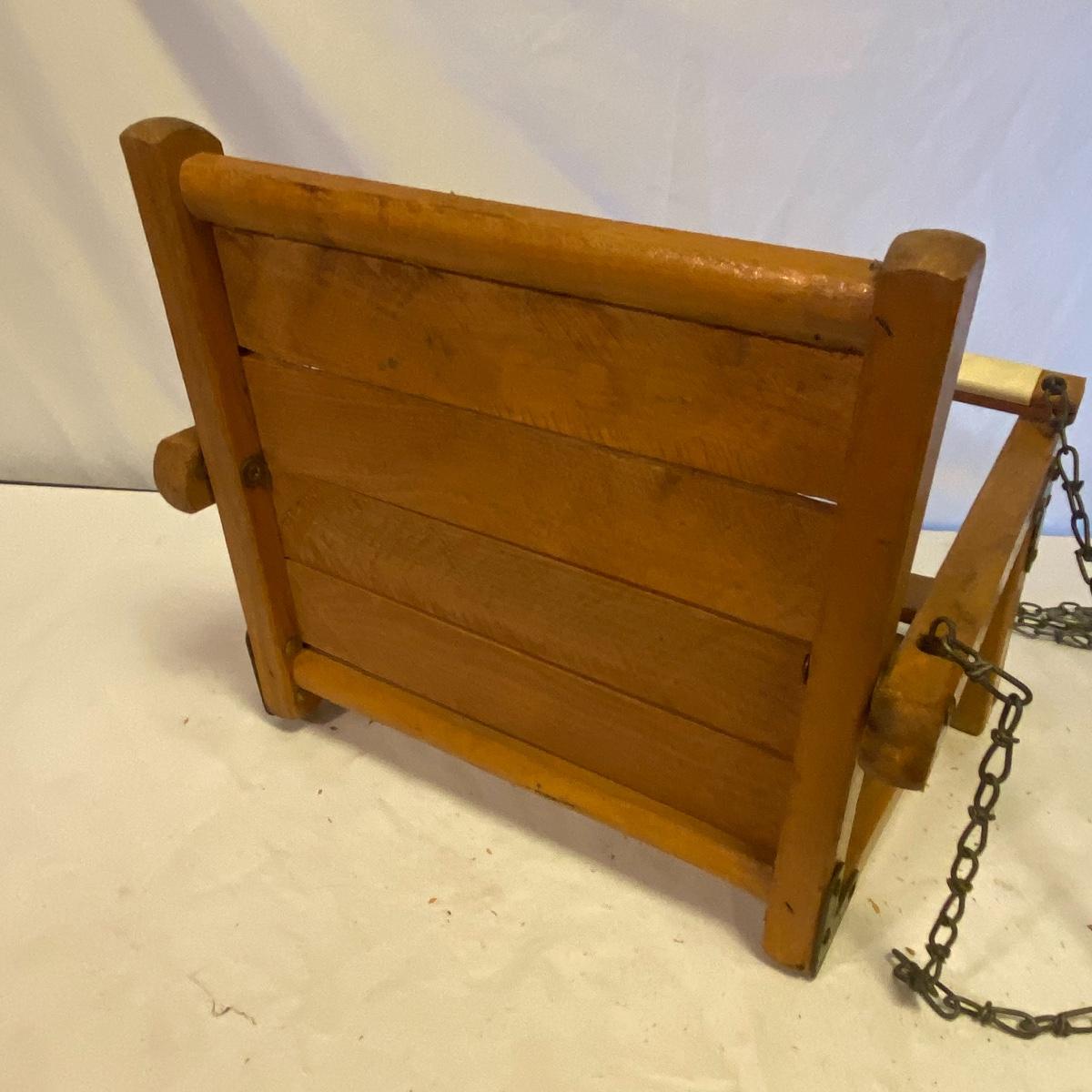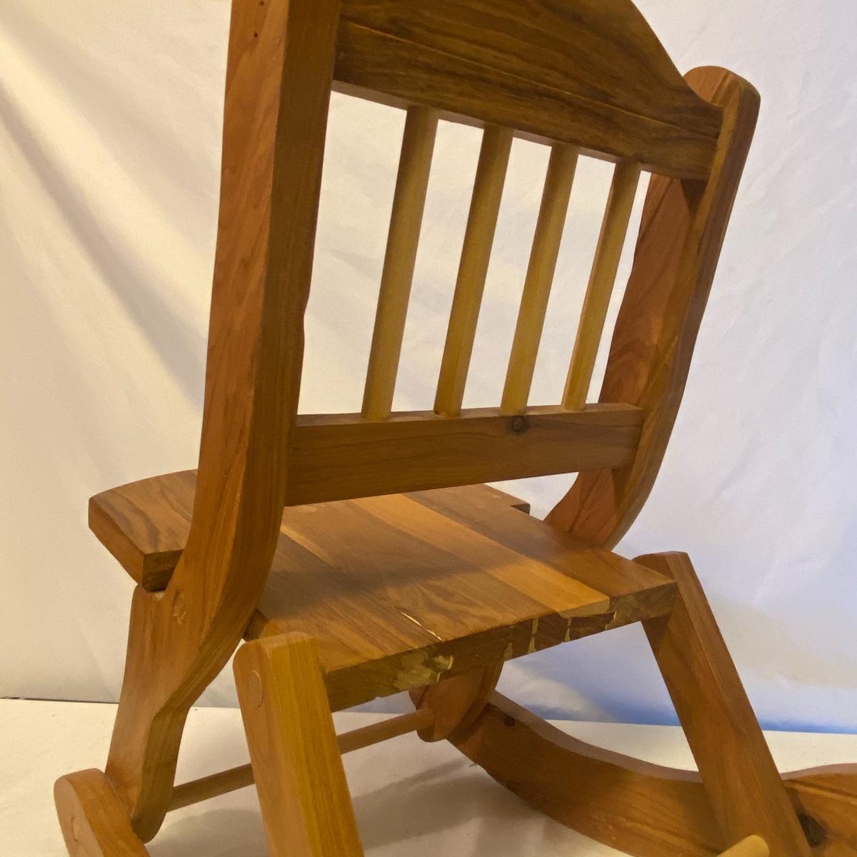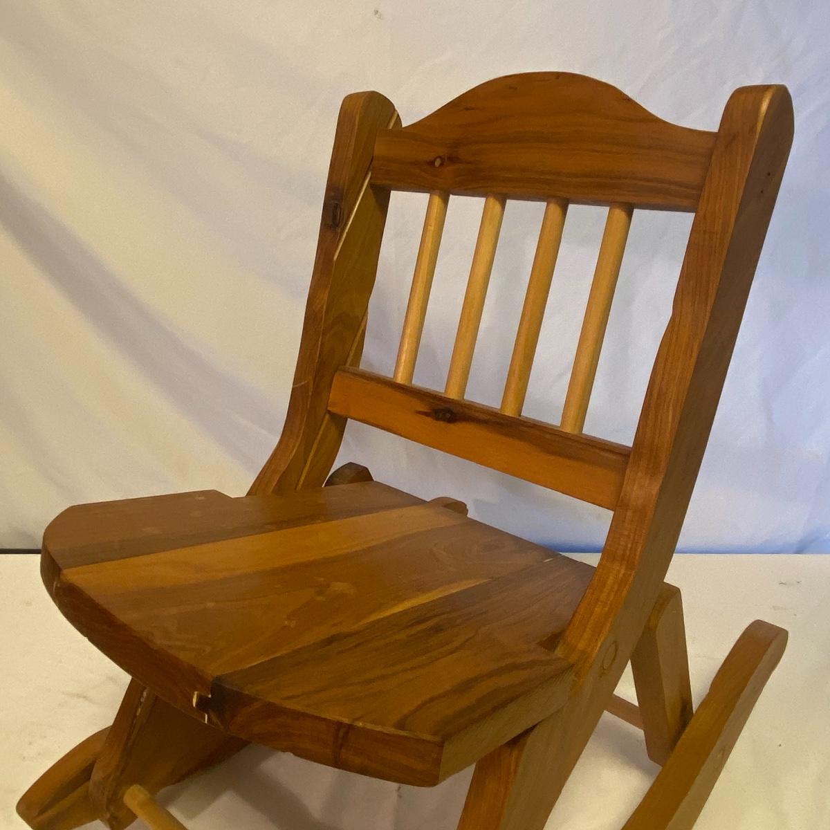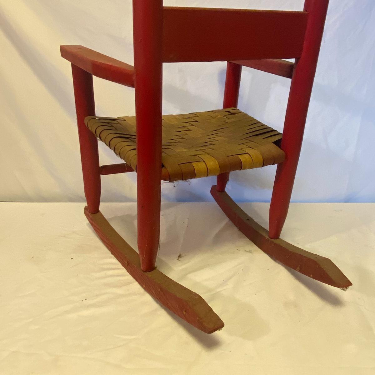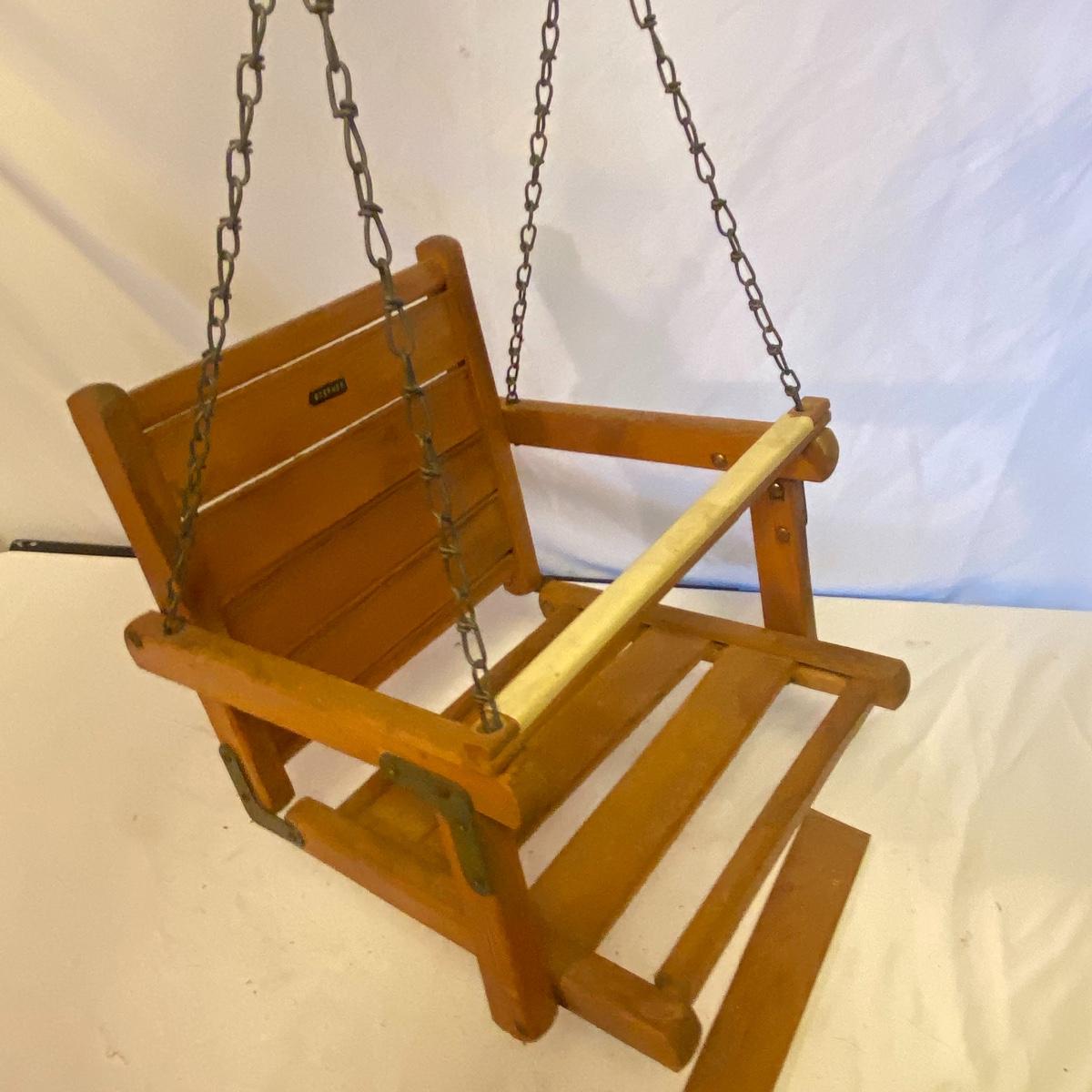 Enjoy three small rocking chairs and one swinging chair. The smallest chair is the small light wooden rocker with no arms; has measurements of 10.5"x18"x17". Largest child's chair measures 17.5"x 23.5"27" and is the darker wood rocker with arms. The swinging chair has chains and attachable s-hooks. Lot also includes a third red rocker with a woven seat and a wooden tray! Disclaimer: chairs have faced aging and damages. Please use caution and repair the swing before child use. The rockers are fairly sturdy and the woven seat is dusty and aging but still intact. Great option for dolls to use. See photos, local pickup only.