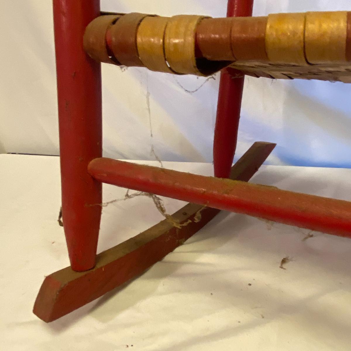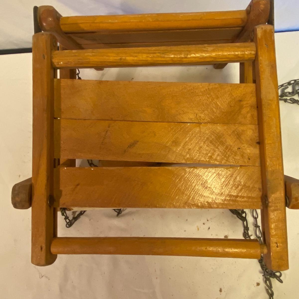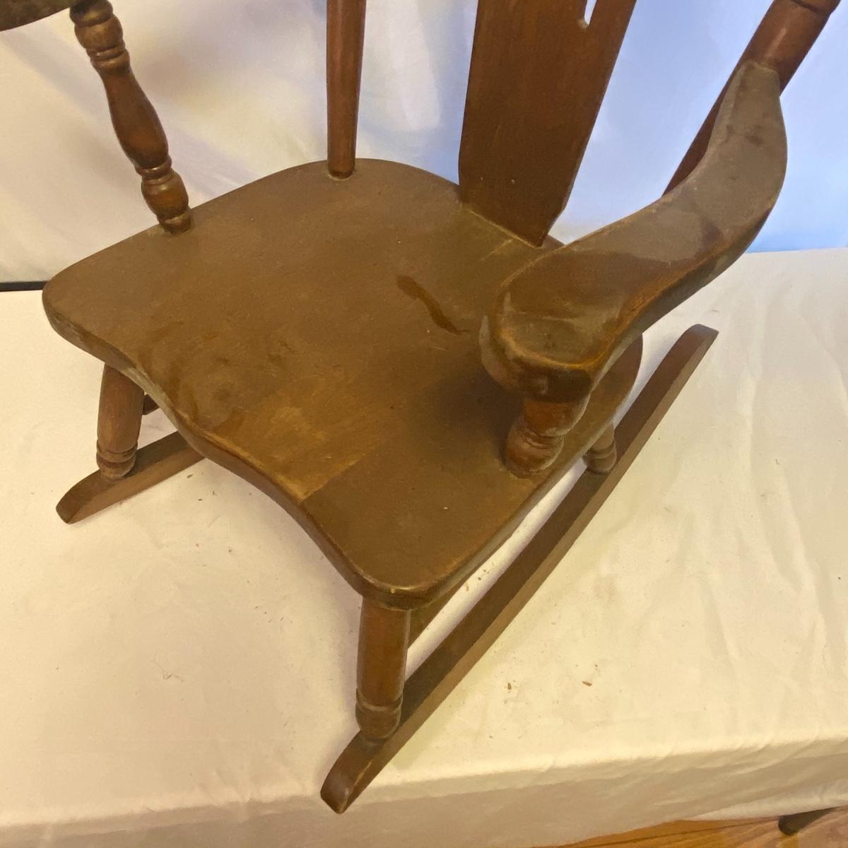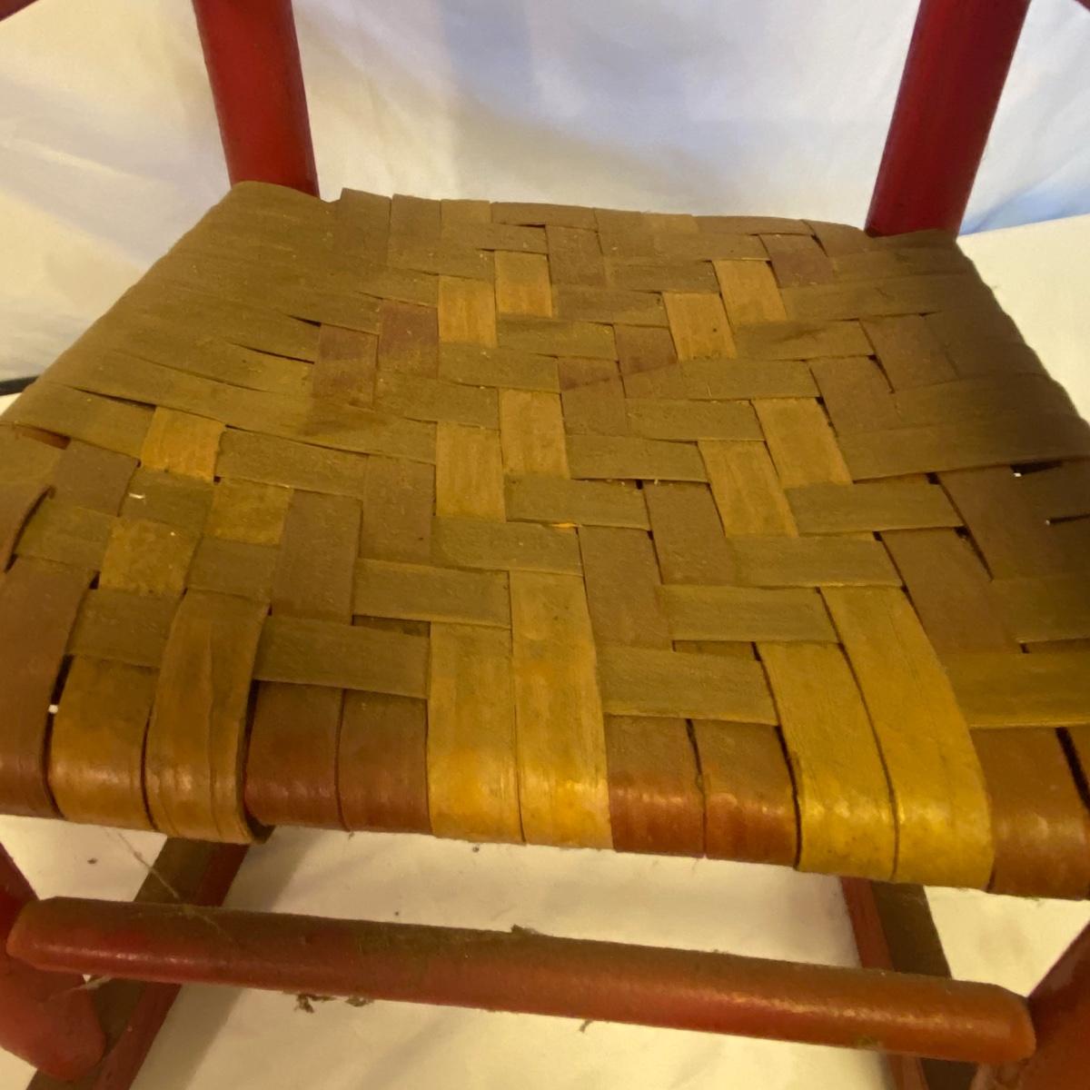 Enjoy three small rocking chairs and one swinging chair. The smallest chair is the small light wooden rocker with no arms; has measurements of 10.5"x18"x17". Largest child's chair measures 17.5"x 23.5"27" and is the darker wood rocker with arms. The swinging chair has chains and attachable s-hooks. Lot also includes a third red rocker with a woven seat and a wooden tray! Disclaimer: chairs have faced aging and damages. Please use caution and repair the swing before child use. The rockers are fairly sturdy and the woven seat is dusty and aging but still intact. Great option for dolls to use. See photos, local pickup only.