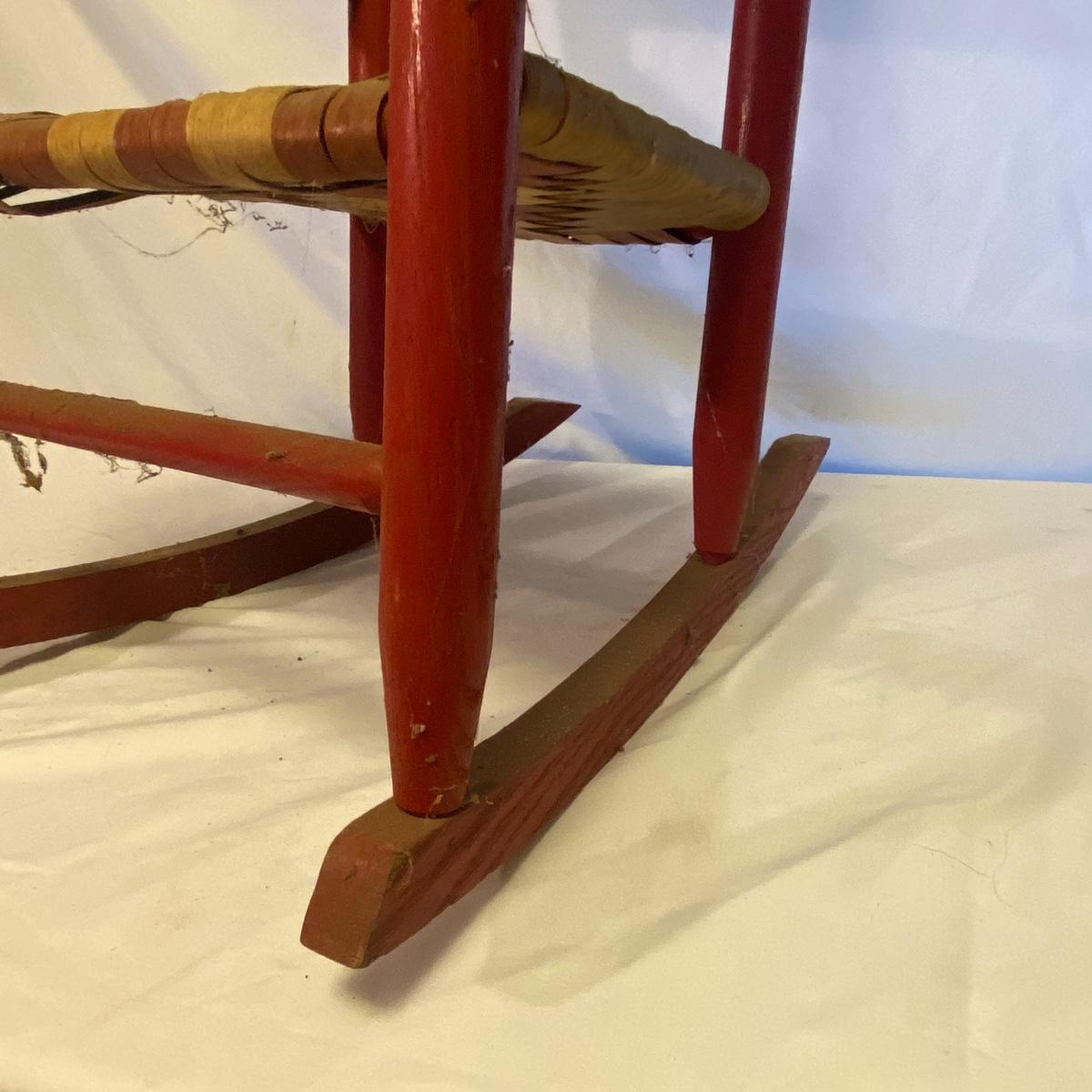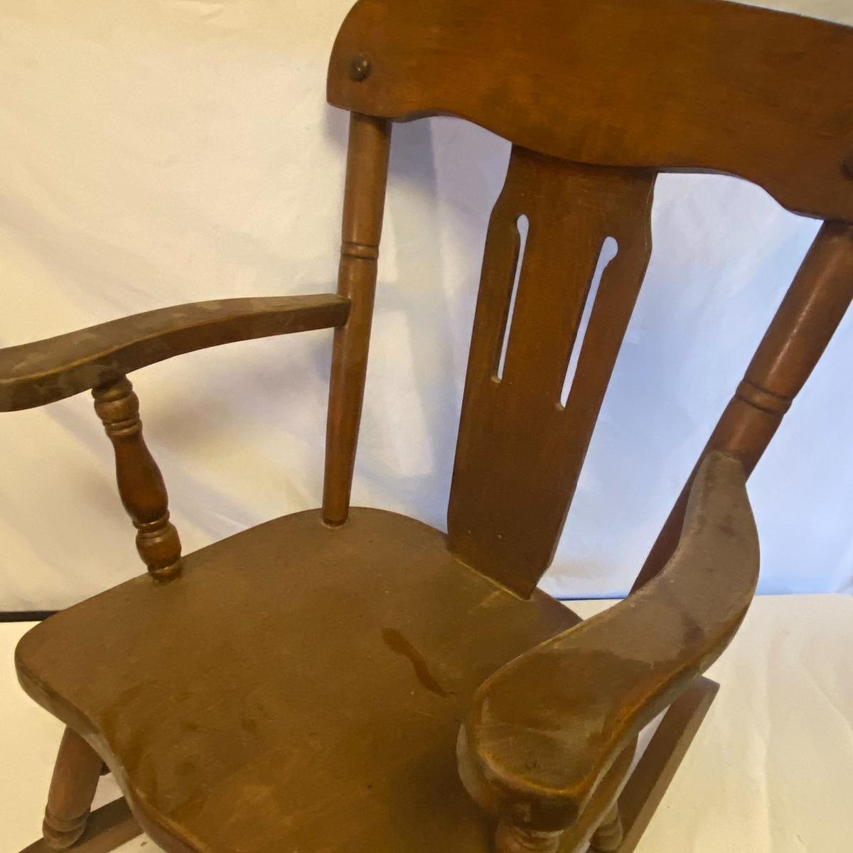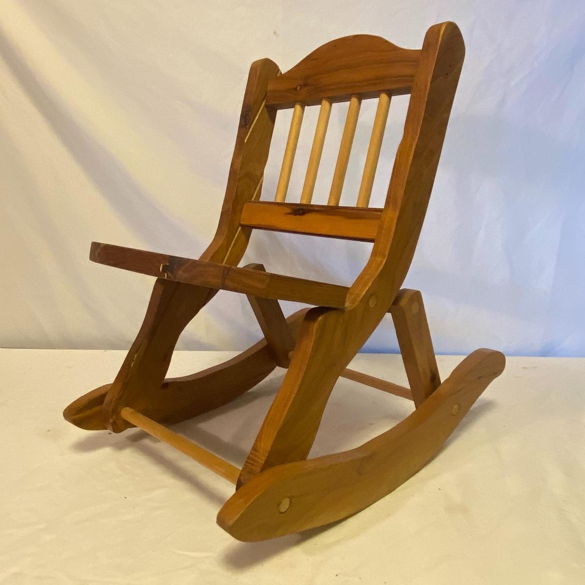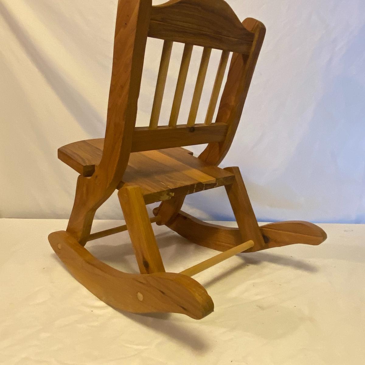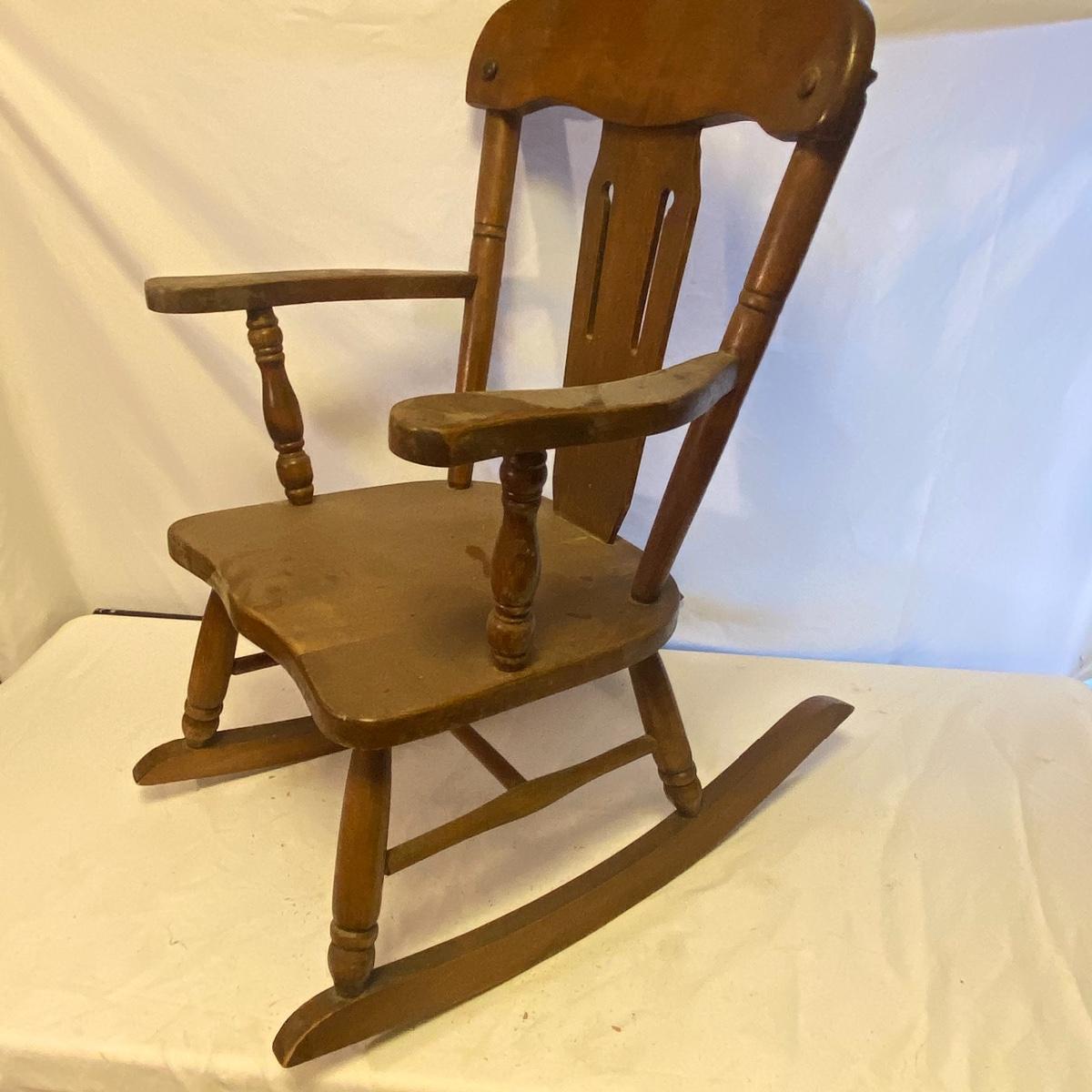 Enjoy three small rocking chairs and one swinging chair. The smallest chair is the small light wooden rocker with no arms; has measurements of 10.5"x18"x17". Largest child's chair measures 17.5"x 23.5"27" and is the darker wood rocker with arms. The swinging chair has chains and attachable s-hooks. Lot also includes a third red rocker with a woven seat and a wooden tray! Disclaimer: chairs have faced aging and damages. Please use caution and repair the swing before child use. The rockers are fairly sturdy and the woven seat is dusty and aging but still intact. Great option for dolls to use. See photos, local pickup only.