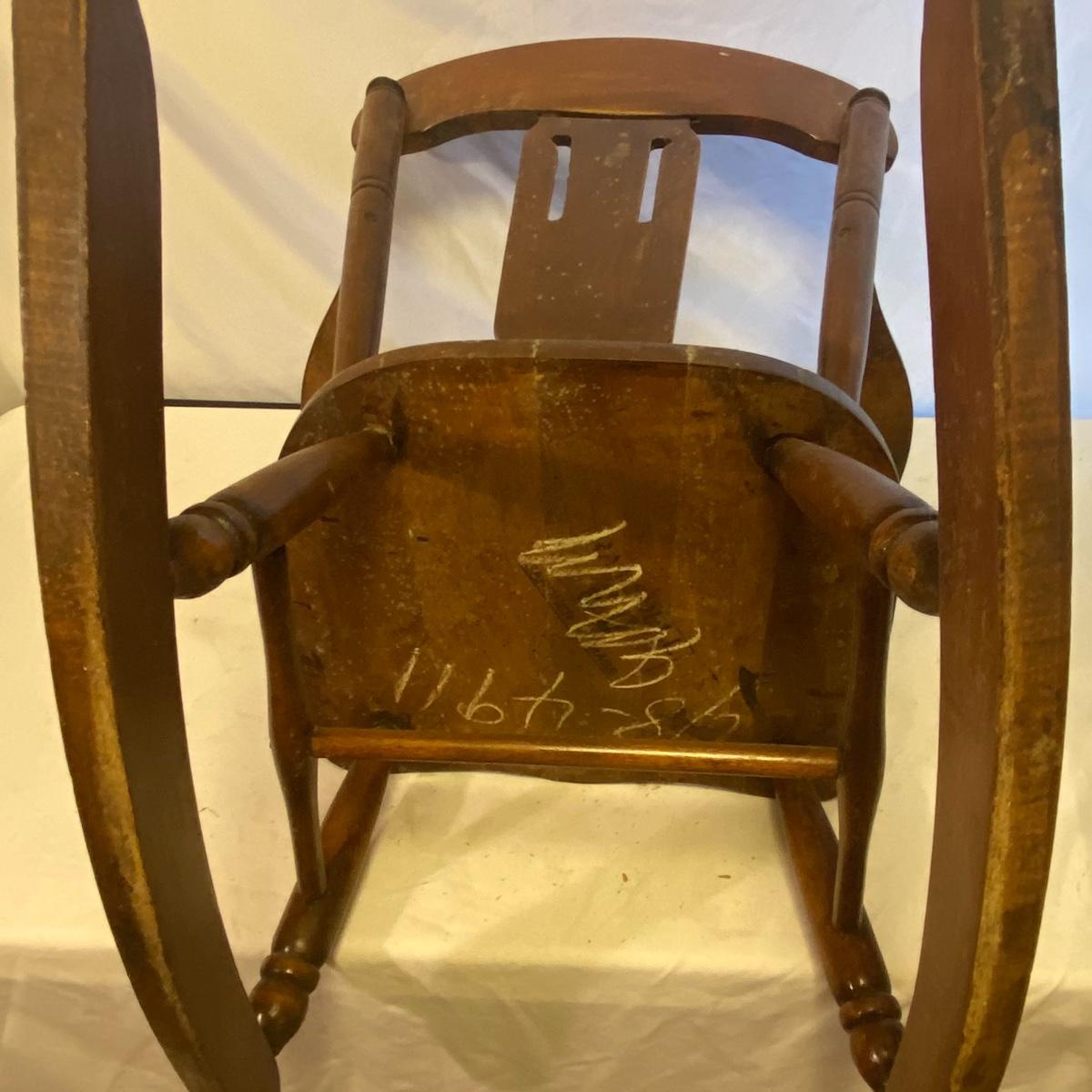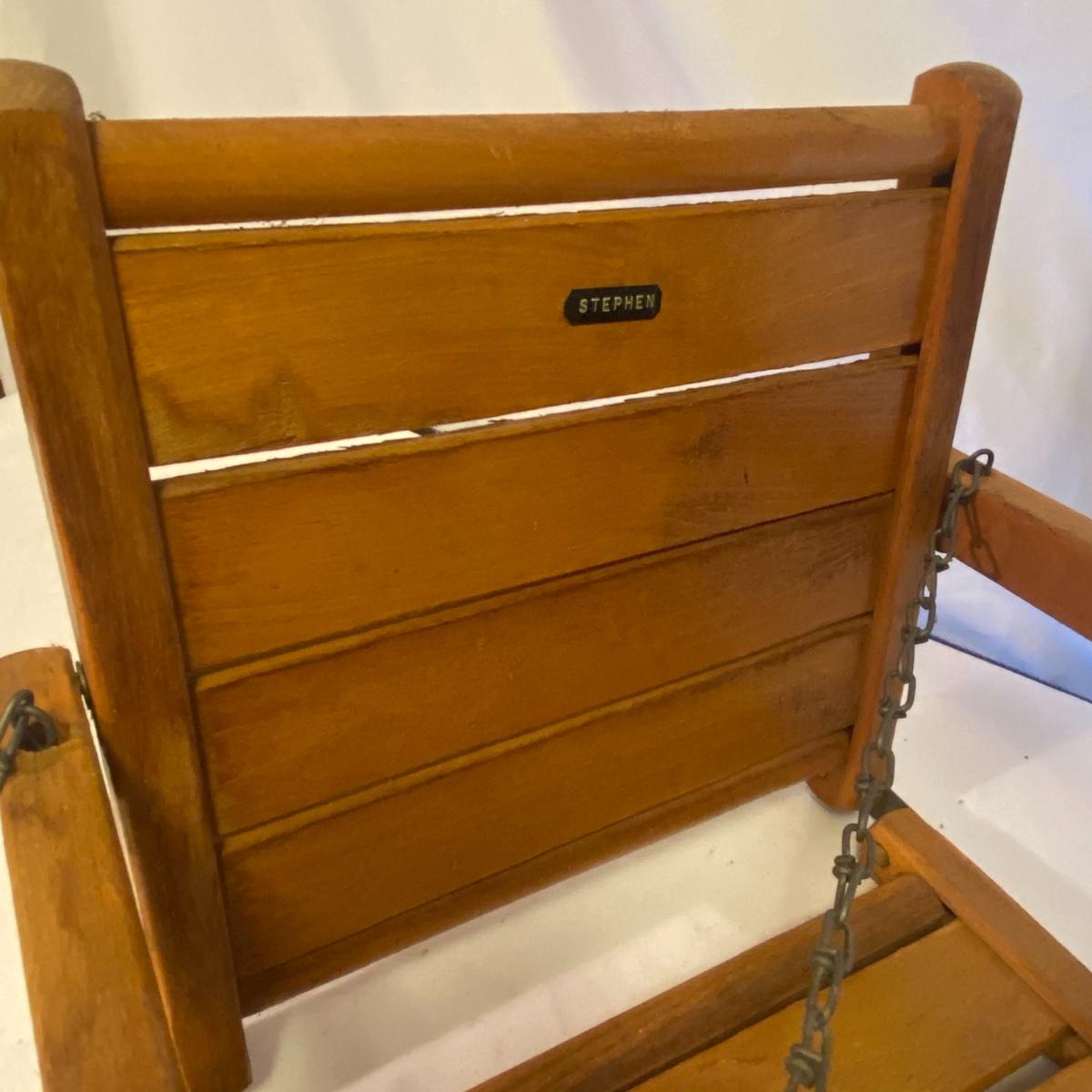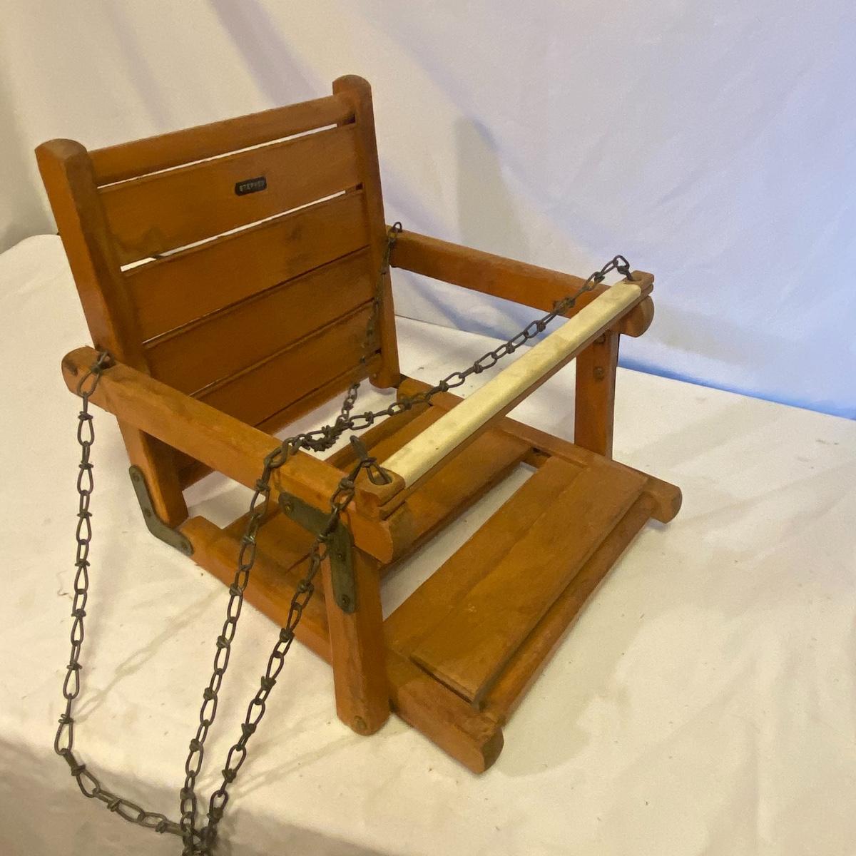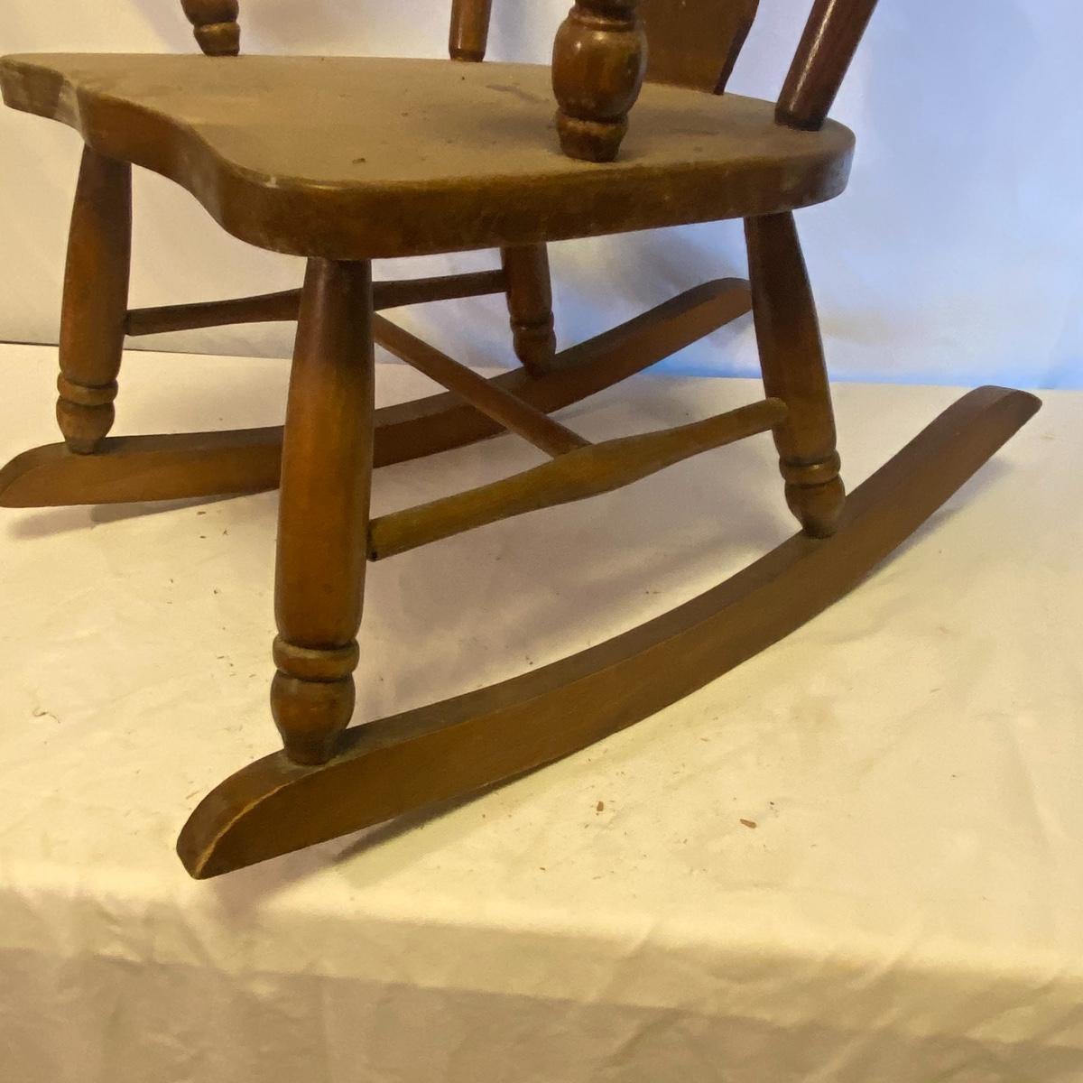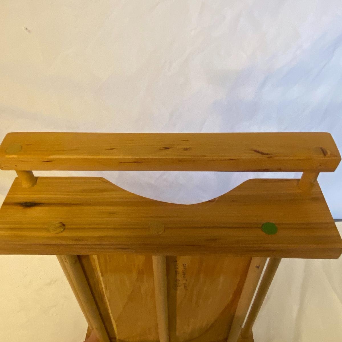 Enjoy three small rocking chairs and one swinging chair. The smallest chair is the small light wooden rocker with no arms; has measurements of 10.5"x18"x17". Largest child's chair measures 17.5"x 23.5"27" and is the darker wood rocker with arms. The swinging chair has chains and attachable s-hooks. Lot also includes a third red rocker with a woven seat and a wooden tray! Disclaimer: chairs have faced aging and damages. Please use caution and repair the swing before child use. The rockers are fairly sturdy and the woven seat is dusty and aging but still intact. Great option for dolls to use. See photos, local pickup only.