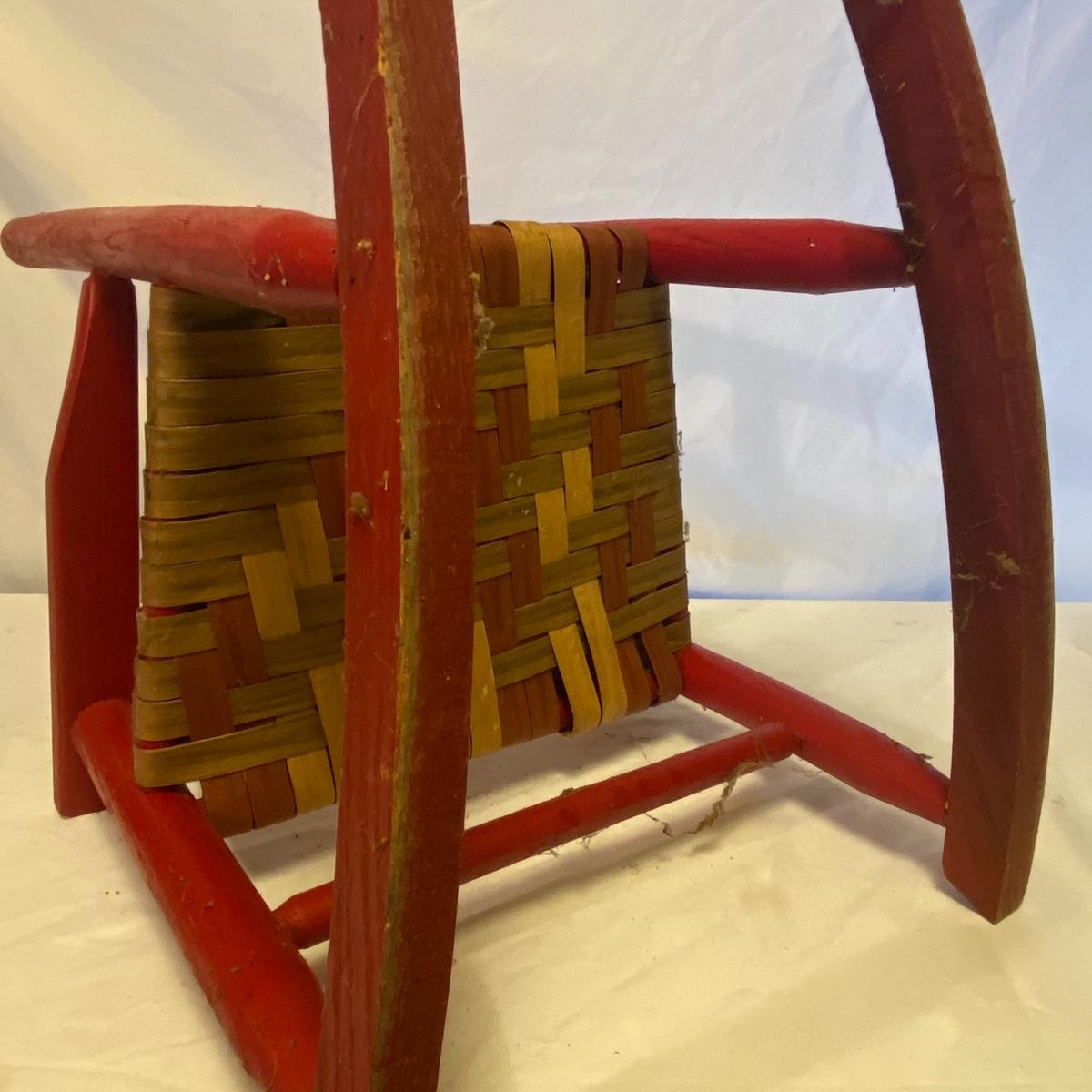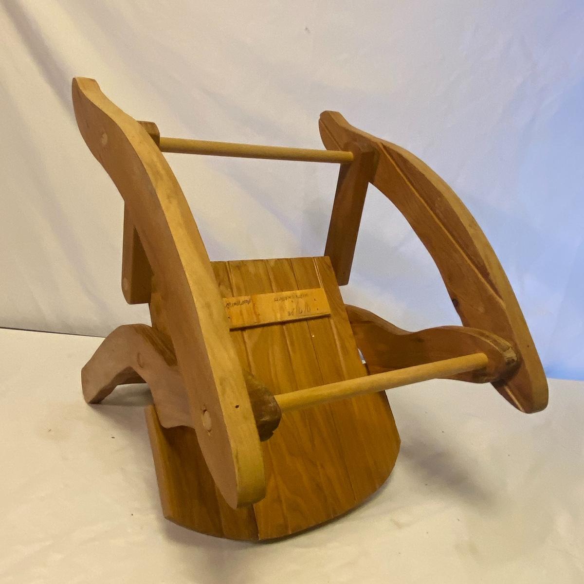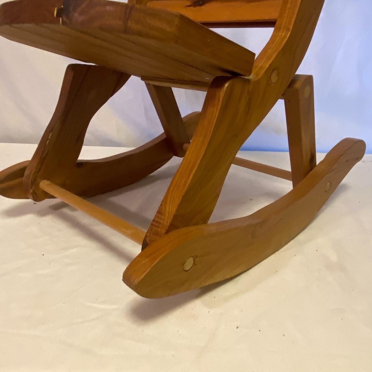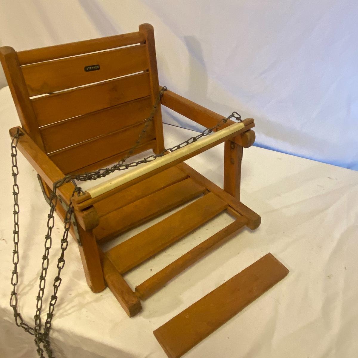 Enjoy three small rocking chairs and one swinging chair. The smallest chair is the small light wooden rocker with no arms; has measurements of 10.5"x18"x17". Largest child's chair measures 17.5"x 23.5"27" and is the darker wood rocker with arms. The swinging chair has chains and attachable s-hooks. Lot also includes a third red rocker with a woven seat and a wooden tray! Disclaimer: chairs have faced aging and damages. Please use caution and repair the swing before child use. The rockers are fairly sturdy and the woven seat is dusty and aging but still intact. Great option for dolls to use. See photos, local pickup only.
