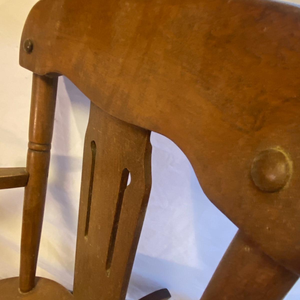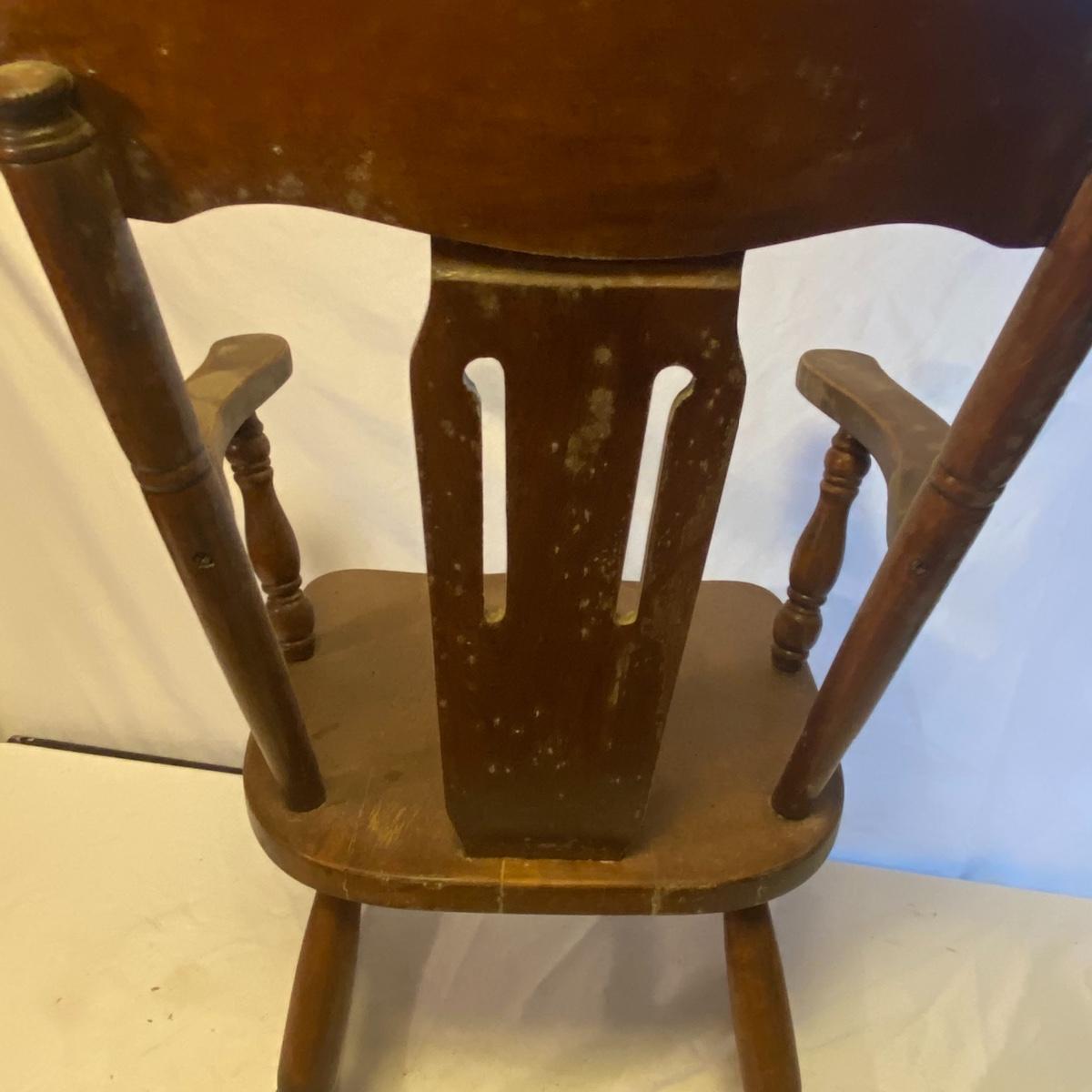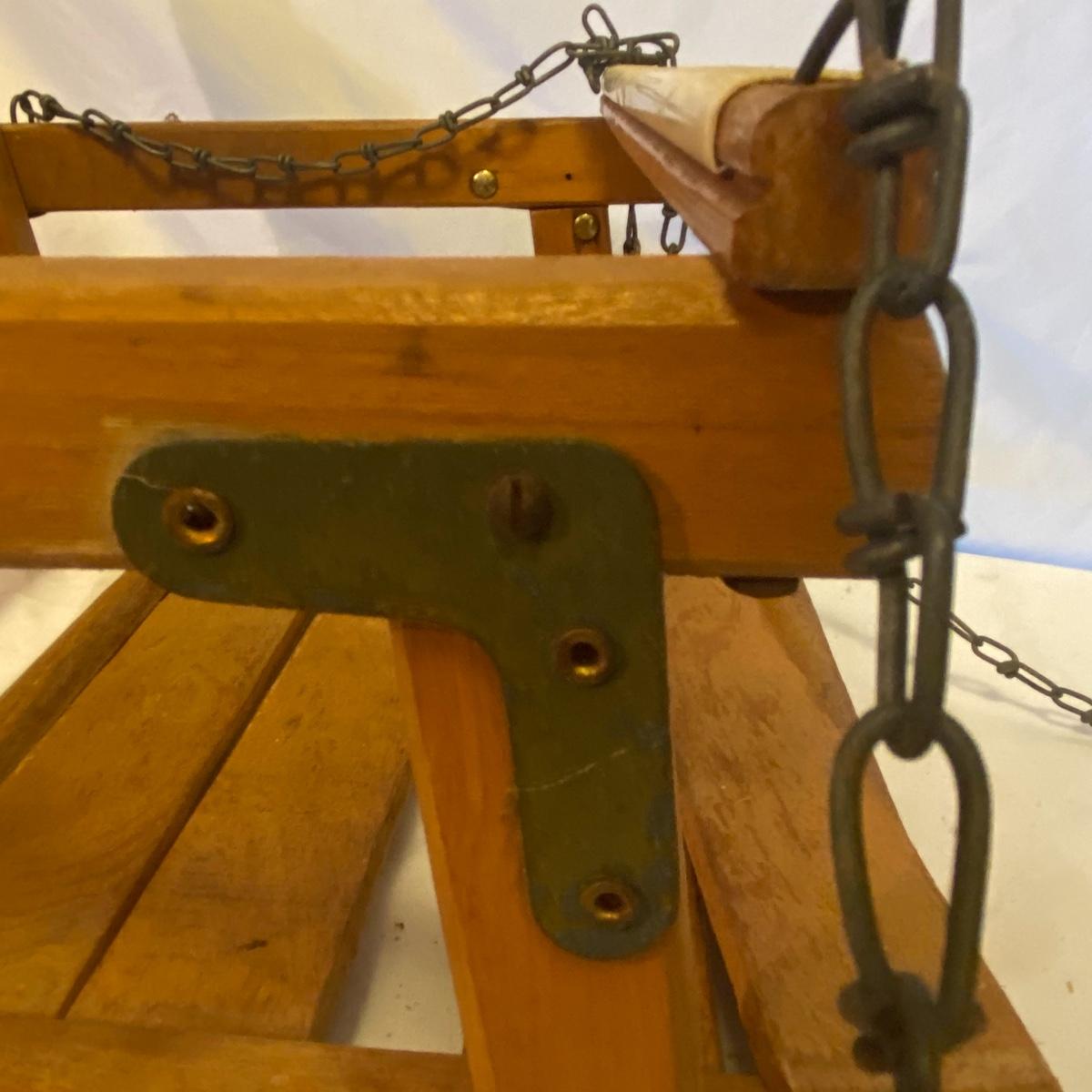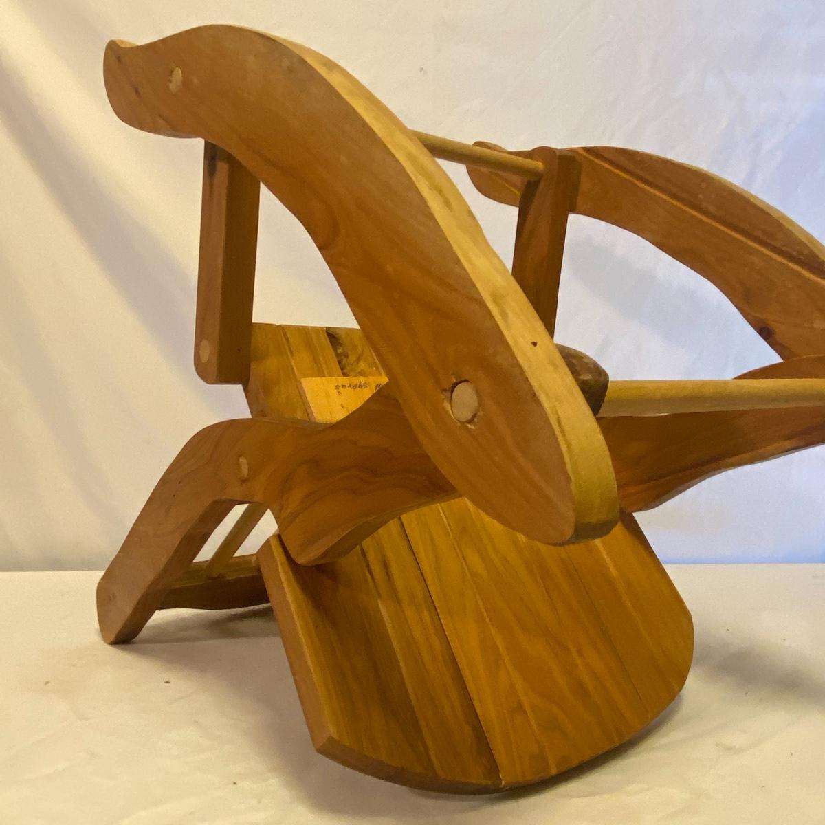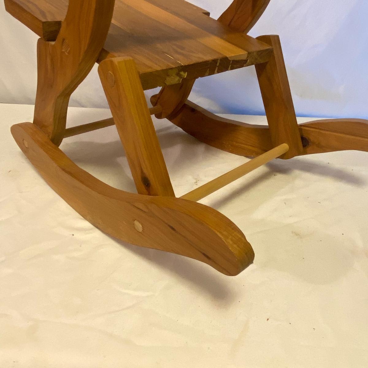 Enjoy three small rocking chairs and one swinging chair. The smallest chair is the small light wooden rocker with no arms; has measurements of 10.5"x18"x17". Largest child's chair measures 17.5"x 23.5"27" and is the darker wood rocker with arms. The swinging chair has chains and attachable s-hooks. Lot also includes a third red rocker with a woven seat and a wooden tray! Disclaimer: chairs have faced aging and damages. Please use caution and repair the swing before child use. The rockers are fairly sturdy and the woven seat is dusty and aging but still intact. Great option for dolls to use. See photos, local pickup only.