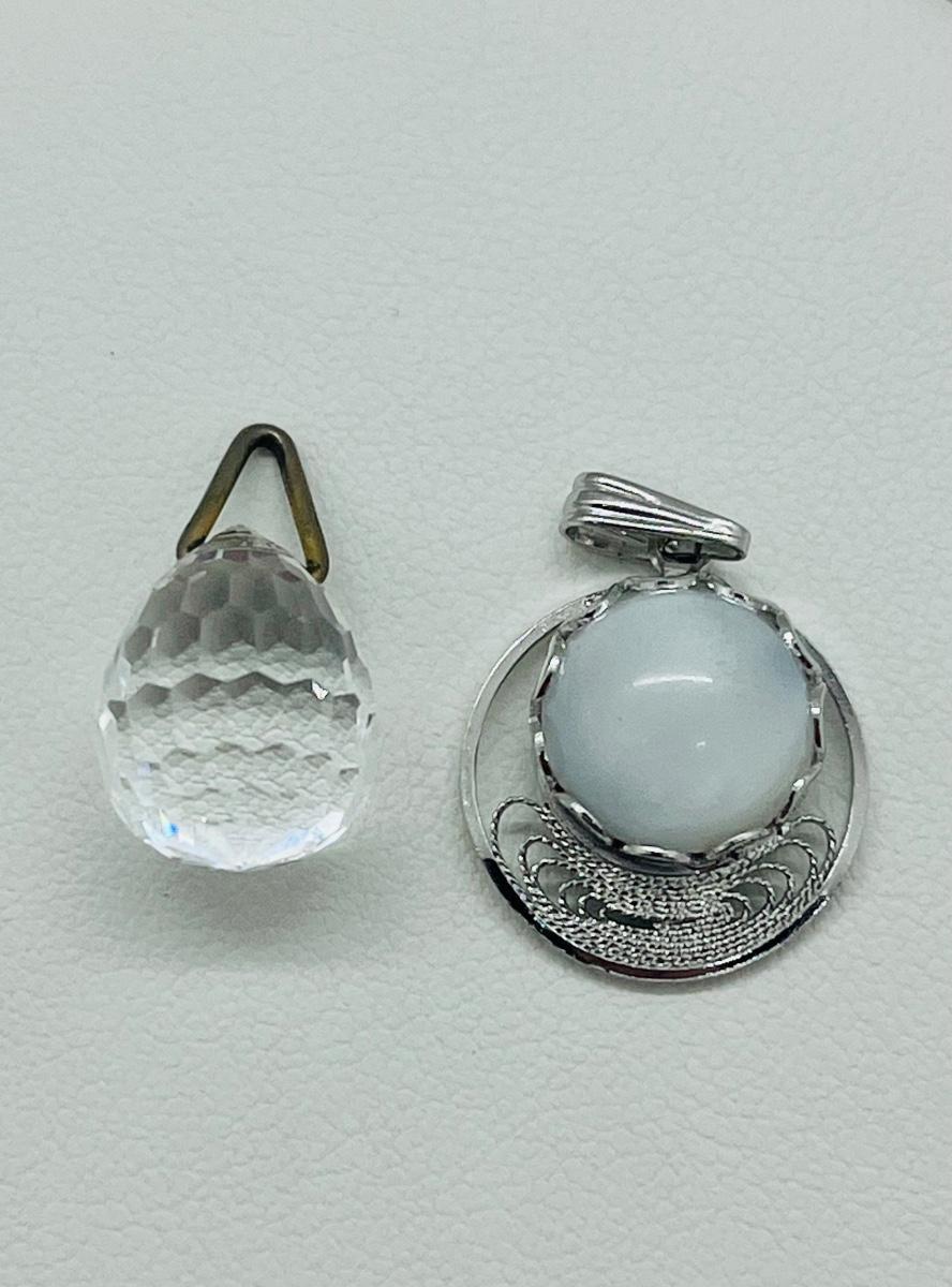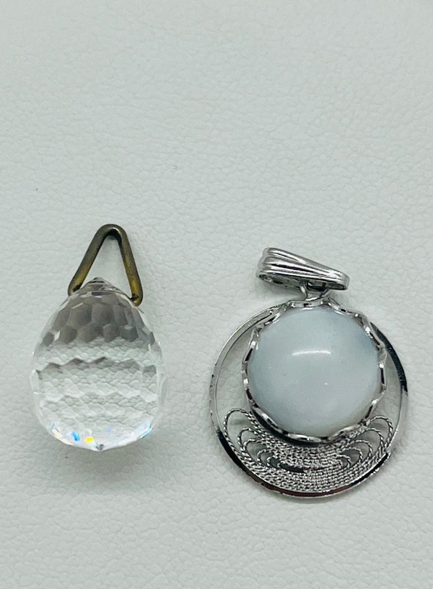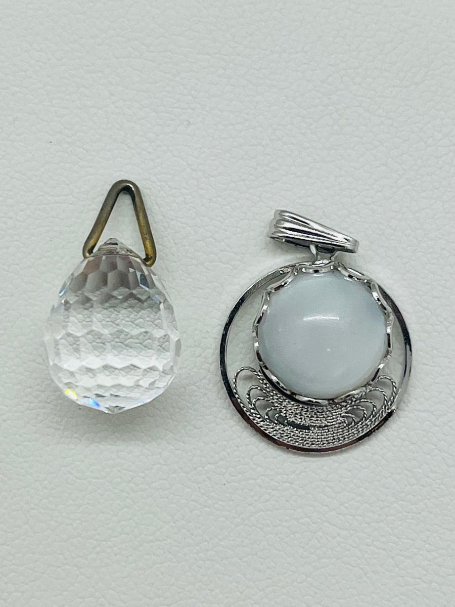 Two pendants one moonstone and silver the other is a crystal. The pictures show condition, measurements if taken, and what is included in the lot. Due to the large amount that we photograph and the time frame, we are not always able to take measurements. All items unless noted, are pre-owned and have been used, and are untested. Thank you