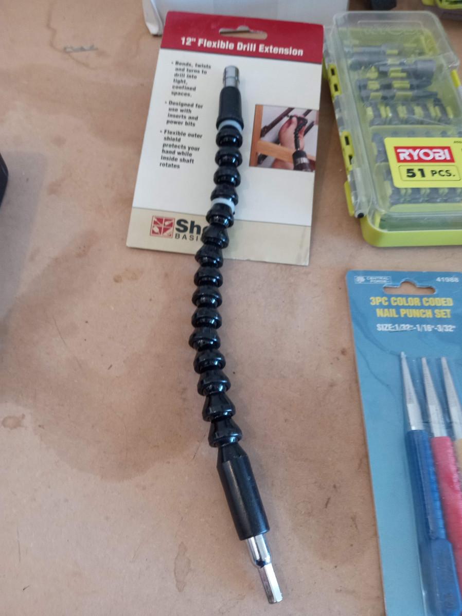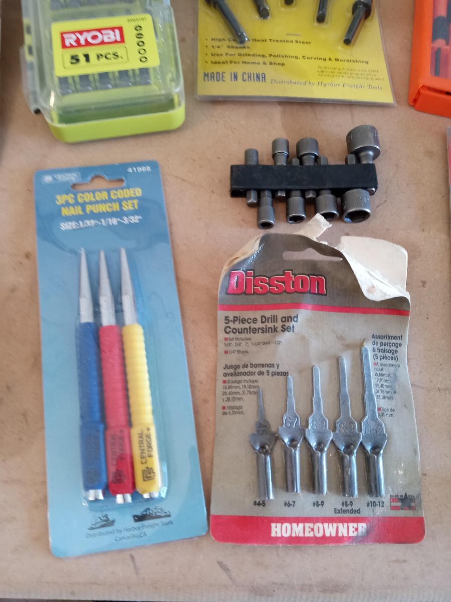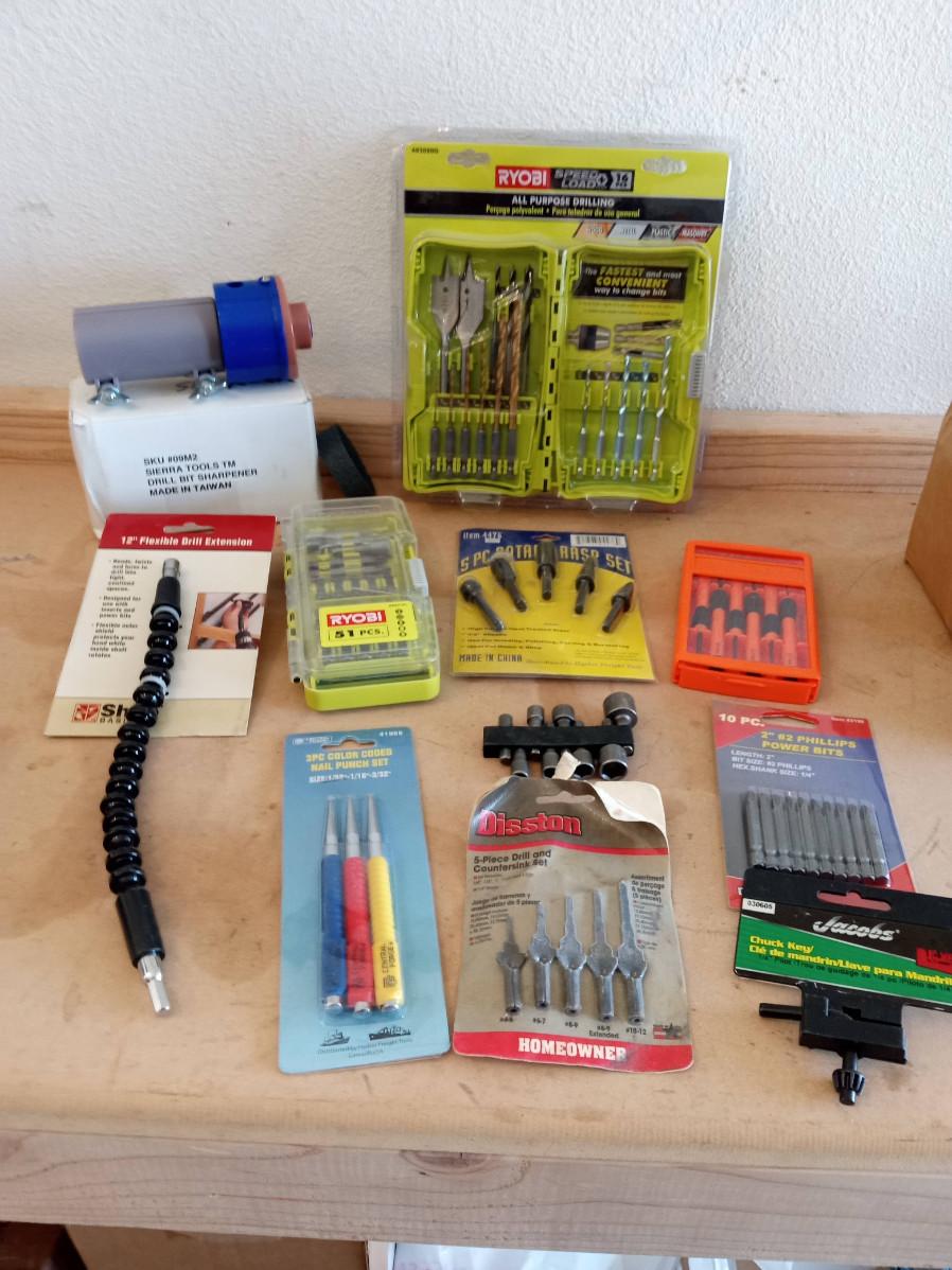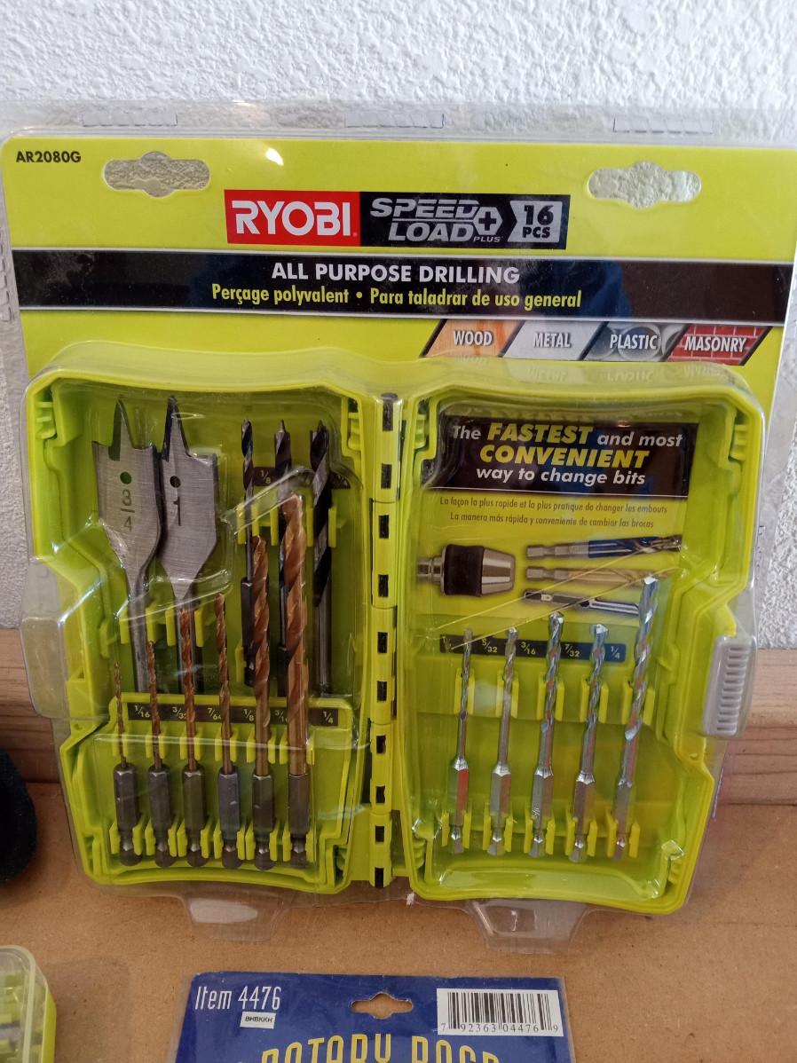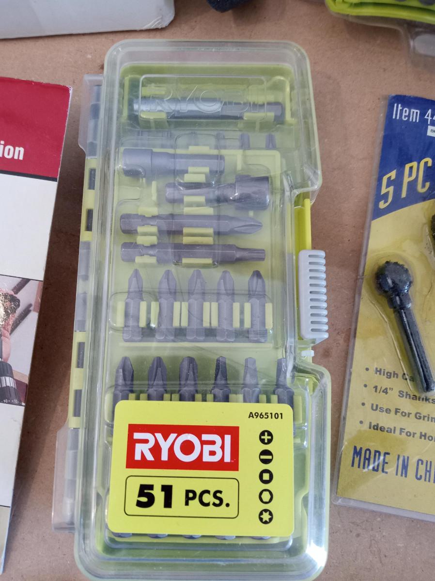 COUNTERSINK SET, NAIL PUNCH SET, NUTDRIVERS, FLEXIBLE DRILL EXTENSION, 51 PC RYOBI BIT DRIVER SET, 5 PC ROTARY RASP SET, PRECISION SCREWDRIVERS, POWER BITS, CHUCK KEY, 16 PC RYOBI SPEED LOAD ALL PURPOSE DRILLING BITS AND A BIT SHARPENER