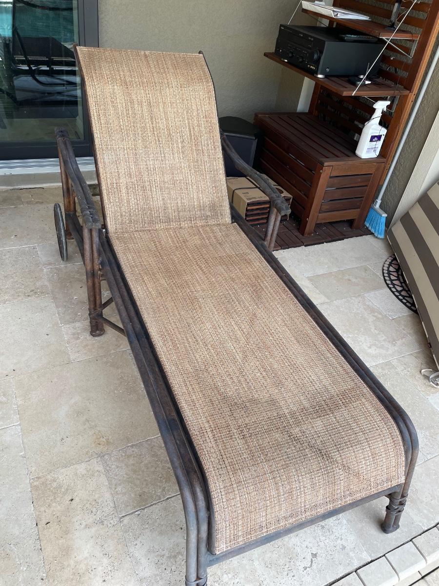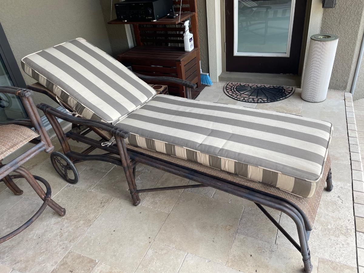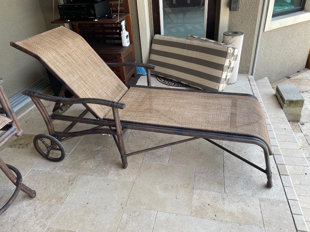 Adjustable back. Aluminum with faux finish. Cushions are included but were not originally sold with it
