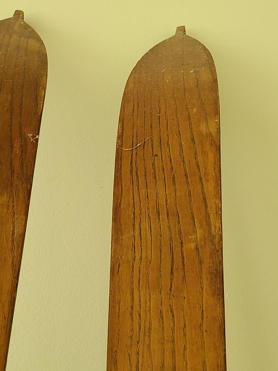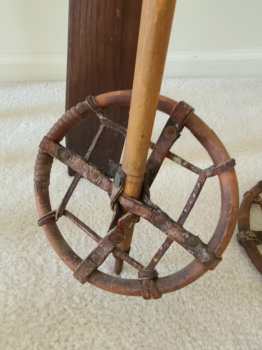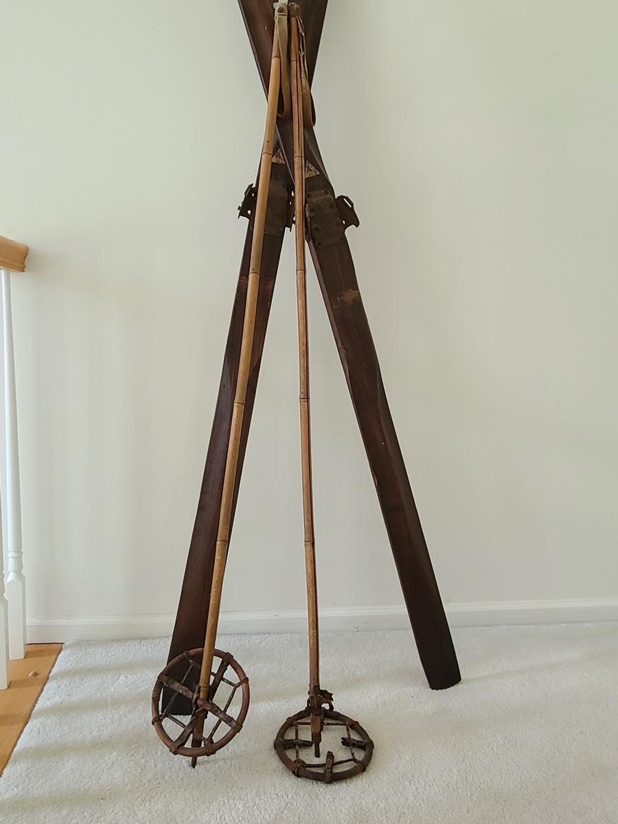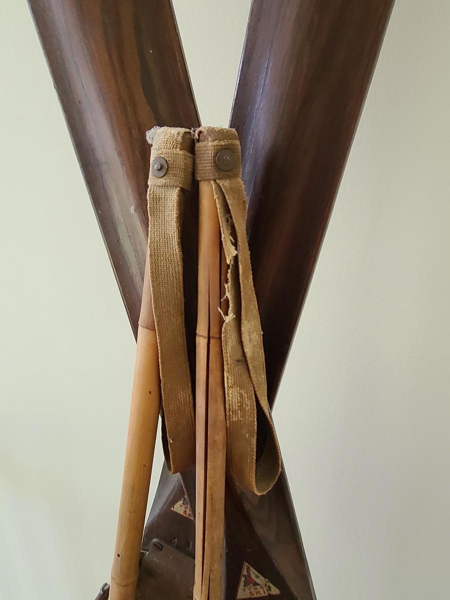 Antique wood skis with poles with leather webs (one is disconnected). These were used as home decor! Please see all pictures for the condition and sizes of the lot.