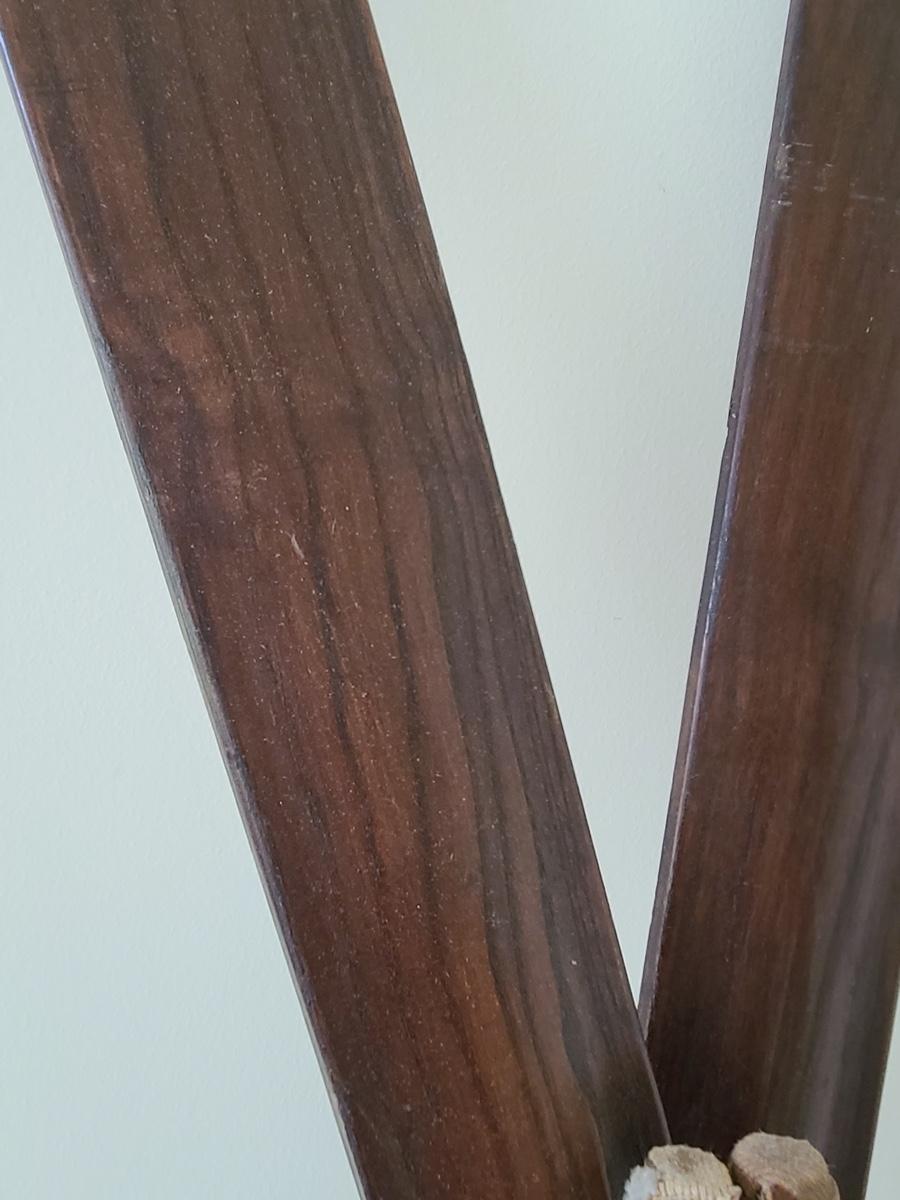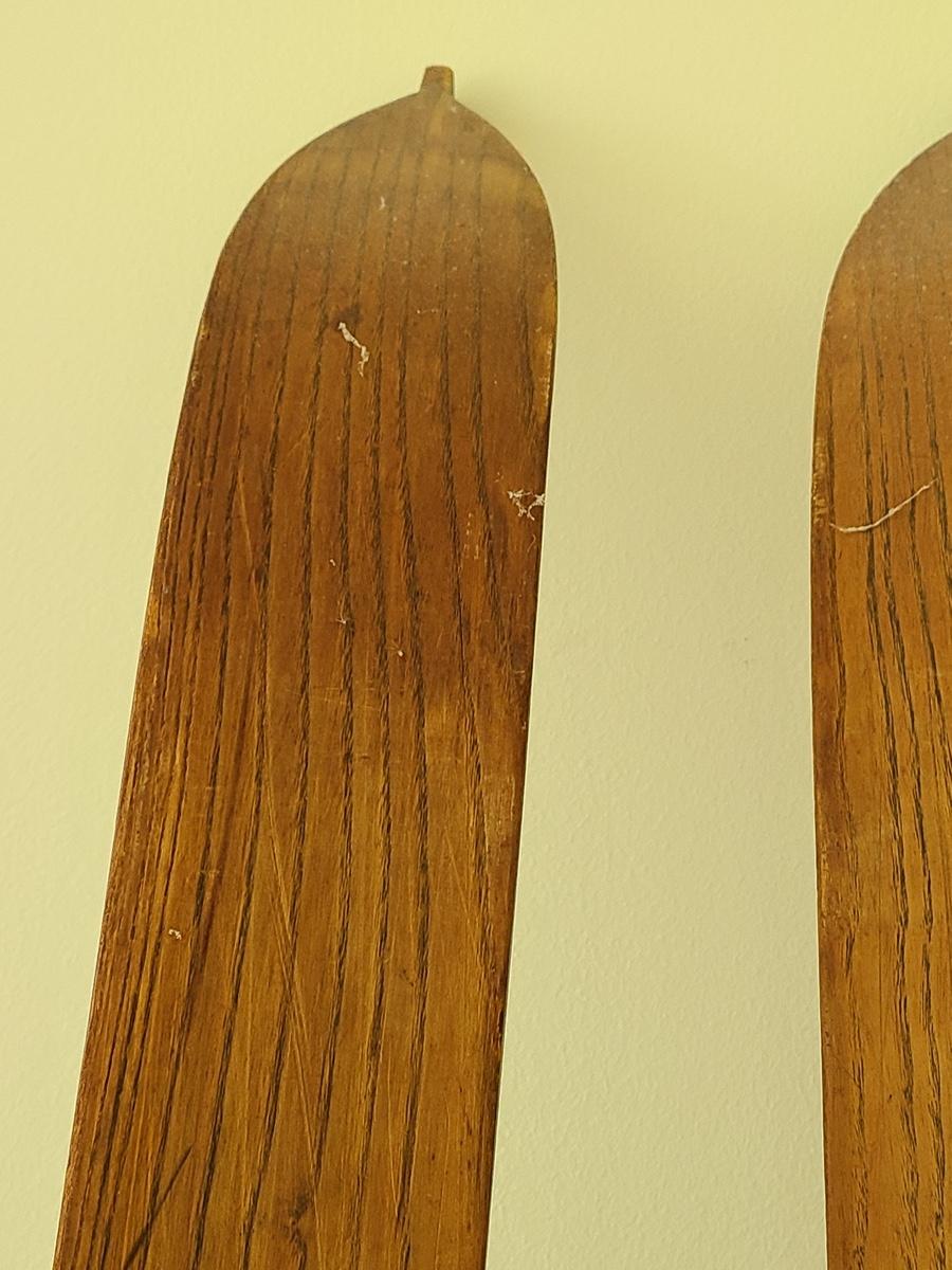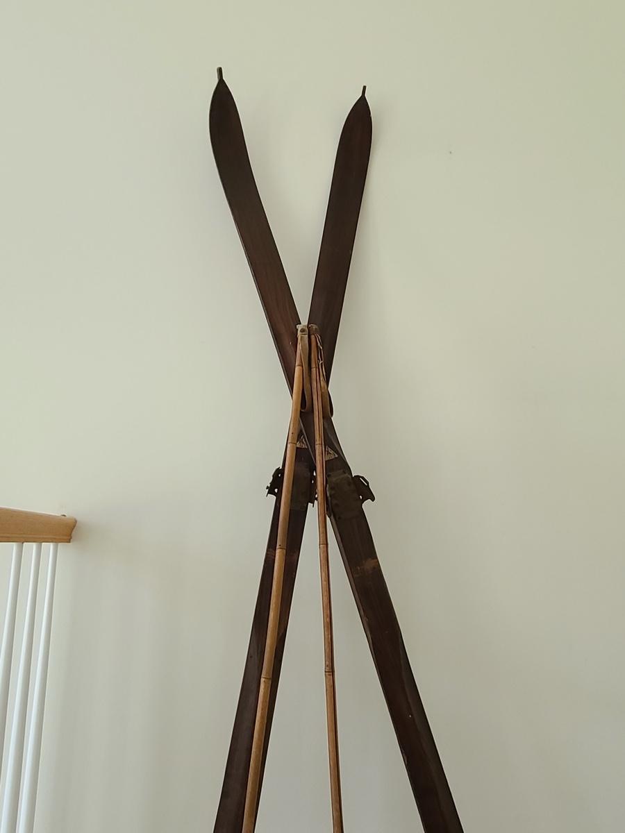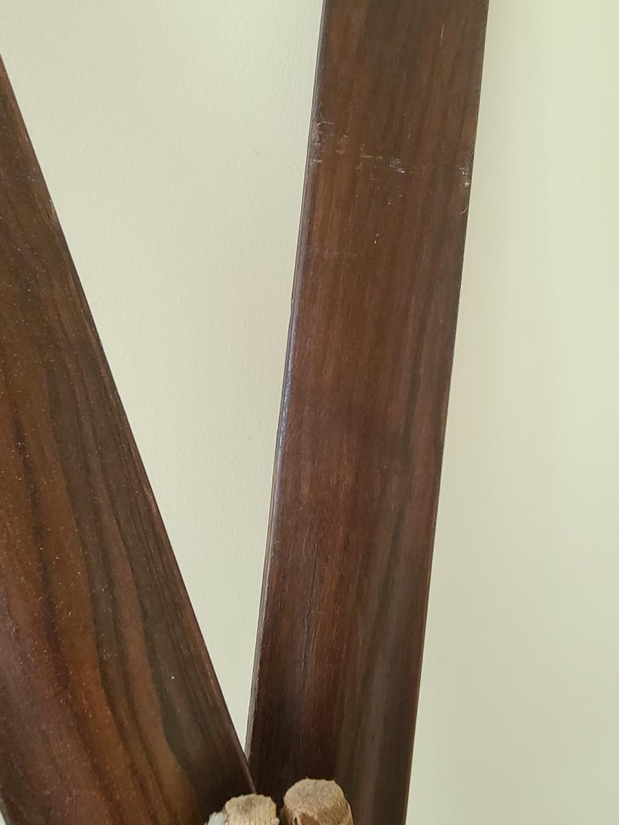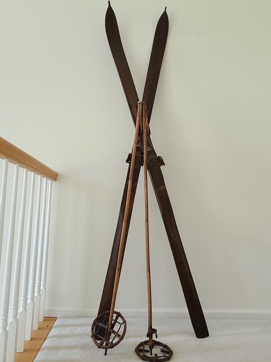 Antique wood skis with poles with leather webs (one is disconnected). These were used as home decor! Please see all pictures for the condition and sizes of the lot.