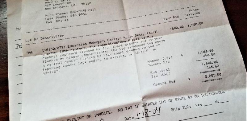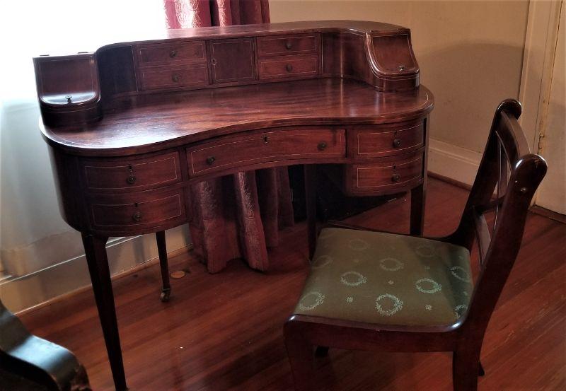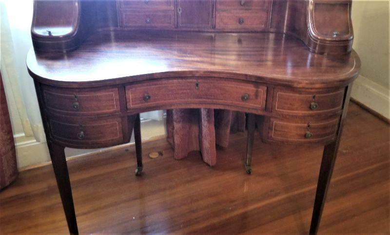 This piece was purchased by my client in 2004 from New Orleans Auction Company for 1600.00 plus buyer's premium (we have the original receipt). Mahogany Carlton House desk, last quarter of 19th century, Top has four short drawers and two hinged compartments, kidney shaped desk has one center drawer and two other drawers on each side. Tapering legs. A restoration company made a repair to the desk in 2007 (receipt available). A very nice piece. It comes with the nice vintage chair you see here. A lovely desk for a lady OR a gentleman. Measures 43.5" across, 20" deep.