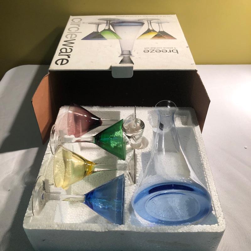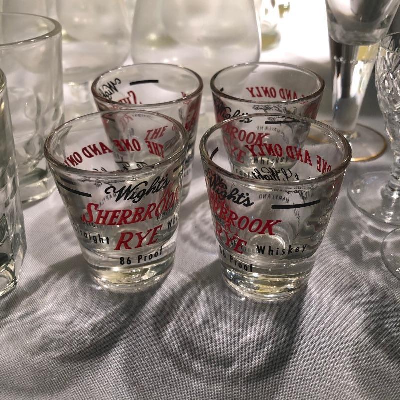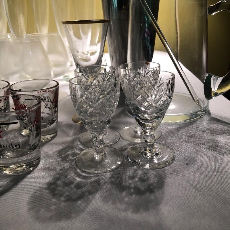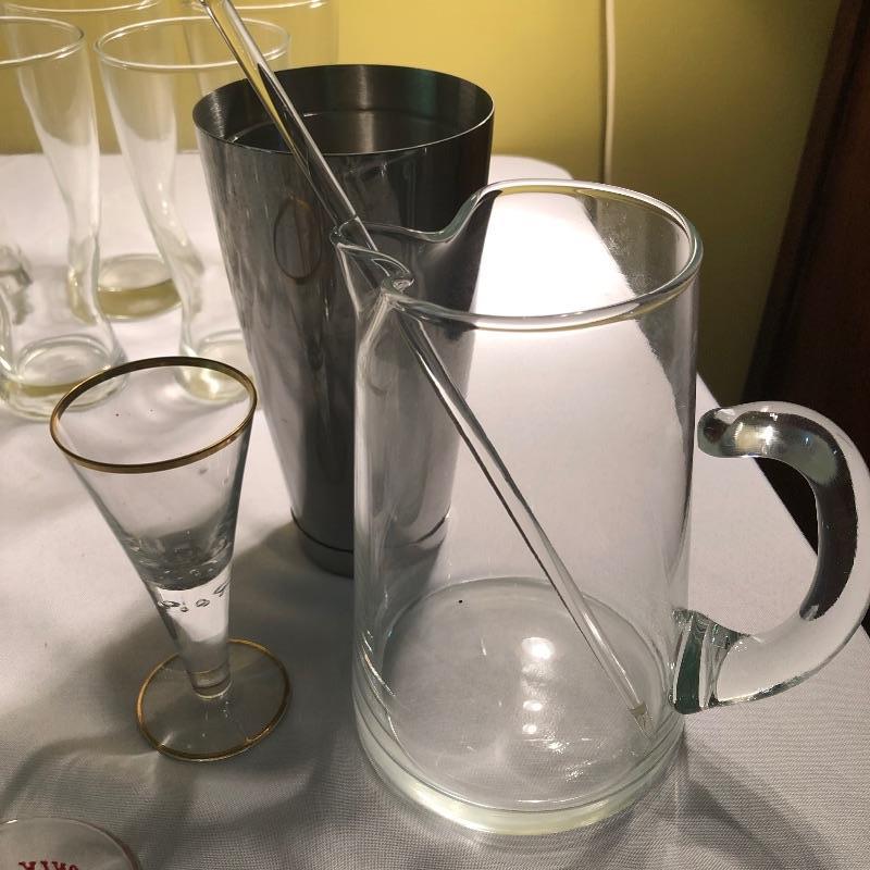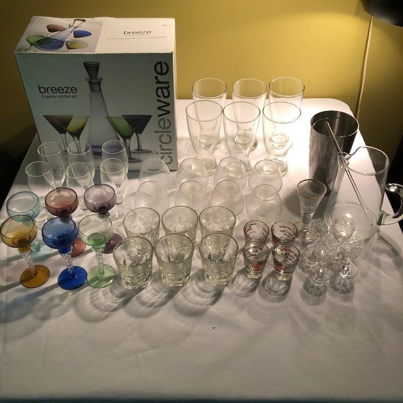 Large set of bar glassware and Breeze 5 piece cordial set. This lot includes six chalice-style glasses, six regular drinking glasses, four Sherbrook Rye shot glasses, four chalice-style shot glasses, eight circular wine glasses, six long stem wine glasses, six beer glasses (6.5”, tallest glass), a metal cocktail shaker, a glass mixing pitcher, and the 5 piece cordial set with four cordial glasses and a decanter. All pieces are in very good condition with no scratches or cracks. Local pickup only.