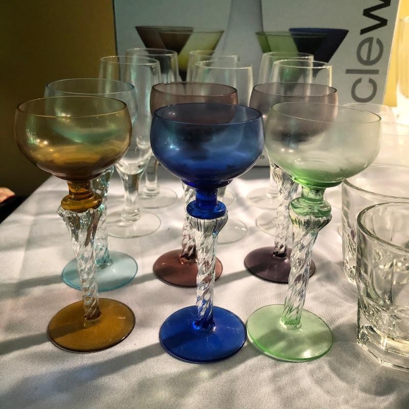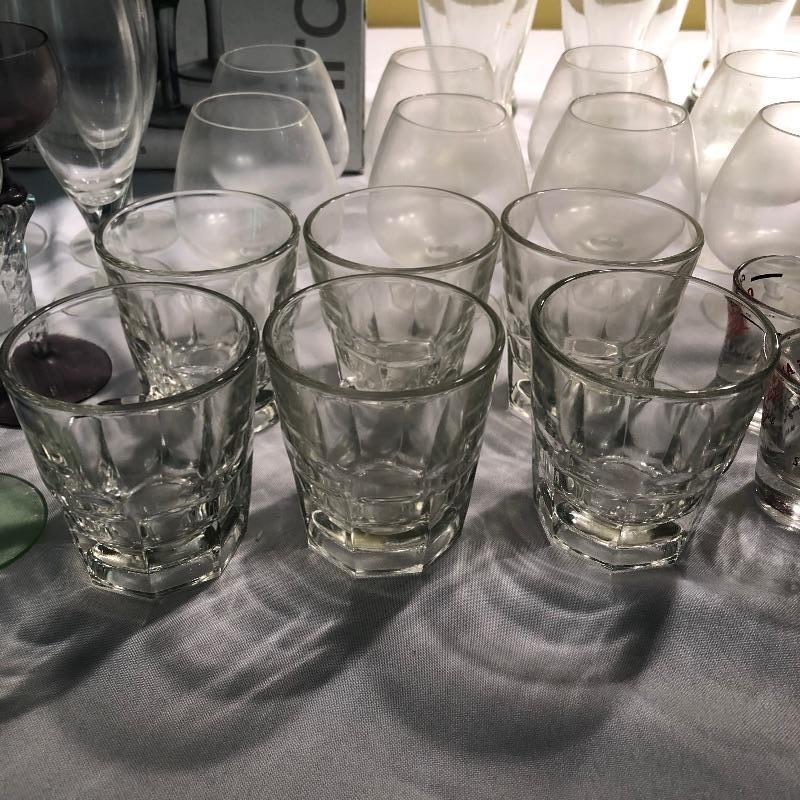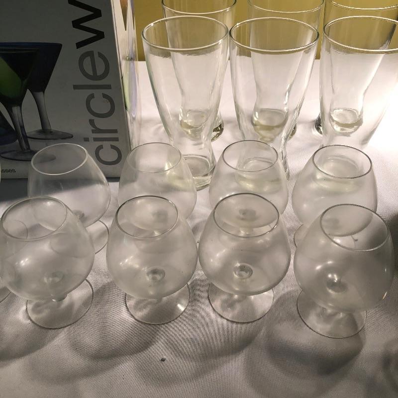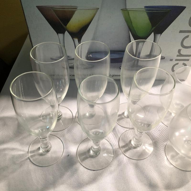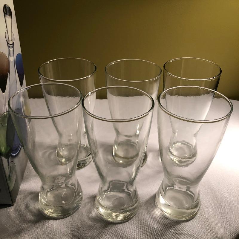 Large set of bar glassware and Breeze 5 piece cordial set. This lot includes six chalice-style glasses, six regular drinking glasses, four Sherbrook Rye shot glasses, four chalice-style shot glasses, eight circular wine glasses, six long stem wine glasses, six beer glasses (6.5”, tallest glass), a metal cocktail shaker, a glass mixing pitcher, and the 5 piece cordial set with four cordial glasses and a decanter. All pieces are in very good condition with no scratches or cracks. Local pickup only.