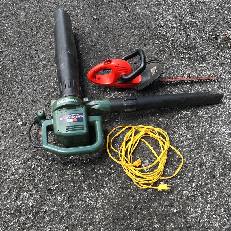 Two electric gems from Black & Decker! An 18” Black & Decker hedge trimmer for your sculpting desires! Once you’ve trimmed everything, clean it up easy with this Super Vac’N’Mulch Blower/Vacuum with accessories! Vortex vacuum is missing bag, but a quick internet search finds there are plenty out there. We’ve added a small extension cord, just in case. Model numbers shown in photos. Both tools powered on when tested. See photos. Local pick up only.