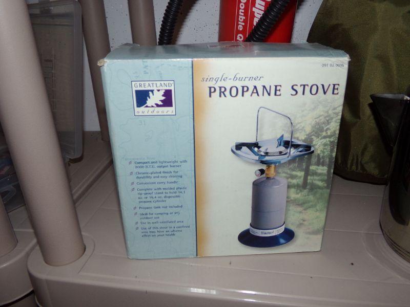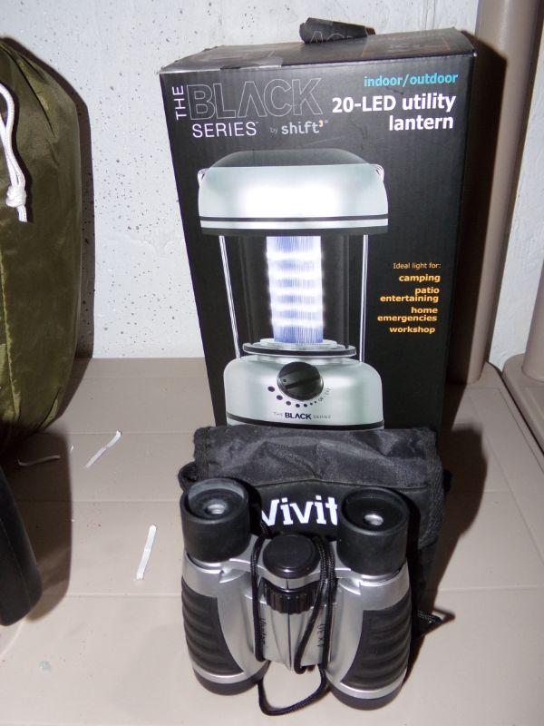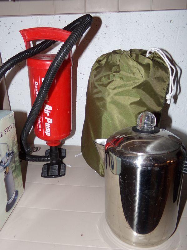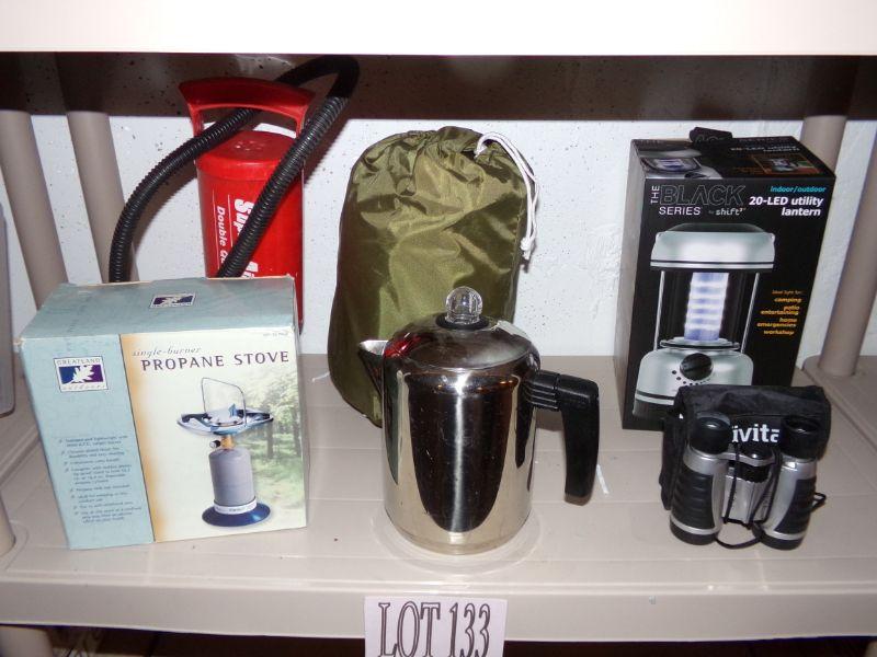 3 PAIRS OF BINOCULARS, FOOT PUMP, ATV COVER, PROPANE STOVE, LED LANTERN AND COFFEE POT