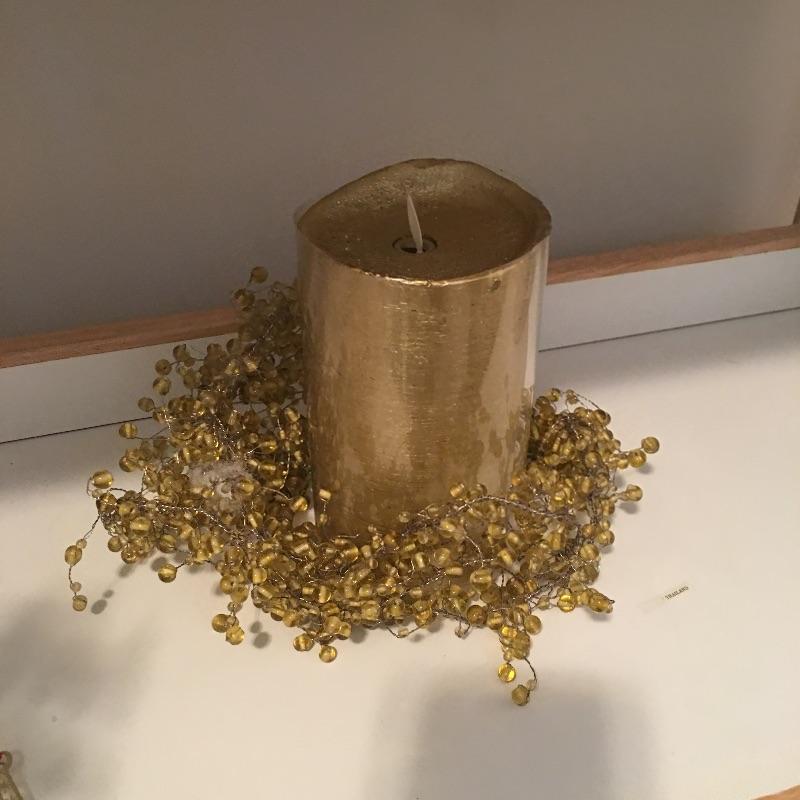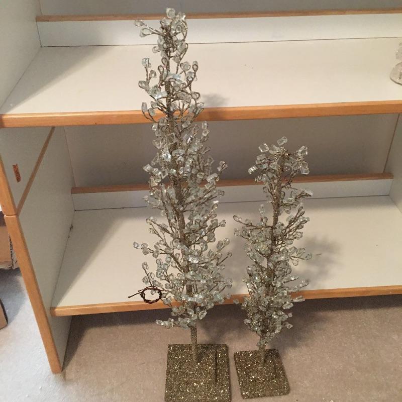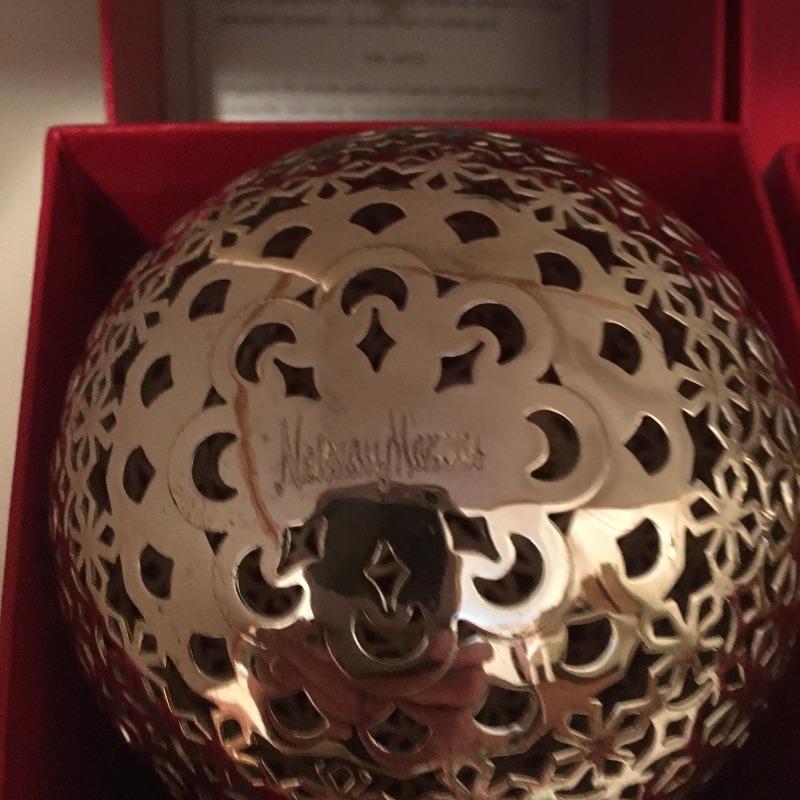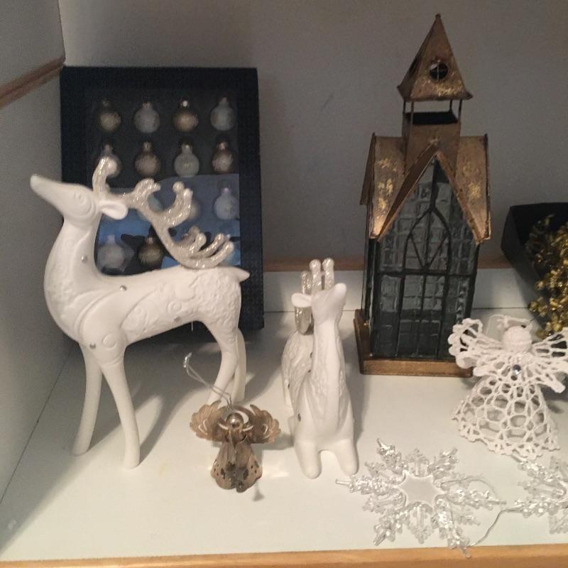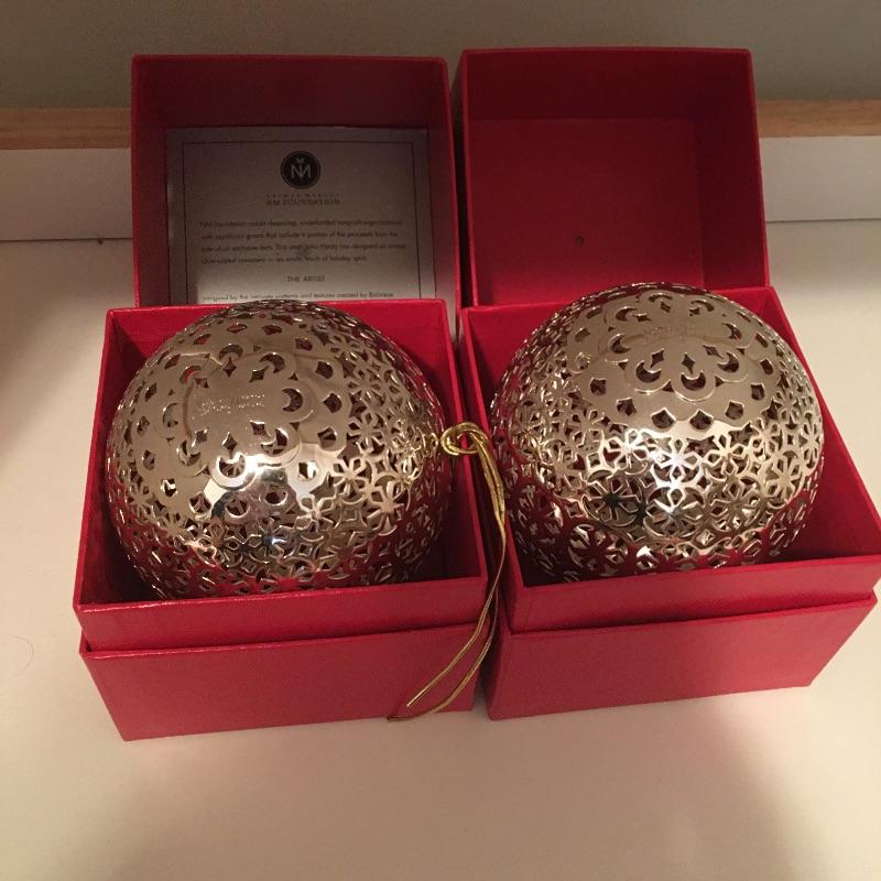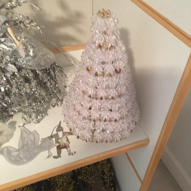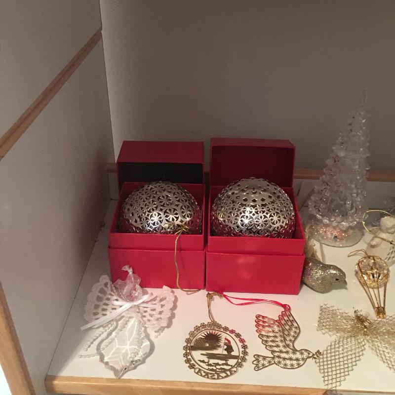 So many beautiful Christmas decorations including a pair of Neiman Marcus ornaments in boxes, lighted tree, glass beaded garland, candle holders, battery powered candles, and a plethora of ornaments and baubles.