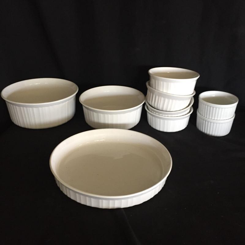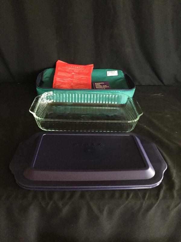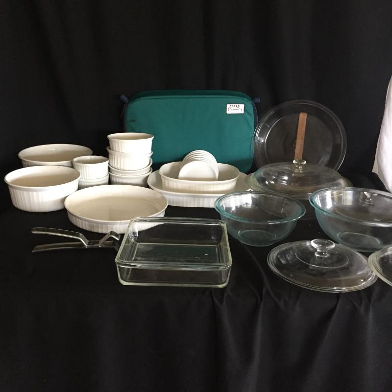 A Large Array of Corning Ware and Pyrex. Pyrex lids,Pie Dish,Three Nesting Bowls,Portable Pyrex With Carrying Case. Assortment of Corning Ware. Portable Pyrex Measures 13” x 9”.