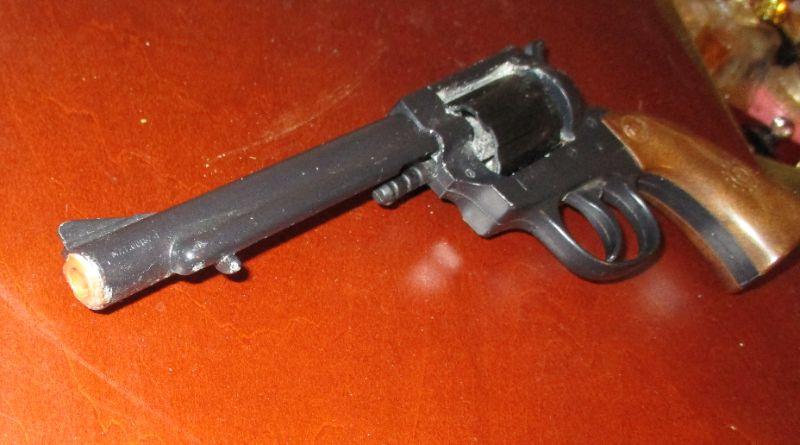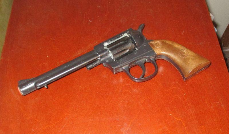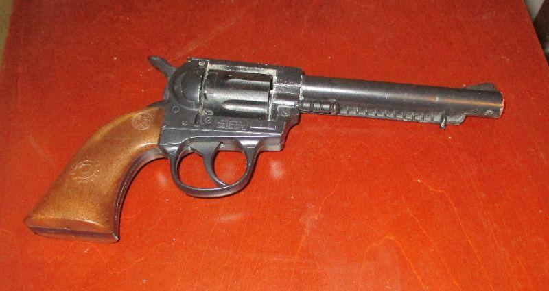 This gun is marked Edison Made in Italy. The body of the gun is metal, but the handle is plastic. Needs a bit of cleaning from use, but the trigger works well.