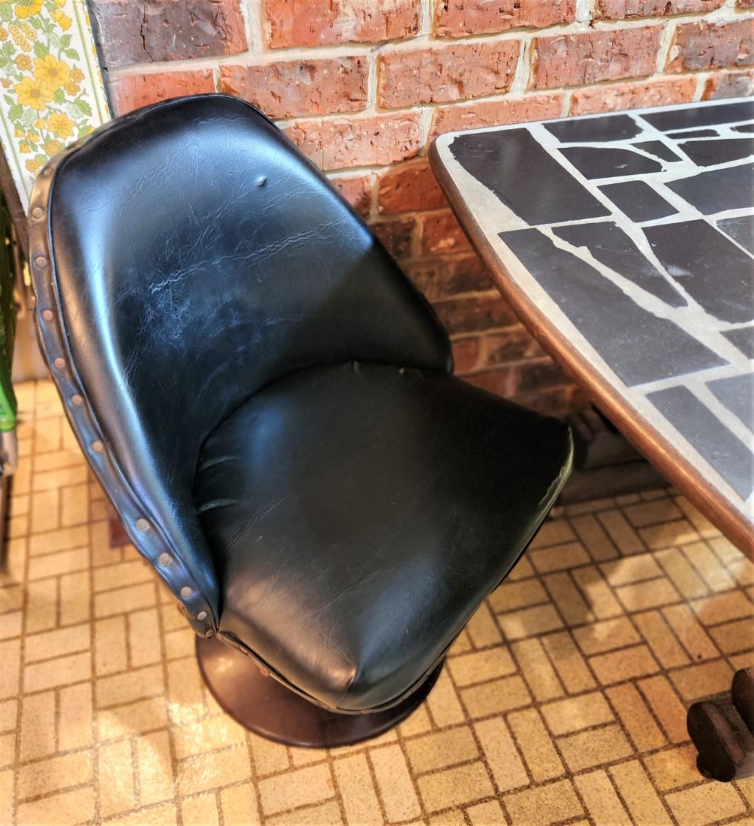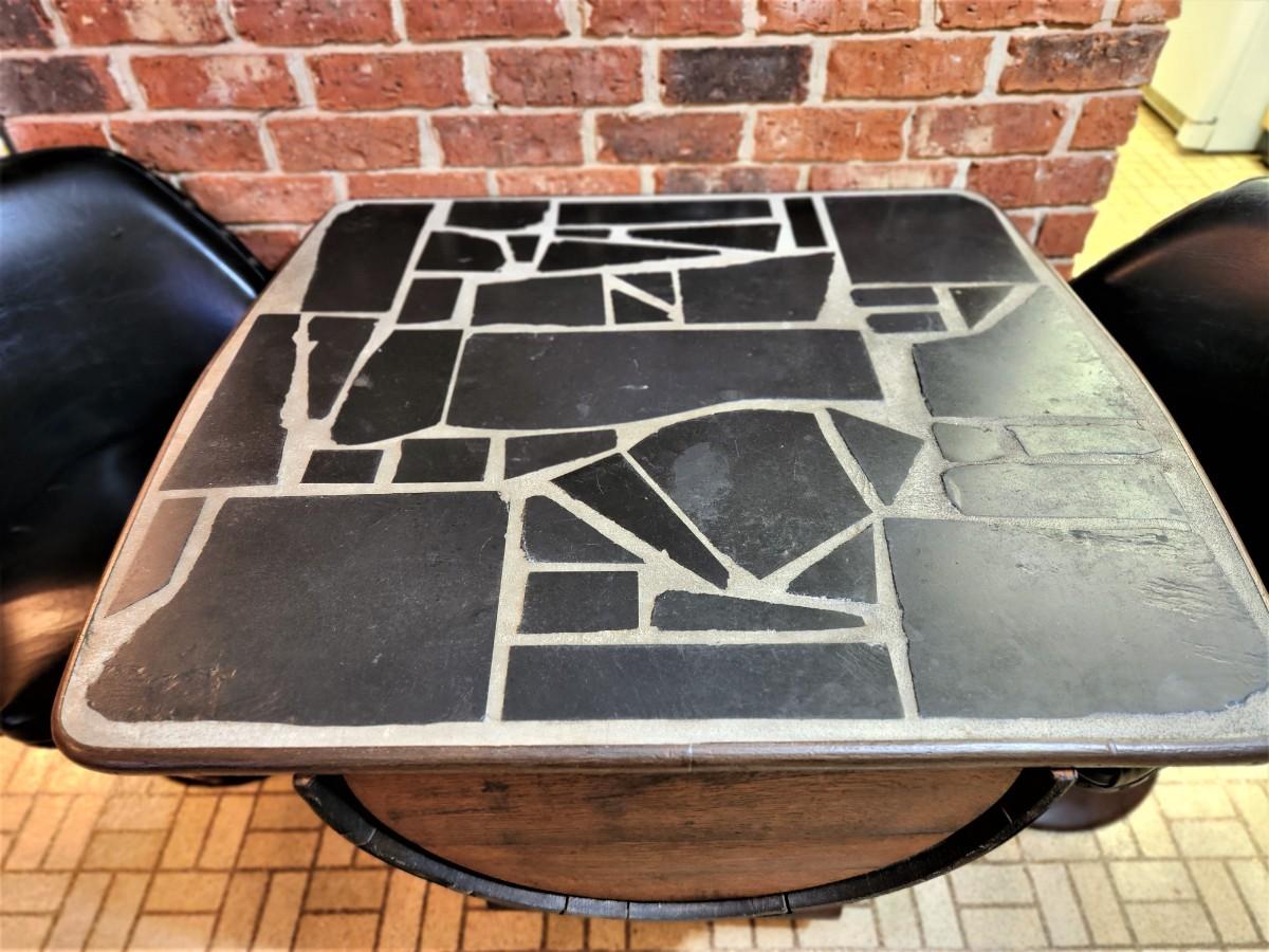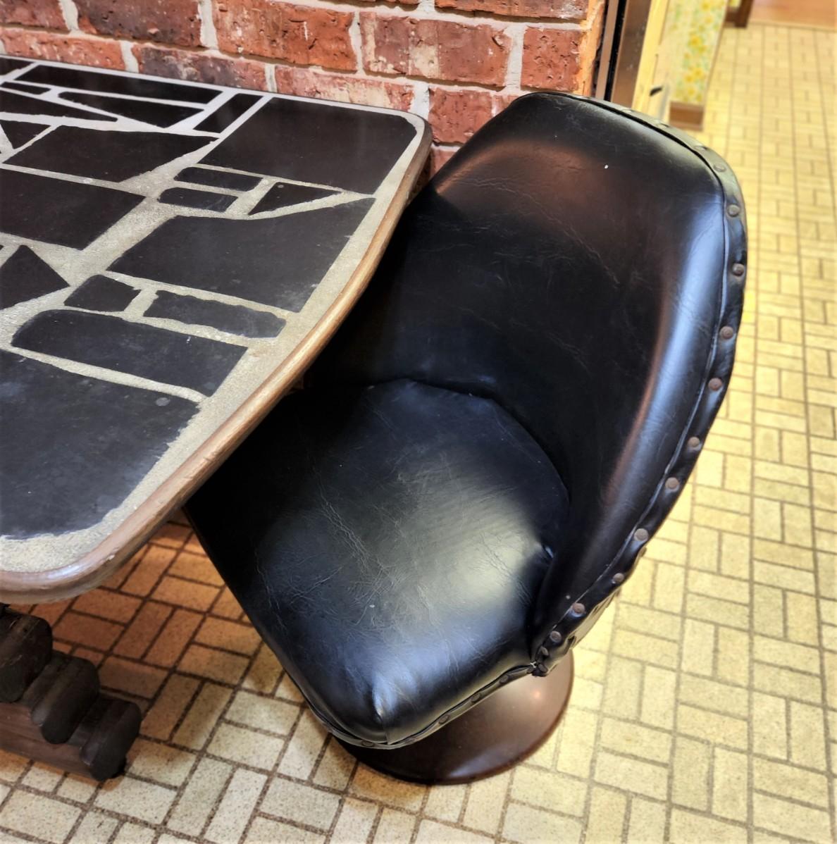 A match to the one earlier in the sale - great barrel table with black slate top, two matching barrel back chairs. Table is 40" across, 29" tall. All in good vintage condition. Perfect for a home bar or man-cave. Well made and sturdy.