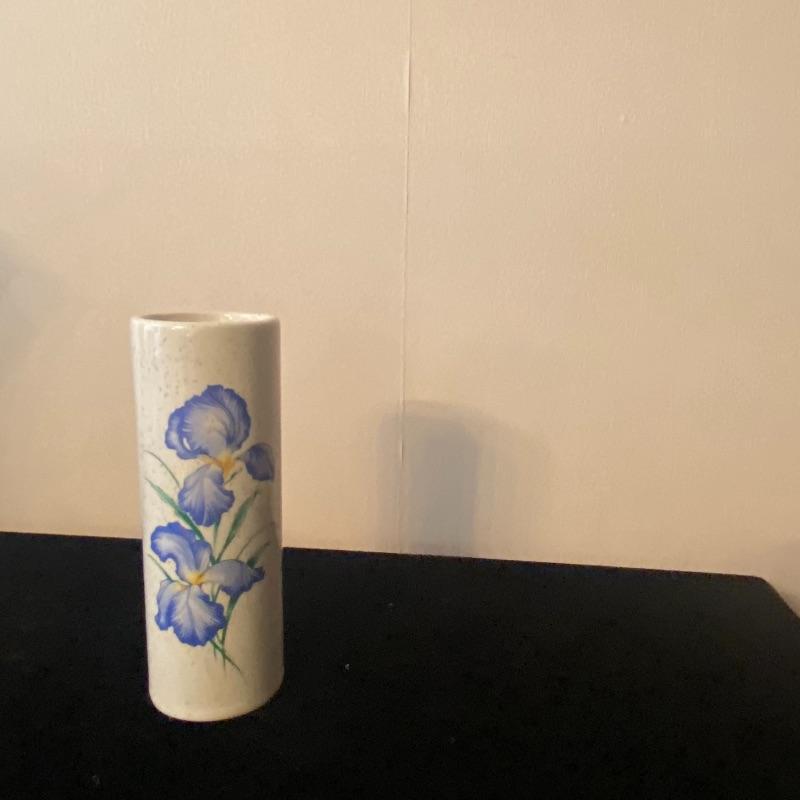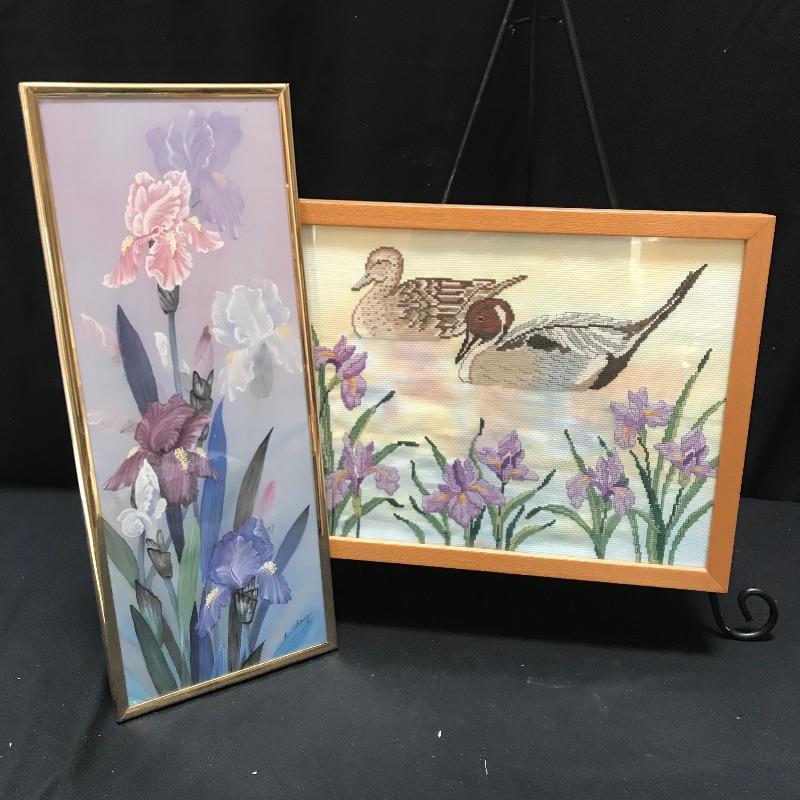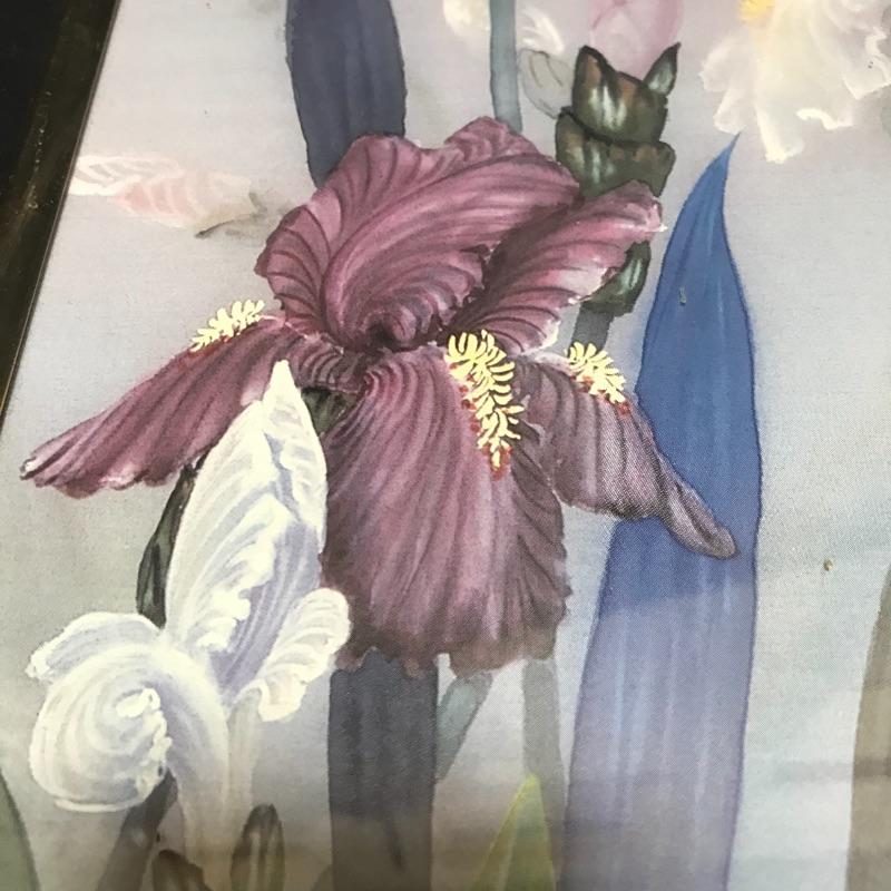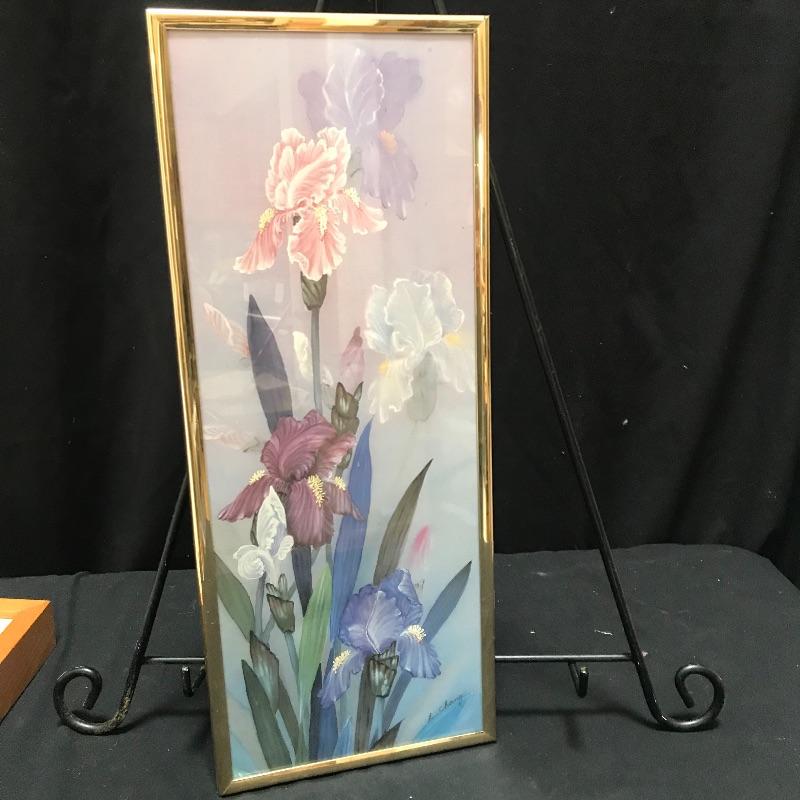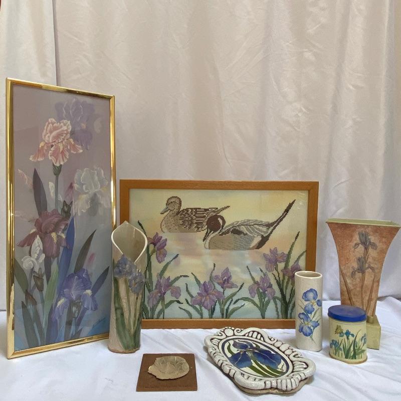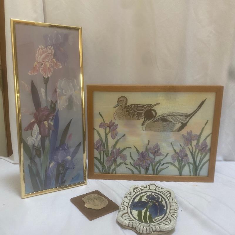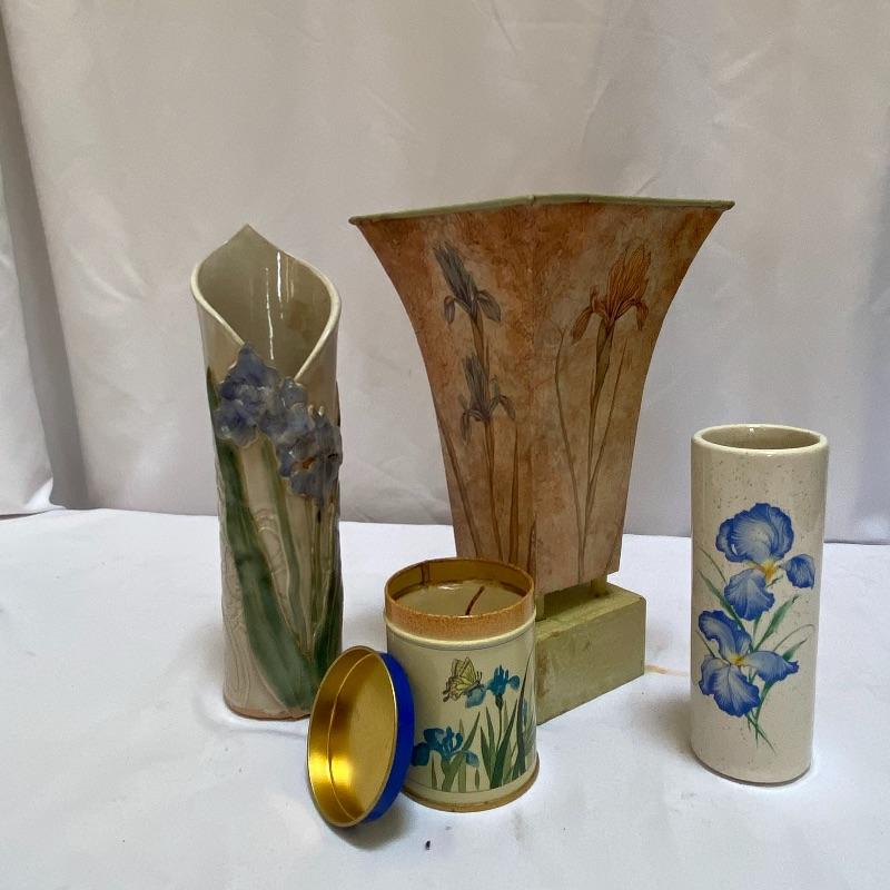 Step into this Iris wonderland! Lot includes two framed pieces of art (one is cross stitch art with wood frame), two pottery vases, a tall square metal painted vase, two small peices of art, and a candle in a metal lidded tin.. Moorefield pottery stands 9 inches high, tallest art with a metal frame 20” x 8”. Local pick up only.
