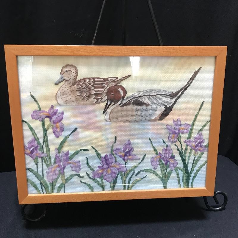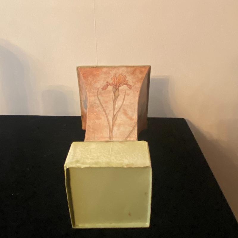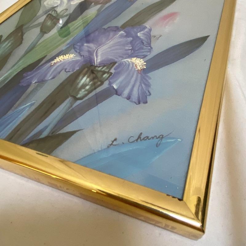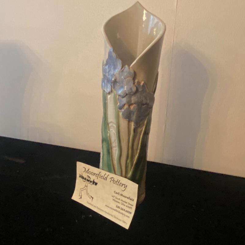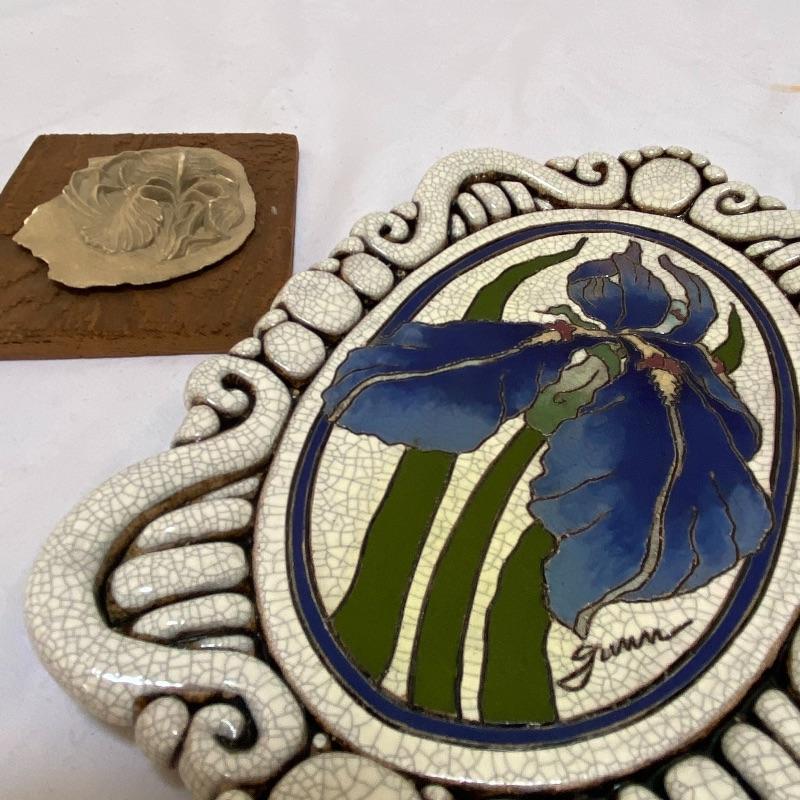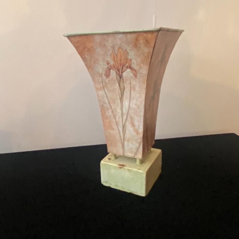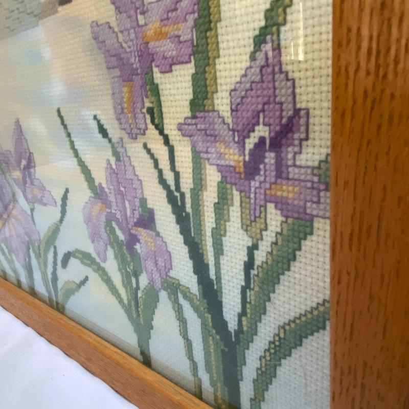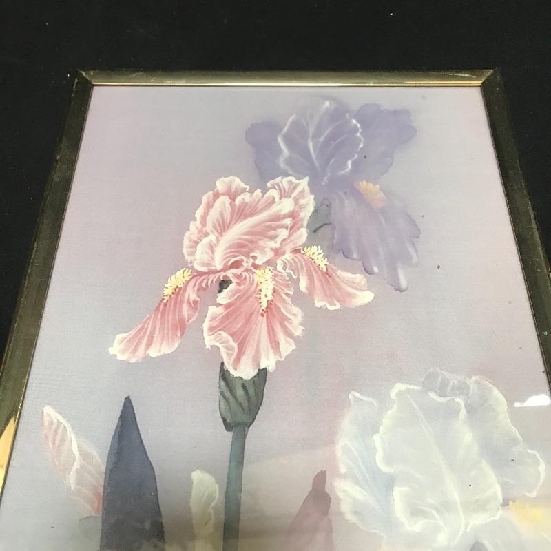 Step into this Iris wonderland! Lot includes two framed pieces of art (one is cross stitch art with wood frame), two pottery vases, a tall square metal painted vase, two small peices of art, and a candle in a metal lidded tin.. Moorefield pottery stands 9 inches high, tallest art with a metal frame 20” x 8”. Local pick up only.