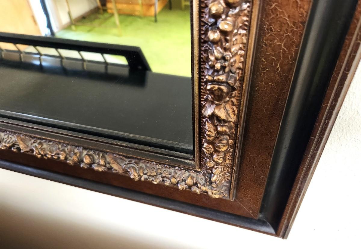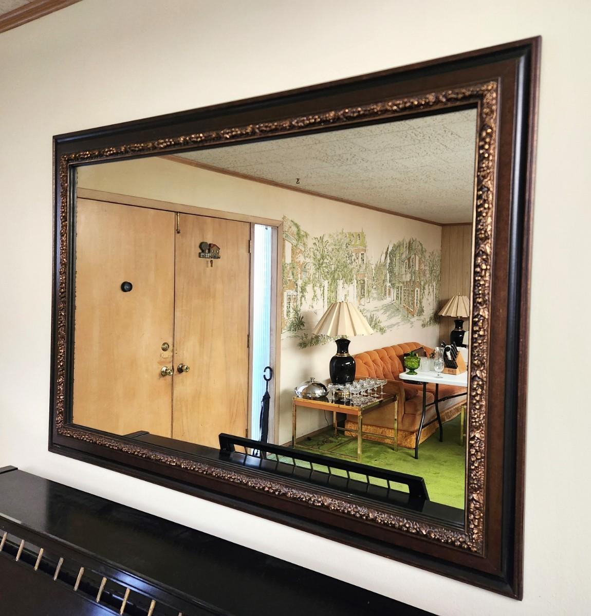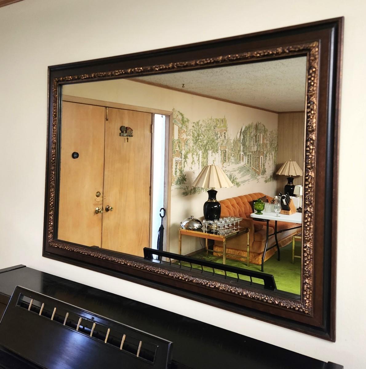 Looks like wood.....but it's plastic. You have to touch it to know. Minor scratch to frame. Measures 55.5" across, 37.5" tall. Mirror nice and clear.