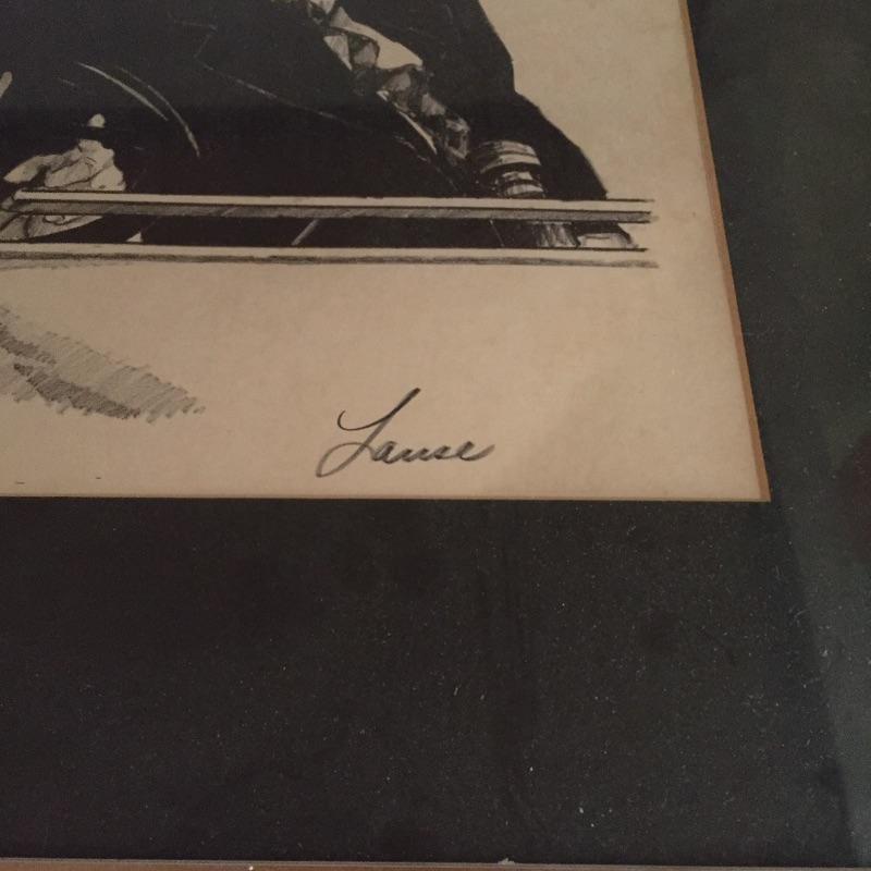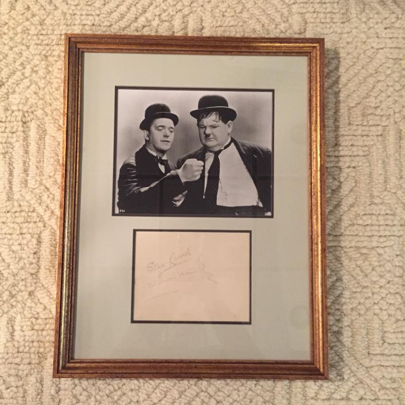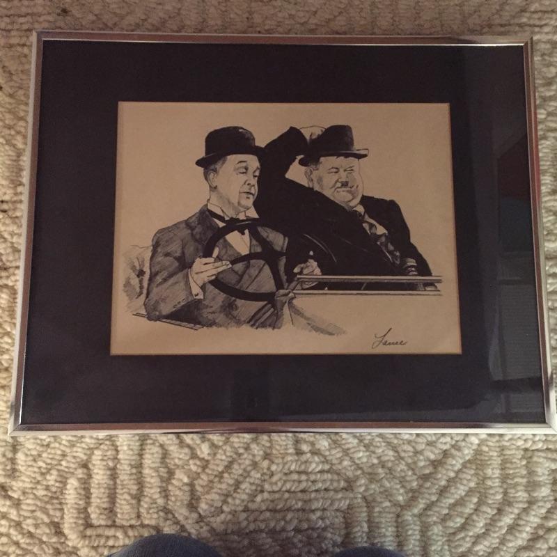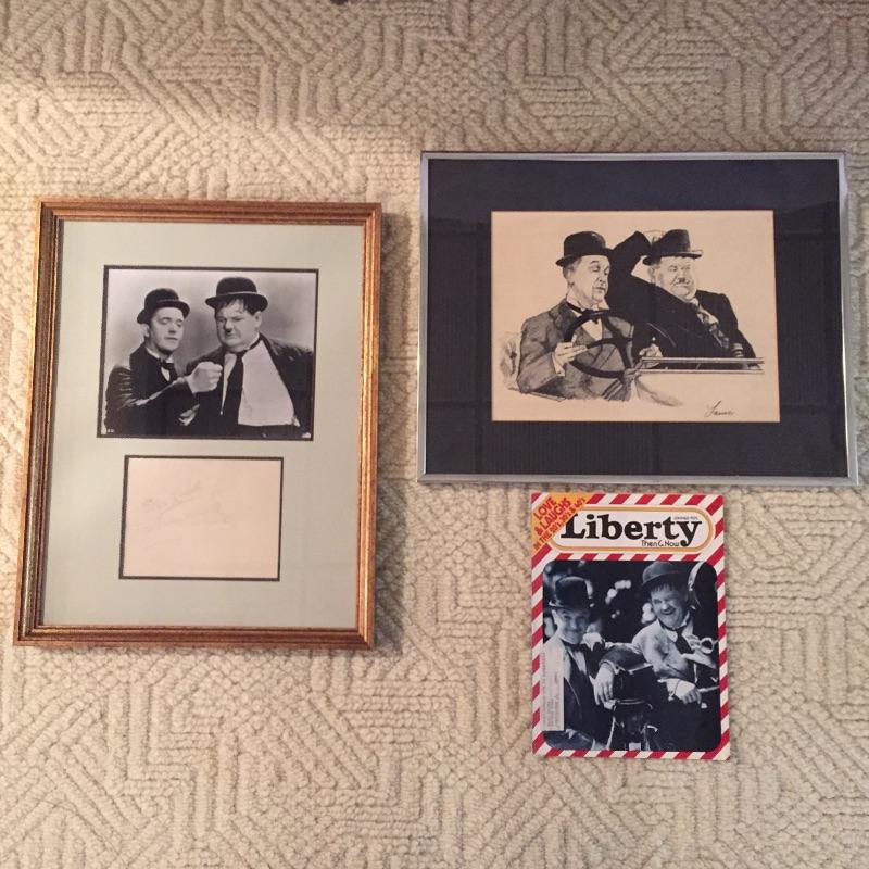 Lot includes Laurel and Hardy signed and framed photo(no COA). Also has a really great framed art piece by Lanse. Looks like Pencil/Ink. You'll also find a Liberty magazine with an article on the duo. Don’t miss out on this collection of this iconic duo. Framed photo measures 15” x 19”.