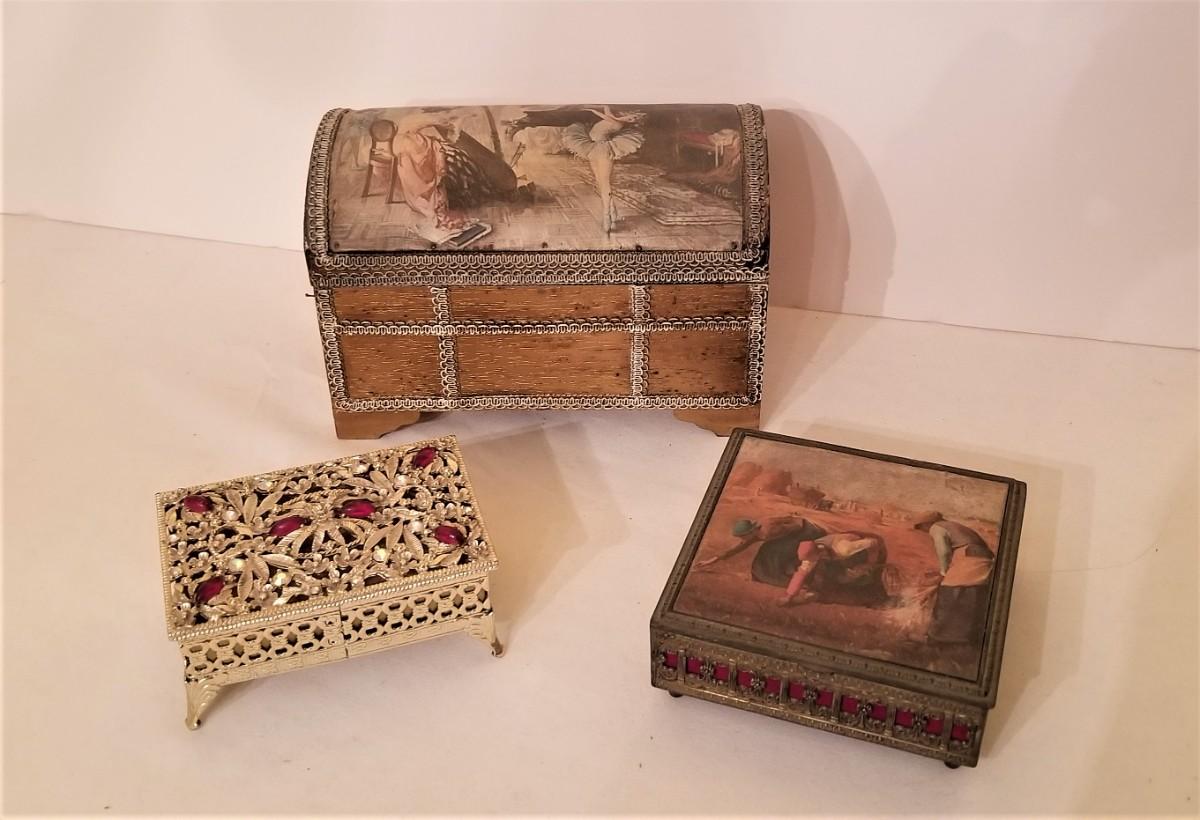 Lot of 3 vintage Dresser boxes - Domed one is musical, plays "Some Enchanted Evening", 5.5" tall. Box on right has a padded fabric top, 4.75" x 4.75", the one on the left has a lift off lid with faux "jewels", 4.5", 3" tall. All in vintage condition.