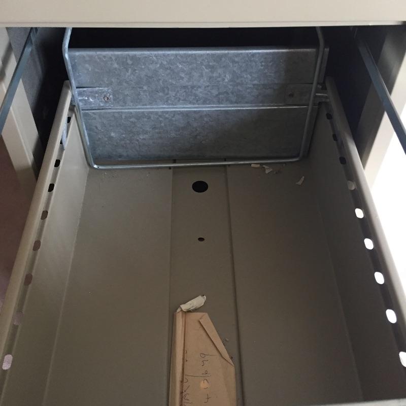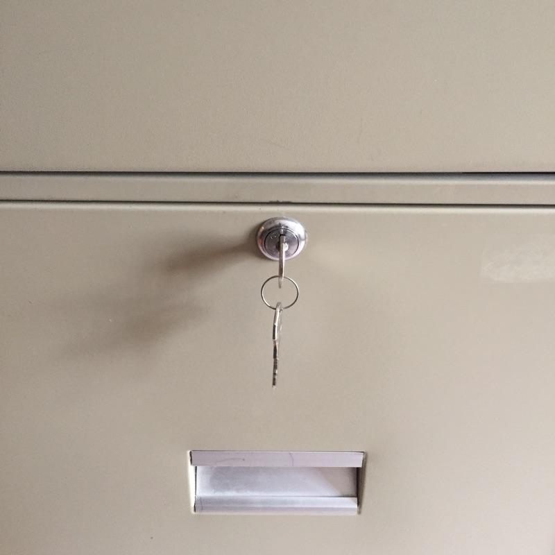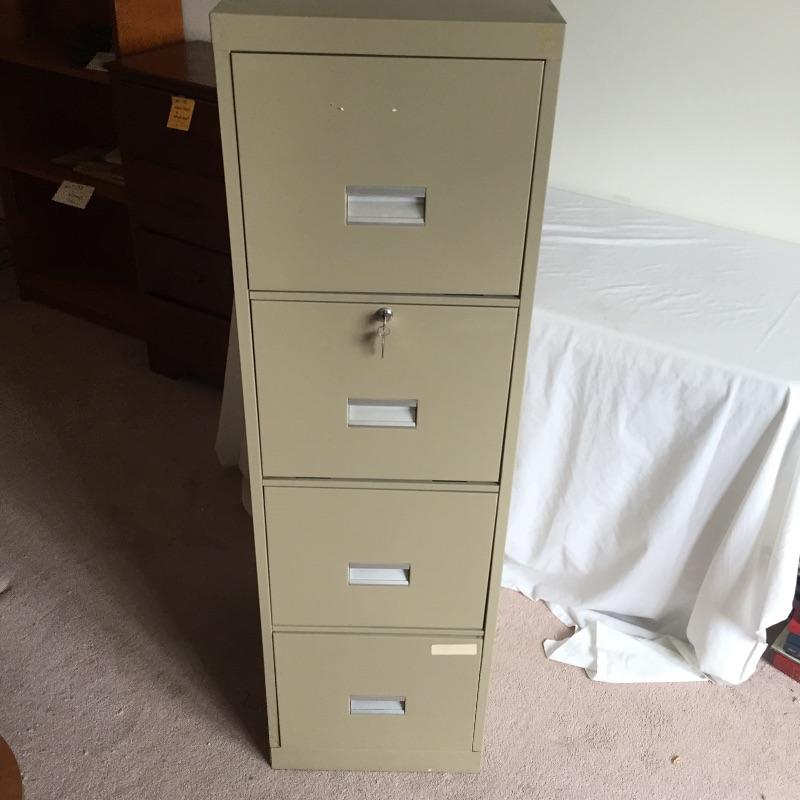 Four drawer metal file cabinet with keys. Cabinet measures 15.5” x 18” x 52”.