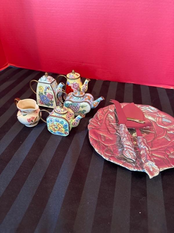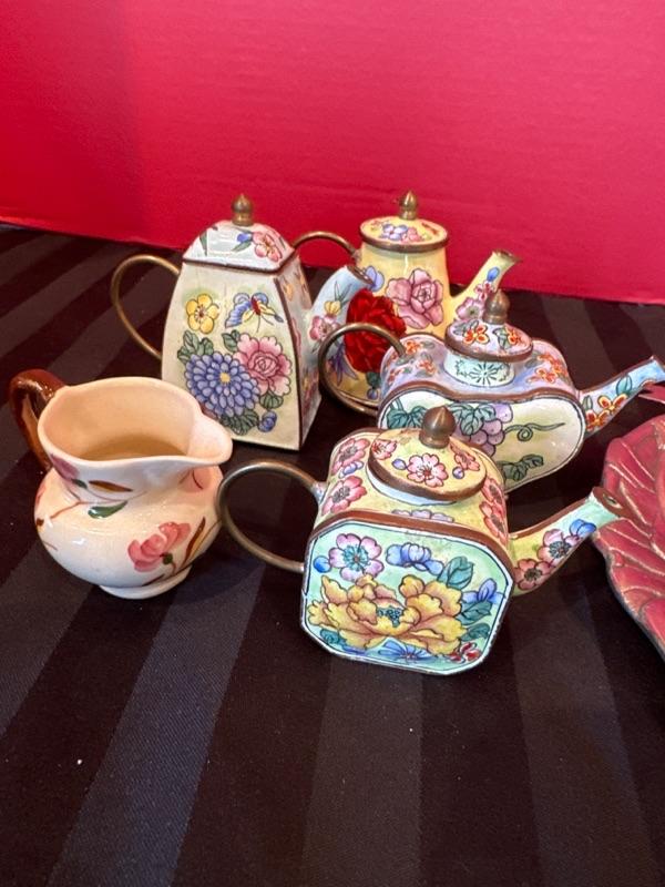 Miniature Enameled Floral Metal Tea Pot/Kettle,1 miniature hand painted pitcher,Arthur court 1990 plate,