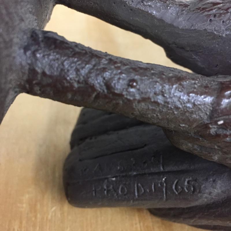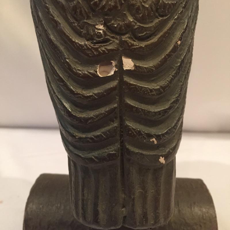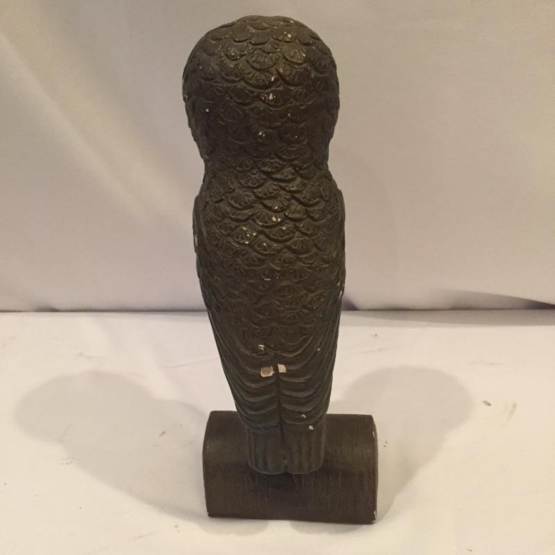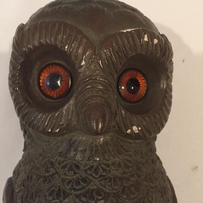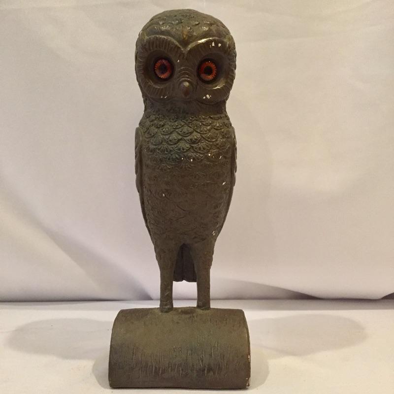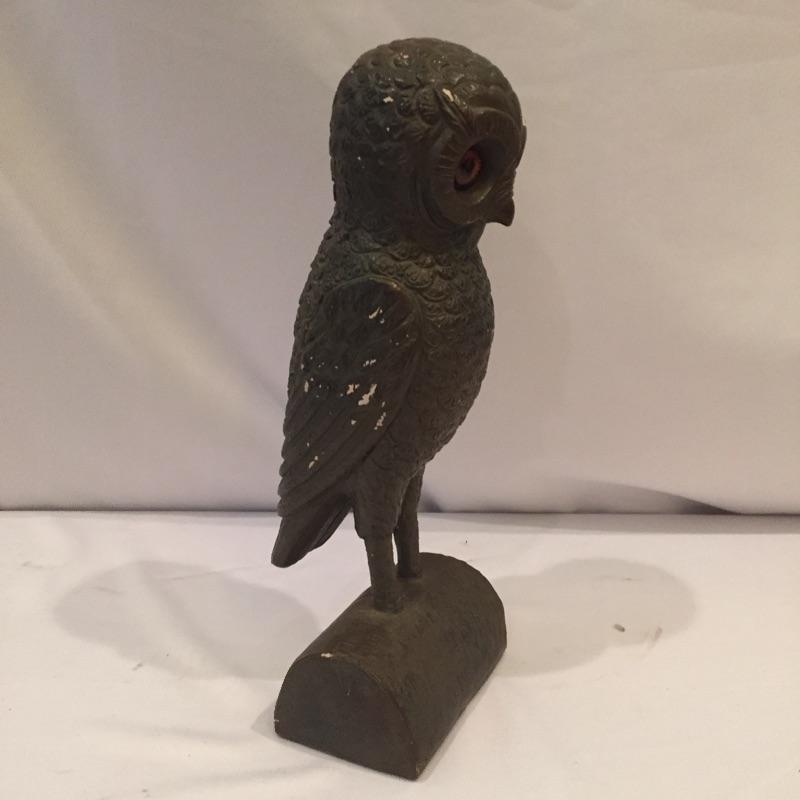 Nice and heavy, this owl statue is signed and dated. We read the last name as Hadding and the year 65, but we cannot verify that is correct. This gorgeous guy has mesmerizing orange glass eyes and standing at 14” high he makes for a nice door stop and outdoor decor piece. He does have some minor chips that could easily be painted and touched up, well worth a little bit of work to have this wise guy by your front door to welcome you home.