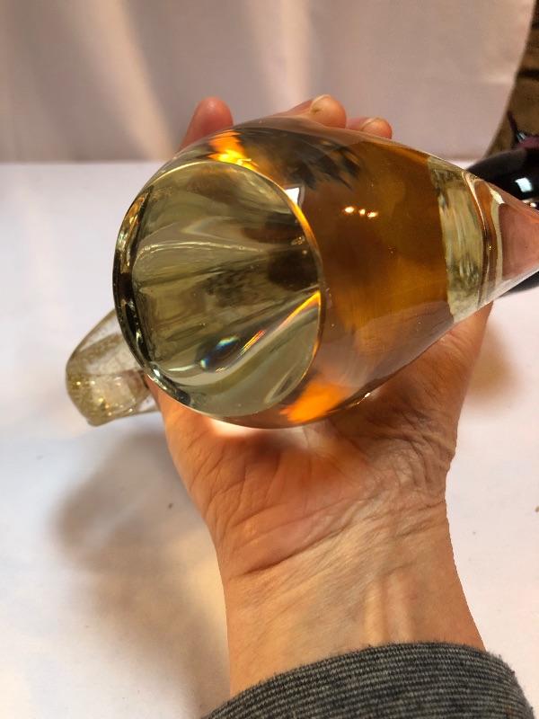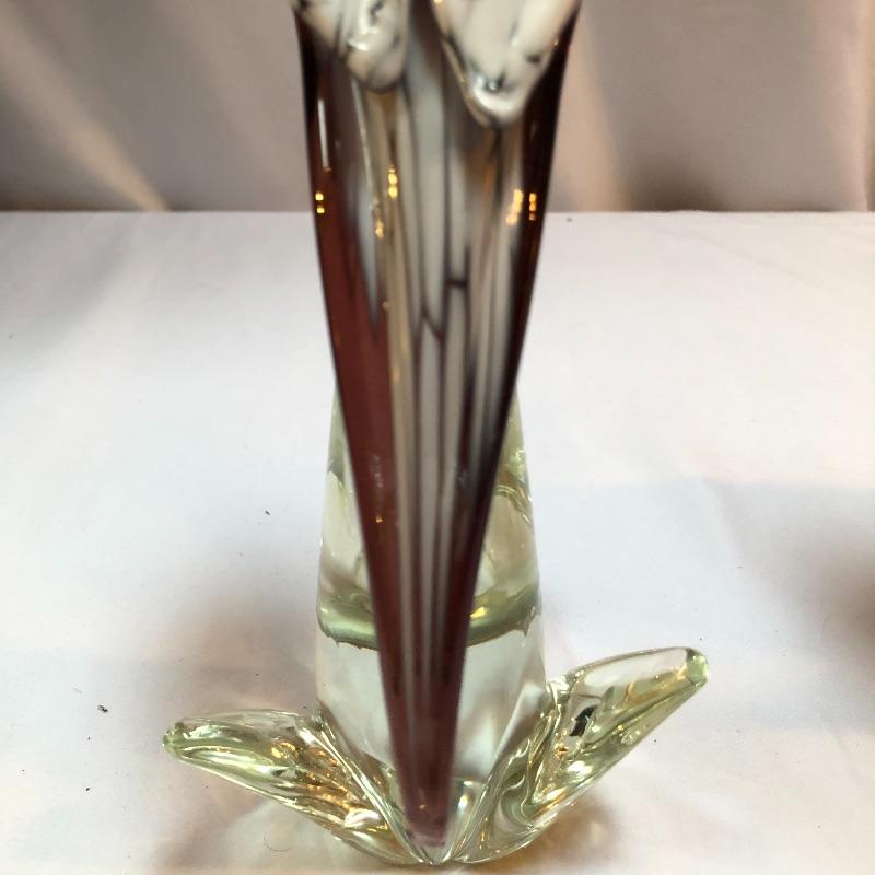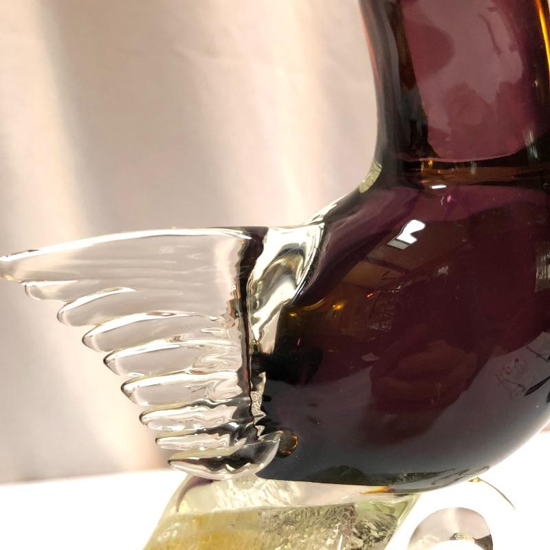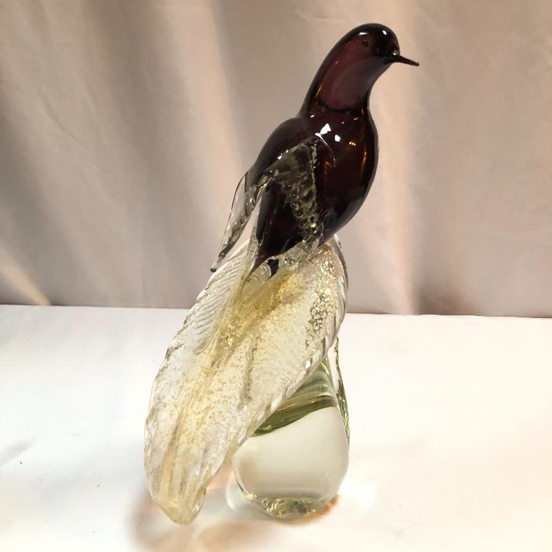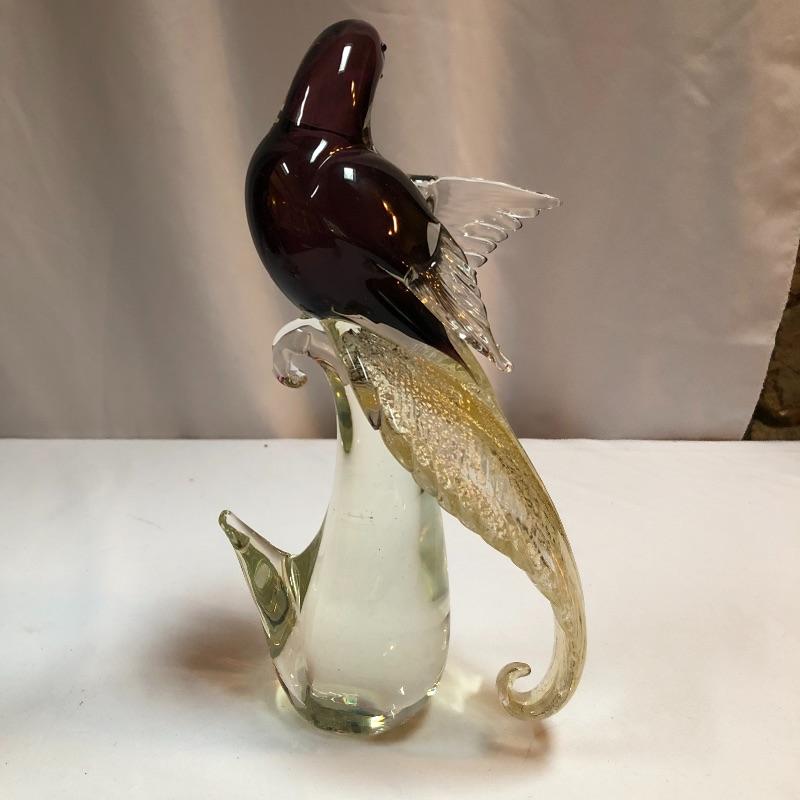 Di Murano but there are no makers stamps were found. The slightly larger bird is very similar to lots 129 & 131 with long tail. This tail is clear with gold colored speckles that catch the sunlight making this amethyst, clear and gold bird sparkle even more! The second bird is a similar amethyst color marbled with white. It has a clear beak and orange eyes and stunning overall. Taller bird measures 11” tall.