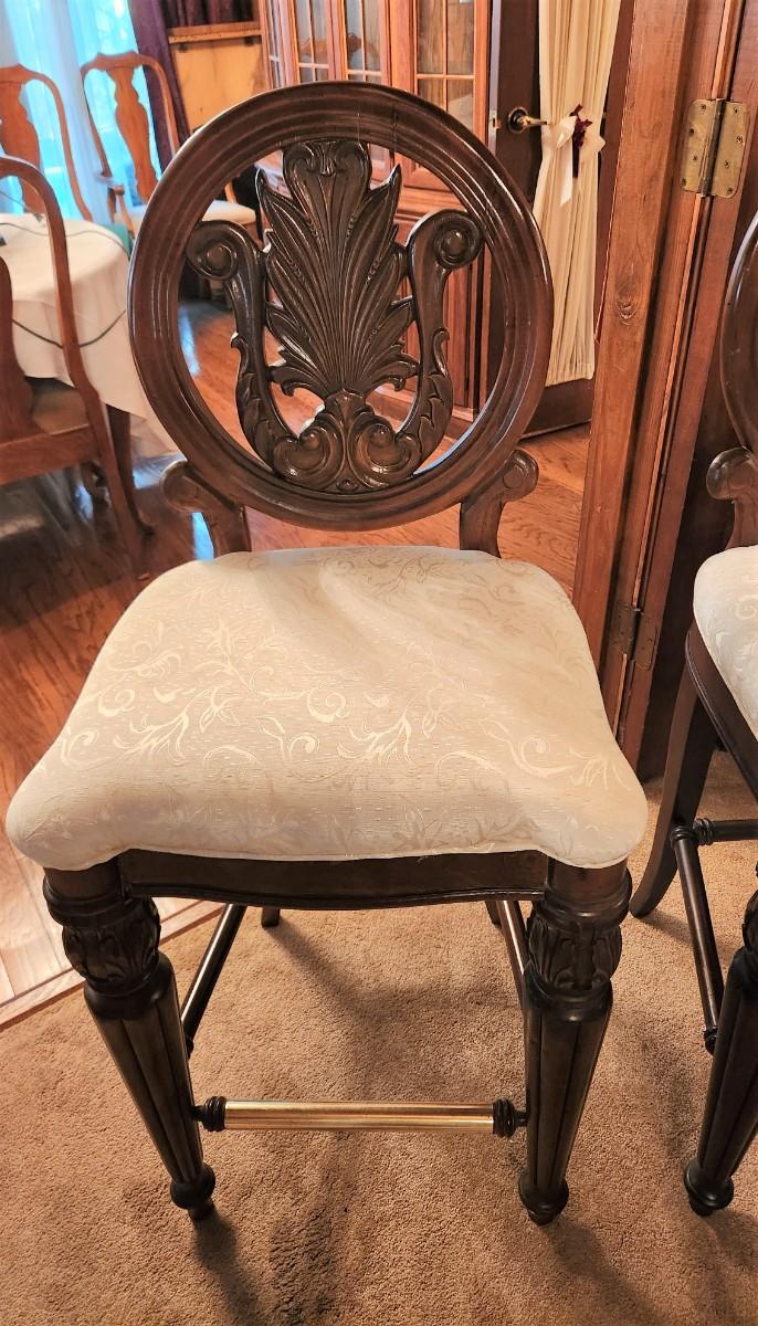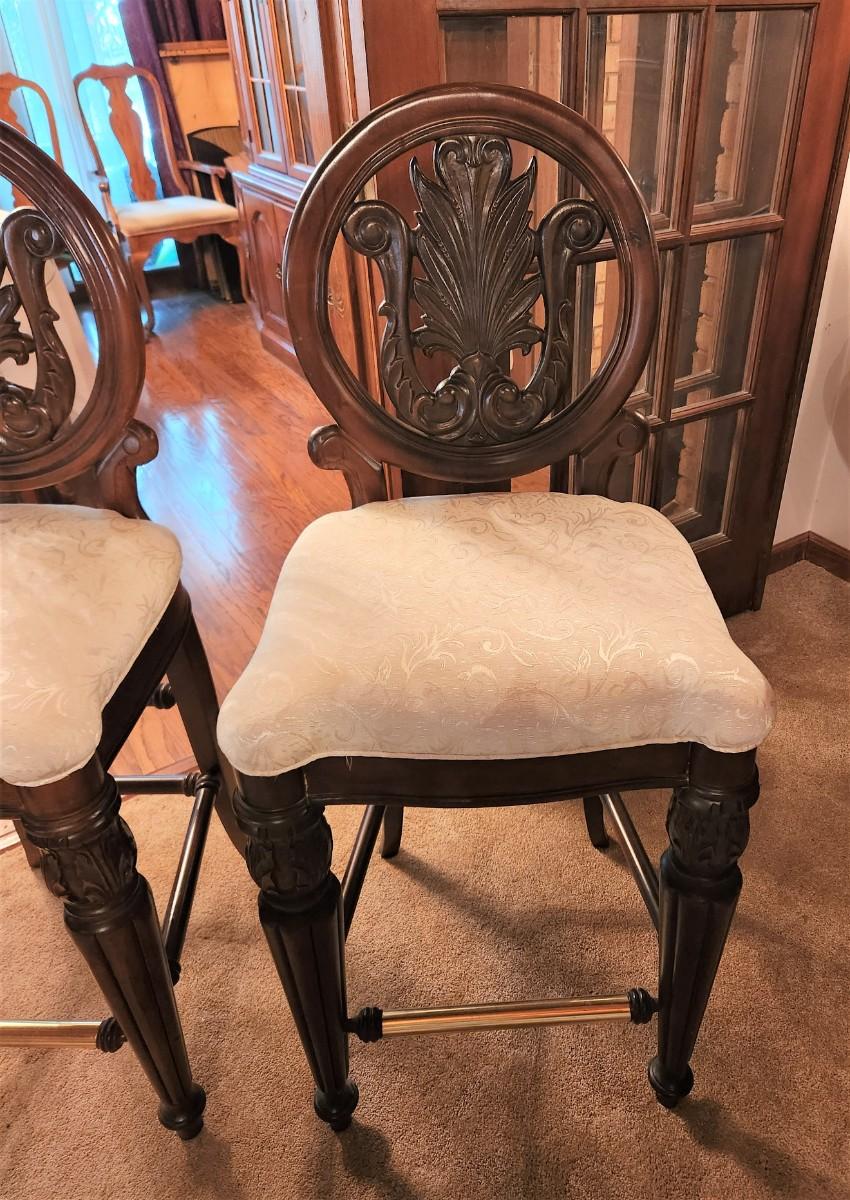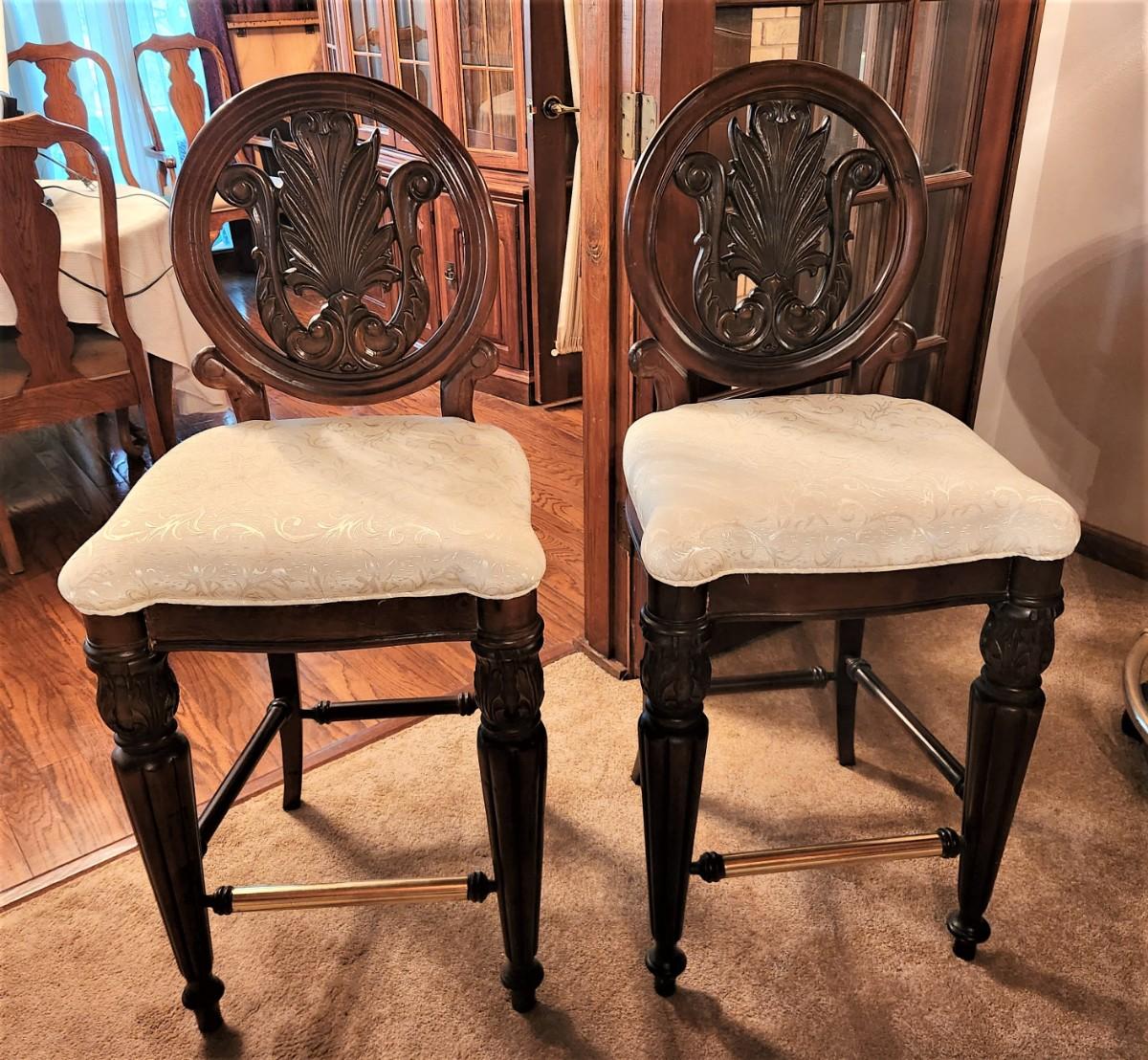 Super nice/clean pair of handsome contemporary barstools, brass footrest, no maker noted, 4 feet tall at the back, 21.5" across.