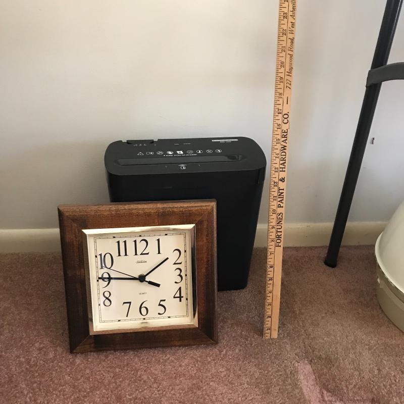 Quartz Sunbeam battery operated Wall clock, Shredder Essentials paper shredder and a Yard Stick from local Asheville paint and hardware store 1983. Lot is available for local pick up in Asheville, NC only.
