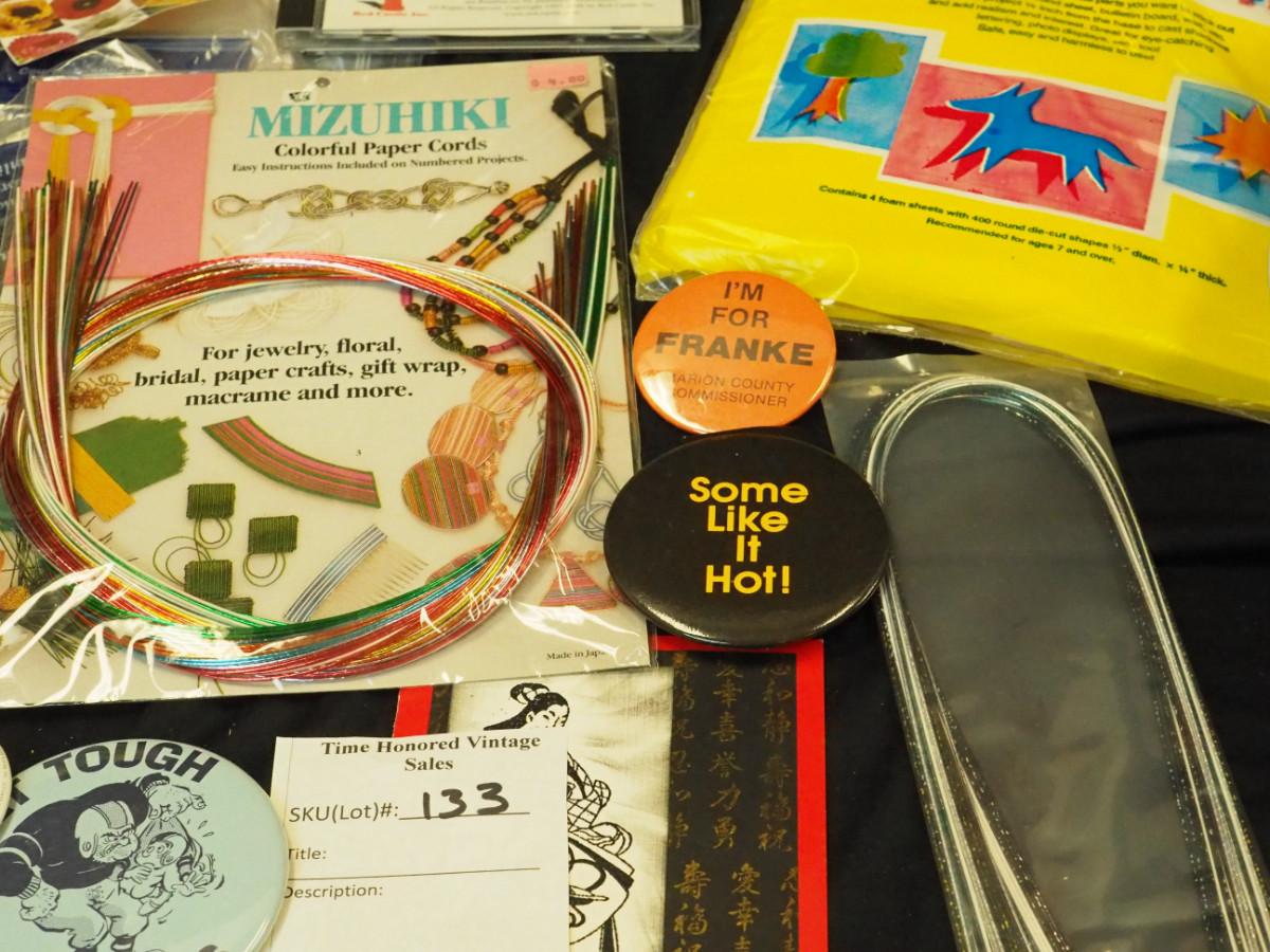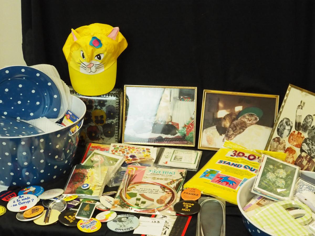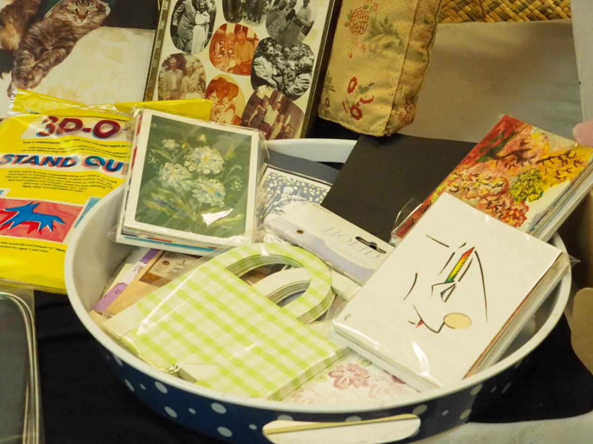 Lot 133: Picnic stack blue and white polka dot. Pansy card box, Cat pictures. Cat hat, Bag of label pins/buttons, new vintage greeting card packs, fancy Asian craft cords. Stickers.