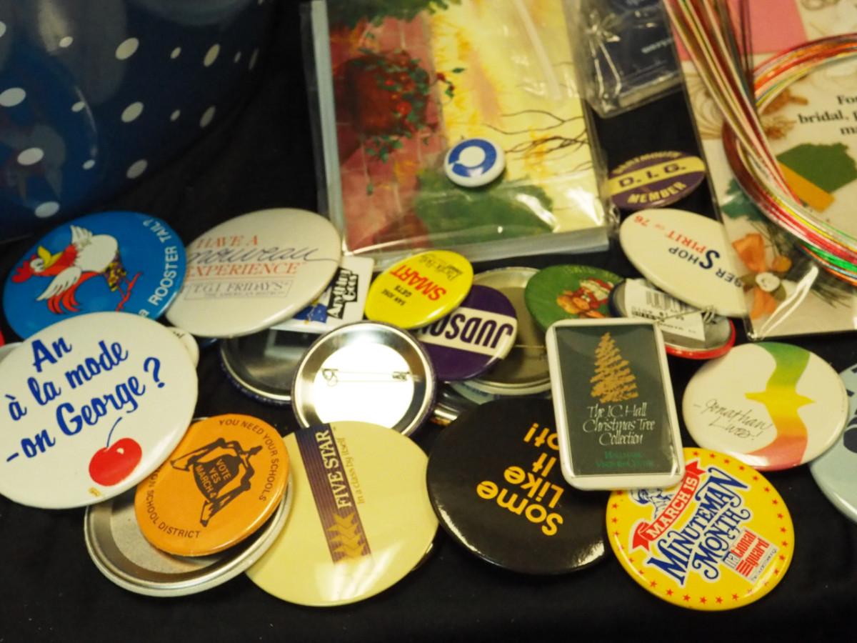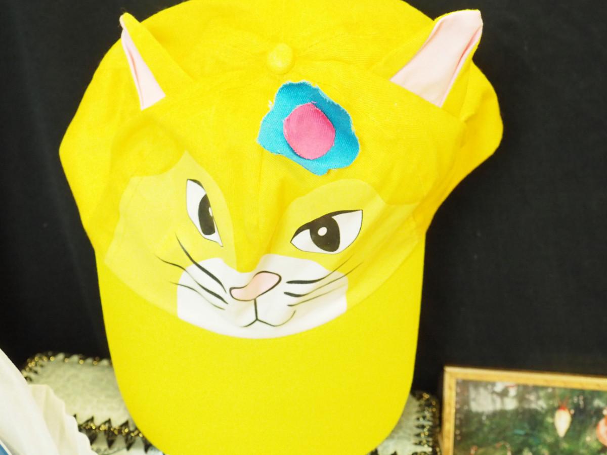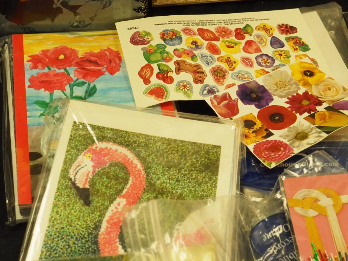 Lot 133: Picnic stack blue and white polka dot. Pansy card box, Cat pictures. Cat hat, Bag of label pins/buttons, new vintage greeting card packs, fancy Asian craft cords. Stickers.